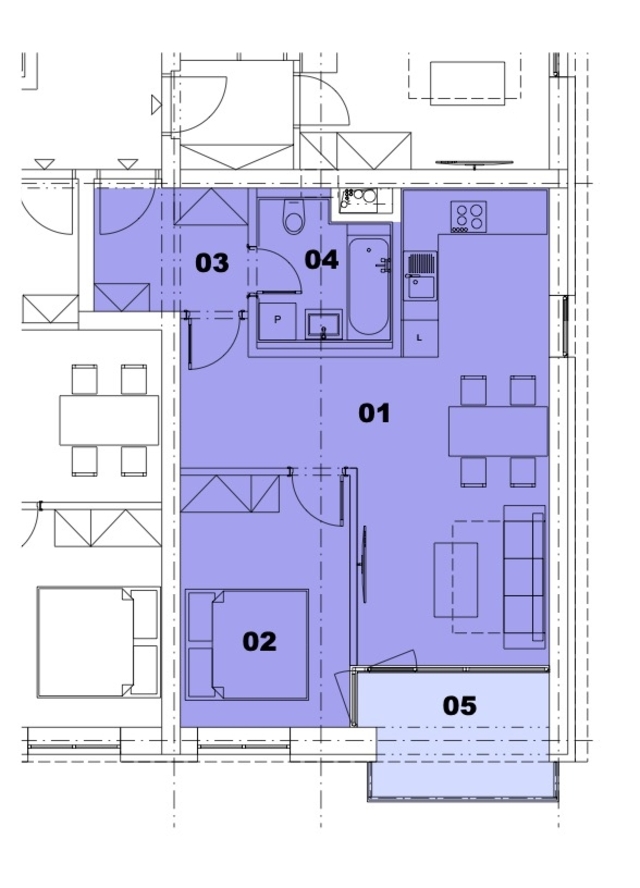 Bytová jednotka se nachází ve 3. nadzemním podlaží (z celkových 6) energeticky úsporné novostavby (třída B). Dispozice zahrnuje prostorný obývací pokoj s kuchyňským koutem, ložnici, předsíň a koupelnu s toaletou. Z obývacího pokoje i z ložnice je přímý vstup na lodžii.