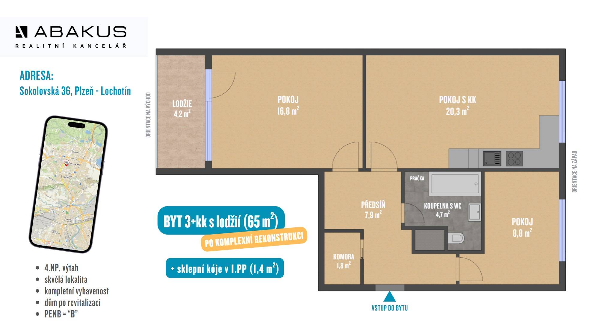 Rádi bychom vám představili naši exkluzivní nabídku - moderní byt 3+kk/L v jedné z nejoblíbenějších lokalit pro bydlení v Plzni – na Lochotíně. Tento byt nejenže nabízí skvělou dispozici, ale také prošel komplexní rekonstrukcí s důrazem na kvalitu provedení a moderní vzhled. Byt má celkovou výměru 65,4 m2 (60,3 m2 byt + 4,2 m2 lodžie + 1,4 m2 sklep. kóje) a nachází se ve 3. patře panelového domu v klidné ulici Sokolovská 36.
