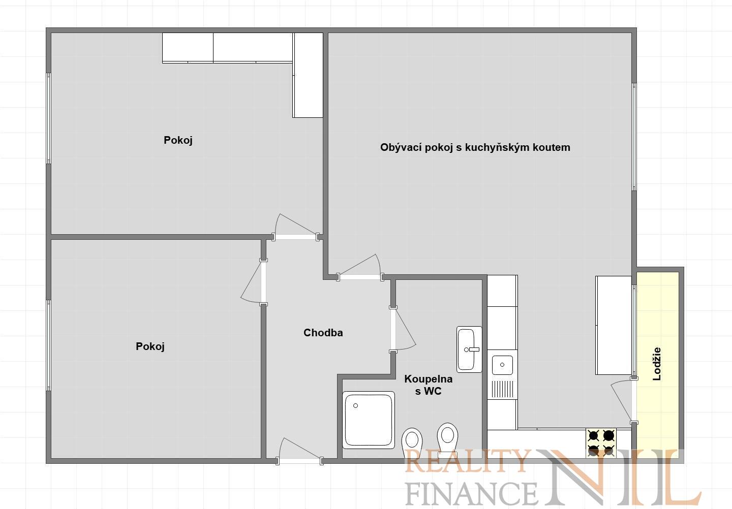 Byt se skládá z obývacího pokoje, na který navazuje kuchyně, dvou ložnic, koupelny a předsíně.