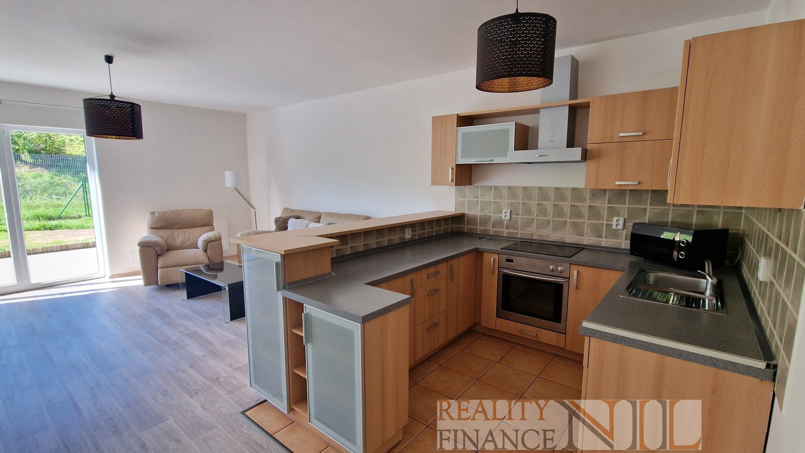 1 NP: prostorný obývací pokoj s kuchyňským koutem a výstupem na zahradu, garáž, WC, předsíň a schody do patra,