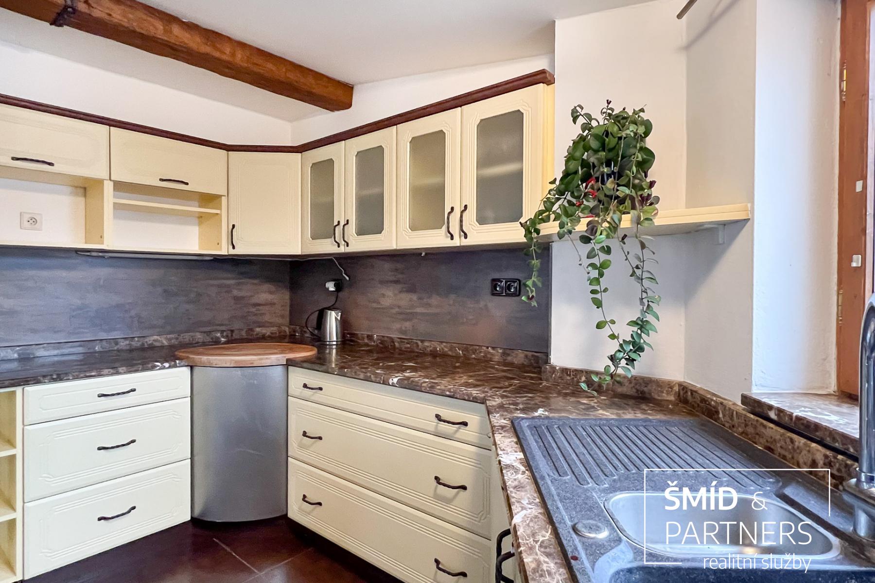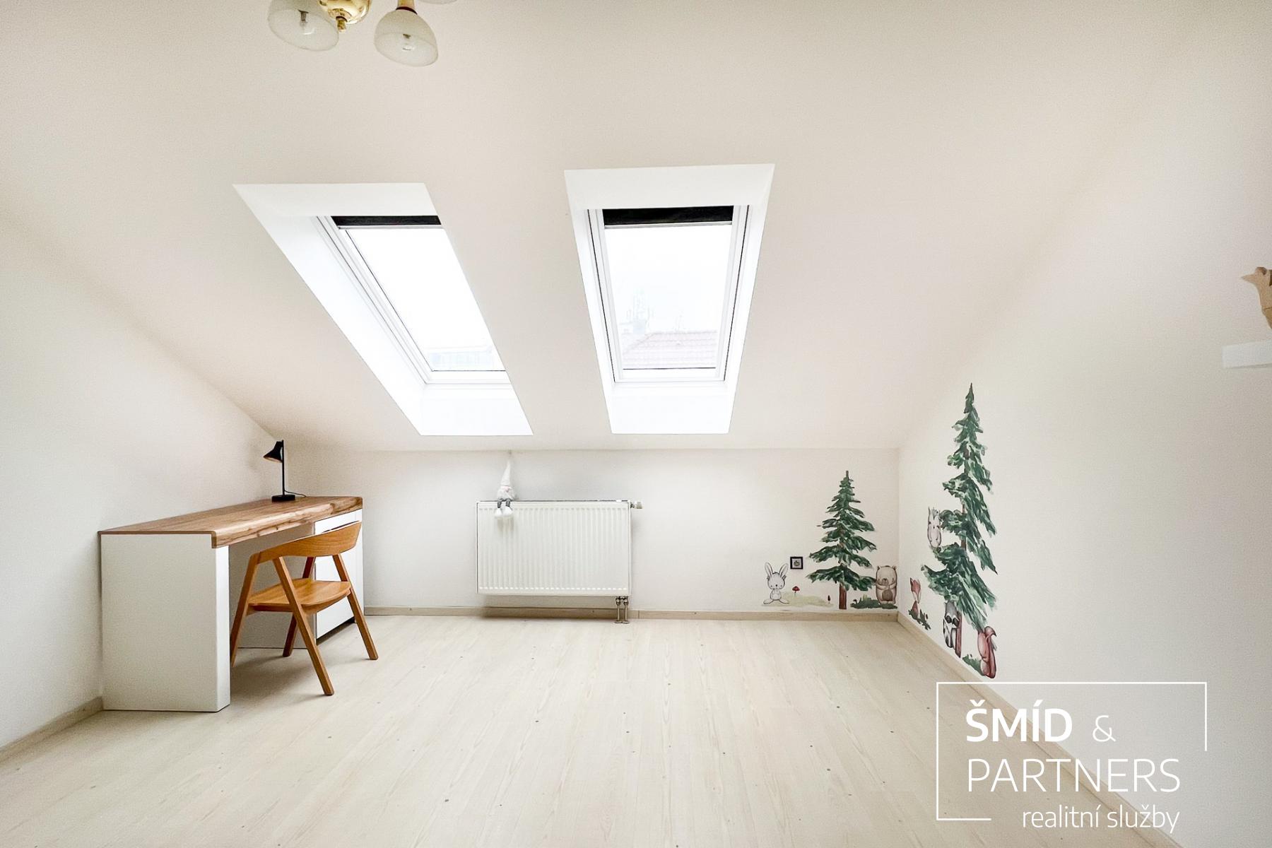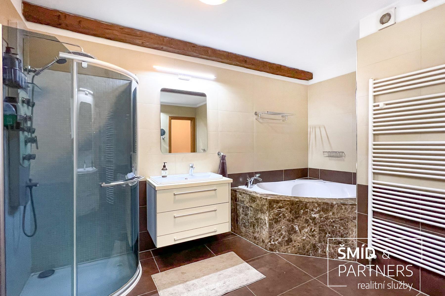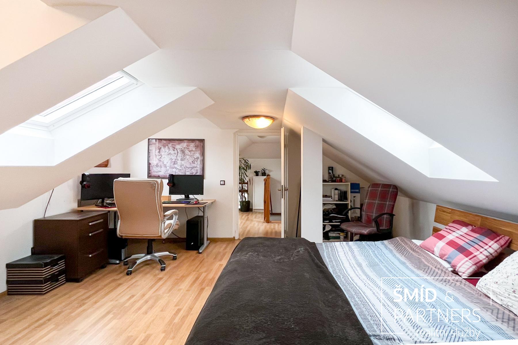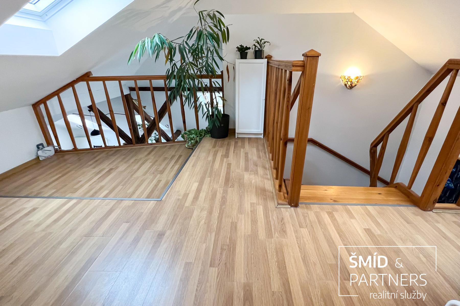 K bytu náleží užívání zastřešené 26 m2 velké terasy s grilovacím krbem. Dominantou bytu je více jak 110 m2 velká centrální místnost, která je dělená na kuchyňský kout, jídelnu, obývací část a halu. Kuchyňský prostor je spíše velkou kuchyní se středovým ostrůvkem, vlastním oknem, spíží a samostatným vstupem na terasu. Definici kuchyňského koutu naplňuje oddělením prostoru od jídelny zděným barem. Jídelní části dominuje prosklený výhled skrze široké dvoukřídlé dveře vedoucí na terasu. Obývací část opticky odděluje trámová konstrukce krovu a také snížená podlaha v této části. Za tímto prostorem v místech, kde již podlaha zase vystupuje, je kout se střešním oknem, knihovnou a vstupem do jedné z ložnic. Tato ložnice disponuje vlastním sociálním zařízením (sprchový kout, umyvadlo, toaleta). Tento pokoj je průchozí a pokračuje do další z ložnic s plochou vice jak 17 m2. Do poslední ložnice v tomto podlaží se vstupuje chodbou, ze které je také přístupna hlavní koupelna. Zadní ložnice o 15 m2 disponuje velkými šatnami a vlastním vchodem do hlavní koupelny. Koupelna je natolik prostorná, že je zde rohová vana i sprchový kout a dvě protilehle umístěná velkorysá umyvadla. Na koupelnu navazuje vstup do technické místnosti, kde jsou potřebná připojení na pračku a sušičku i dostatek prostoru pro nutné úklidové vybavení. V technické místnosti se nachází plynový kotel zn. Bosch, který je starý dva roky, s možností dálkového ovládáním chytrým telefonem. Zajišťuje vytápění i ohřev TUV. Z haly pak vede dřevěné točité schodiště do mezonetové části s galerií a ložnicí. Tento pokoj je mino střešních oken prosvětlen také dvojící vikýřů opatřených elektrickými předokenními žaluziemi.