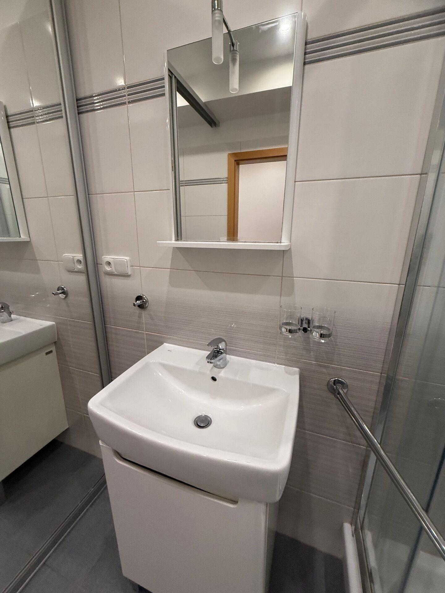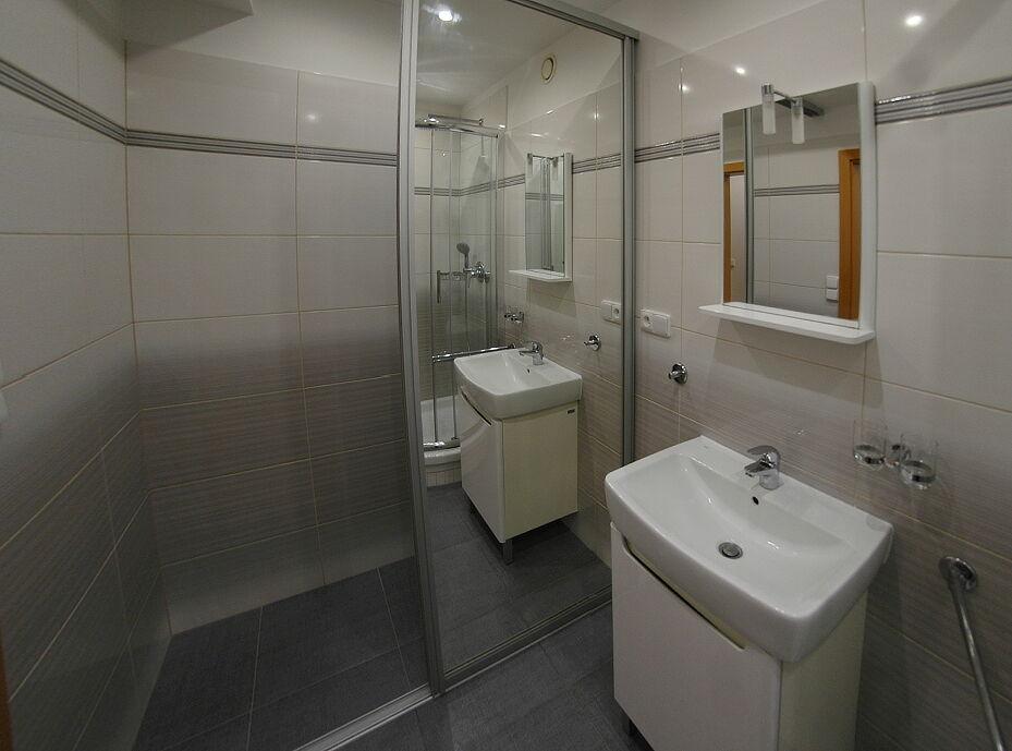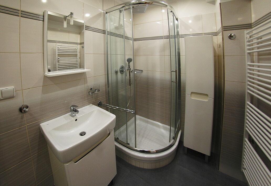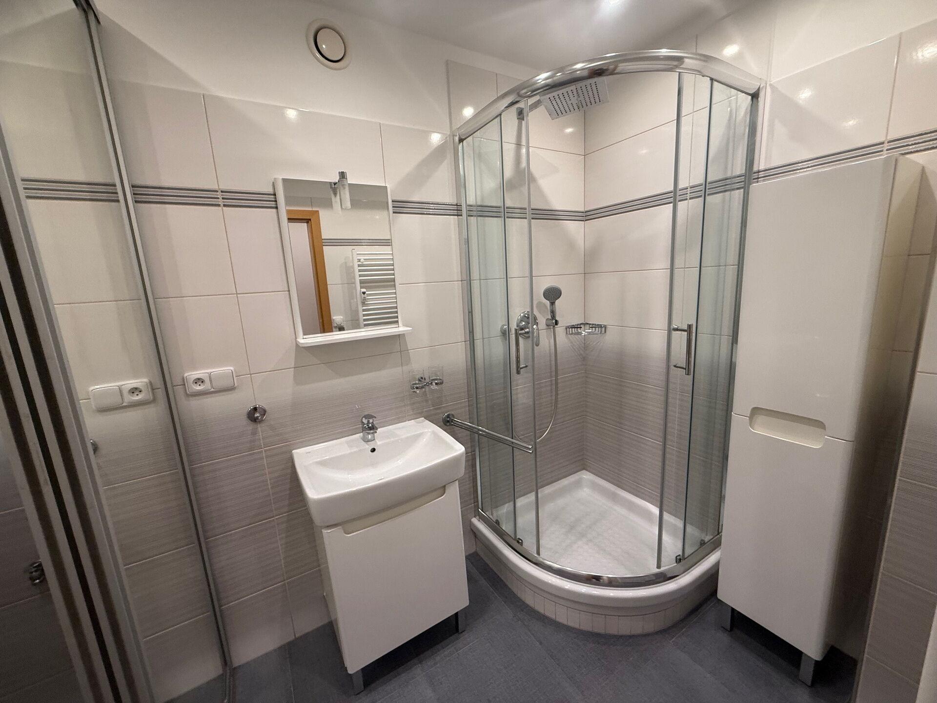 LUXUSNÍ KOUPELNA: Prostorná koupelna se sprchovým koutem, umyvadlovou skříňkou a další samostatnou skříní pro dostatek úložného prostoru. Bonusem je elektrické podlahové vytápění.