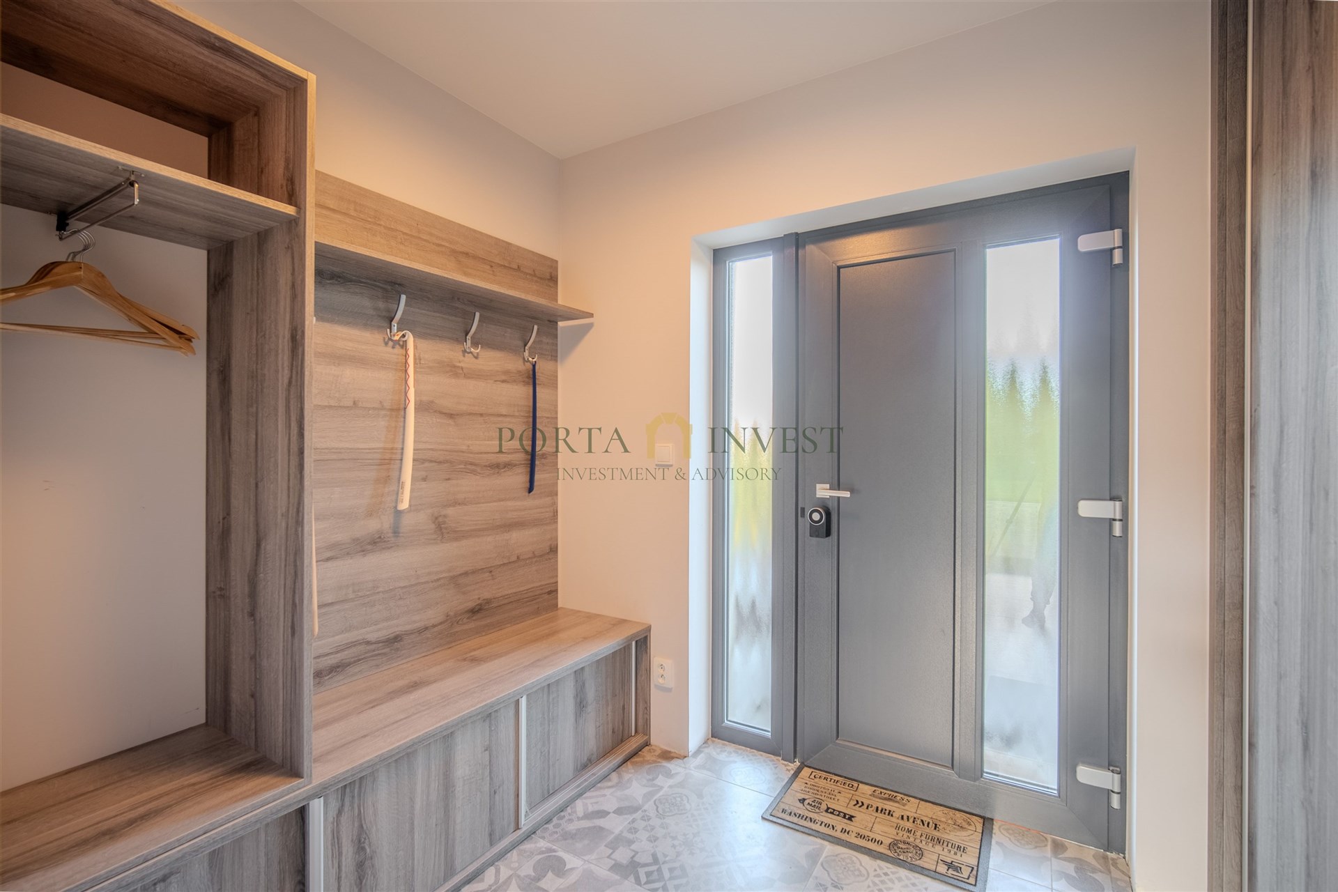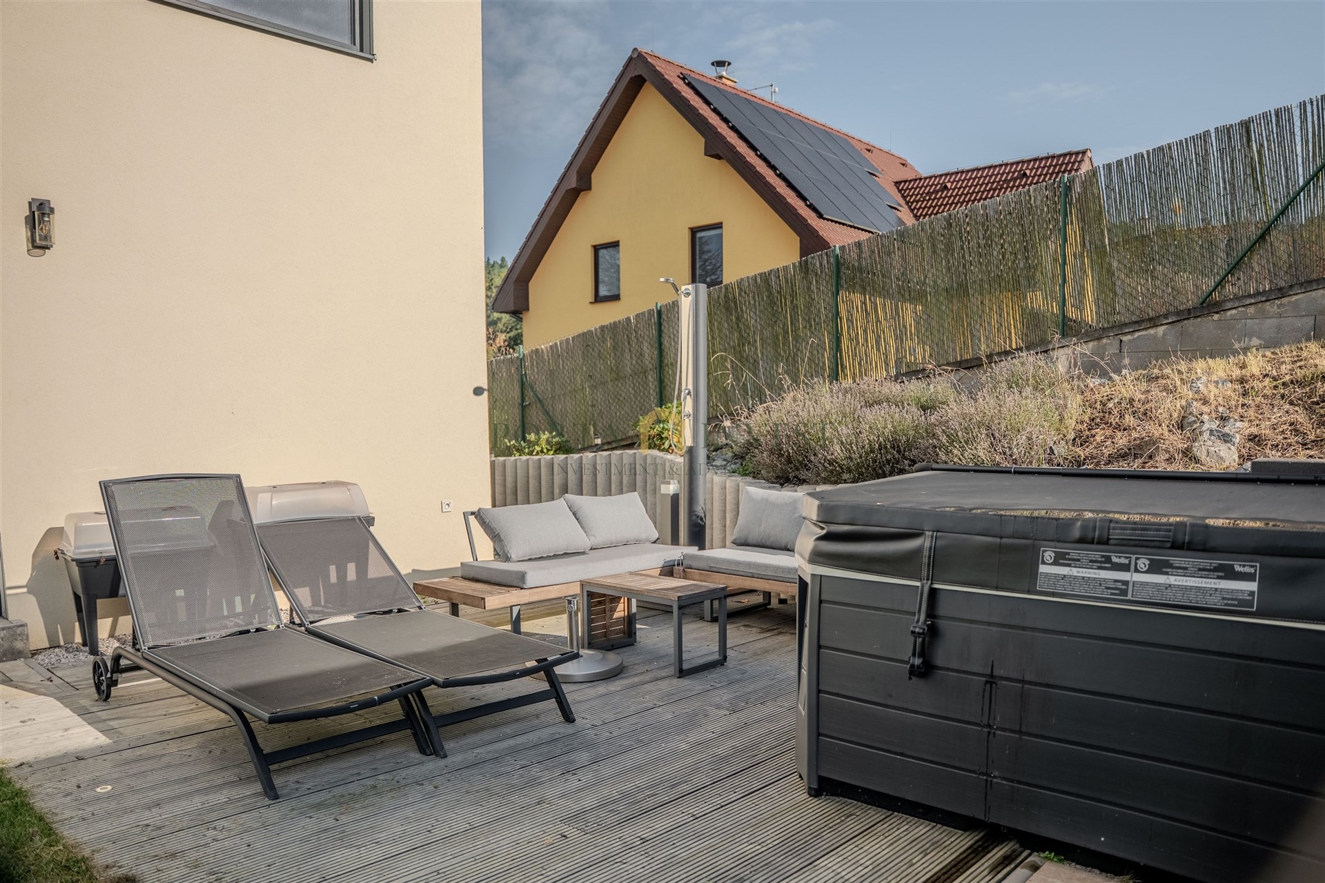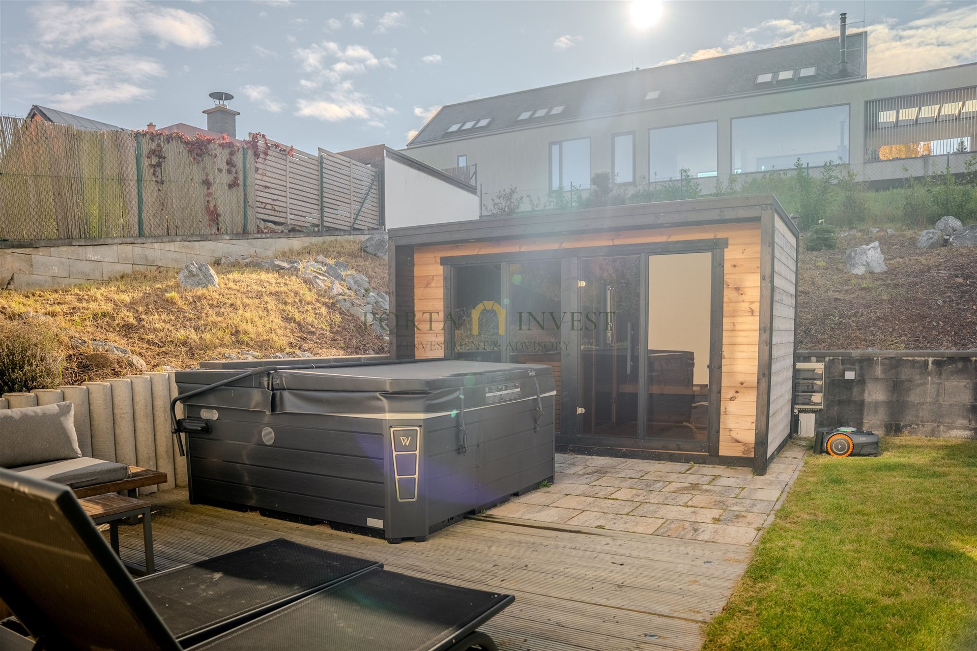 Velmi příjemné klima v celém domě vytváří hliníková okna s trojskly a elektrickými předokenními roletami, dřevěná plovoucí podlaha a stylová dlažba. Do každé obytné místnosti je rozveden internet. Dům je vytápěn efektivním elektrickým podlahovým topením se samostatnou regulací jednotlivých místností, v obývacím pokoji je provedena příprava pro instalaci krbu. Na terase domu (kam lze vstoupit z každé přízemní obytné místnosti) se nachází jak zastíněná pergola, tak i další relaxační prostor s venkovní saunou, vířivkou a sprchou. Zahrada je zde především k odpočinku (automatické sekání trávníku, závlaha). K dispozici je zahradní domek na nářadí a techniku, vkusně upravené kamenné svahy jsou osázeny zelení. Přímo na pozemku se nachází dvě parkovací stání, další stání je na vlastním neuzavřeném pozemku přímo před domem. Celý dům je zabezpečen kamerovým systémem.