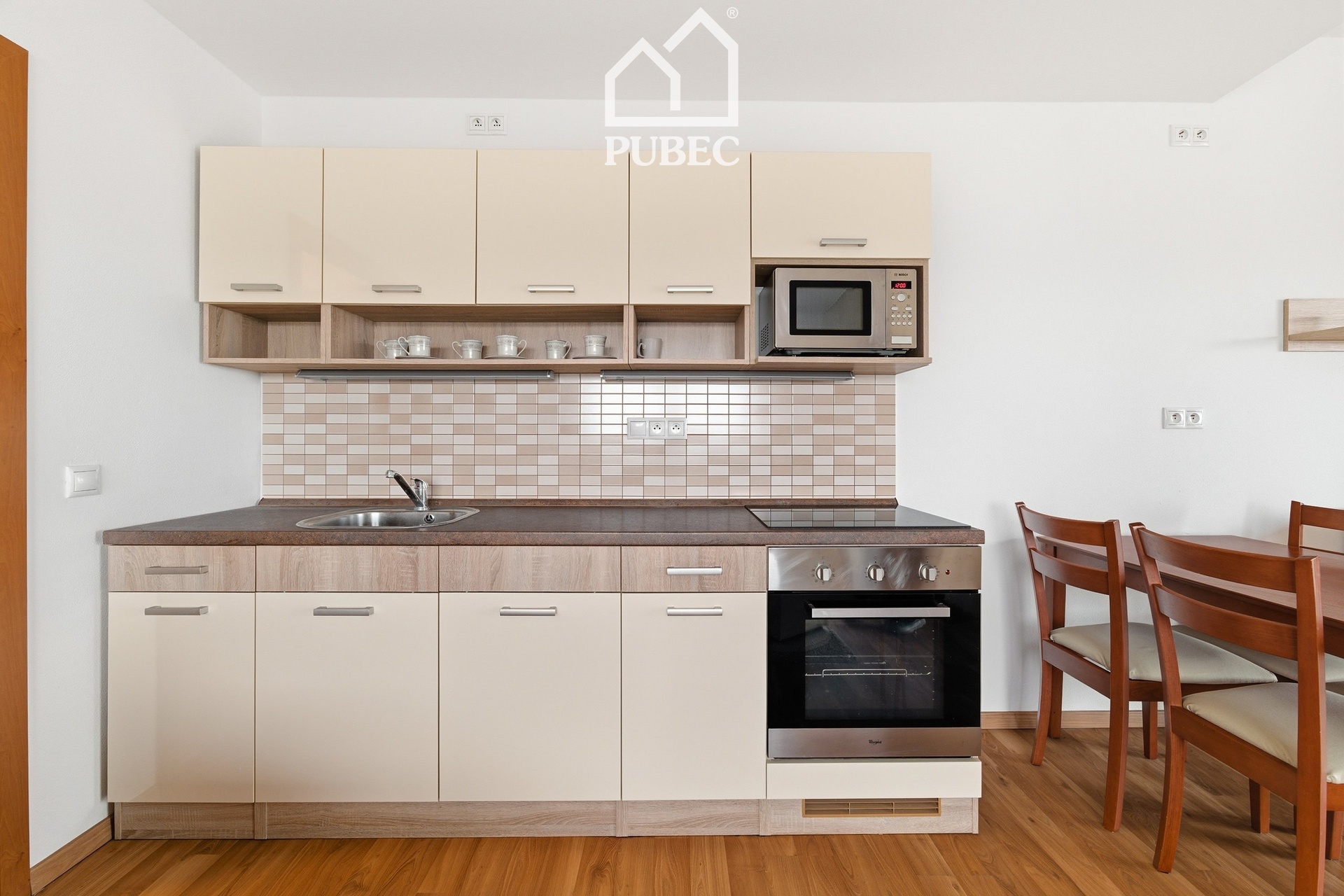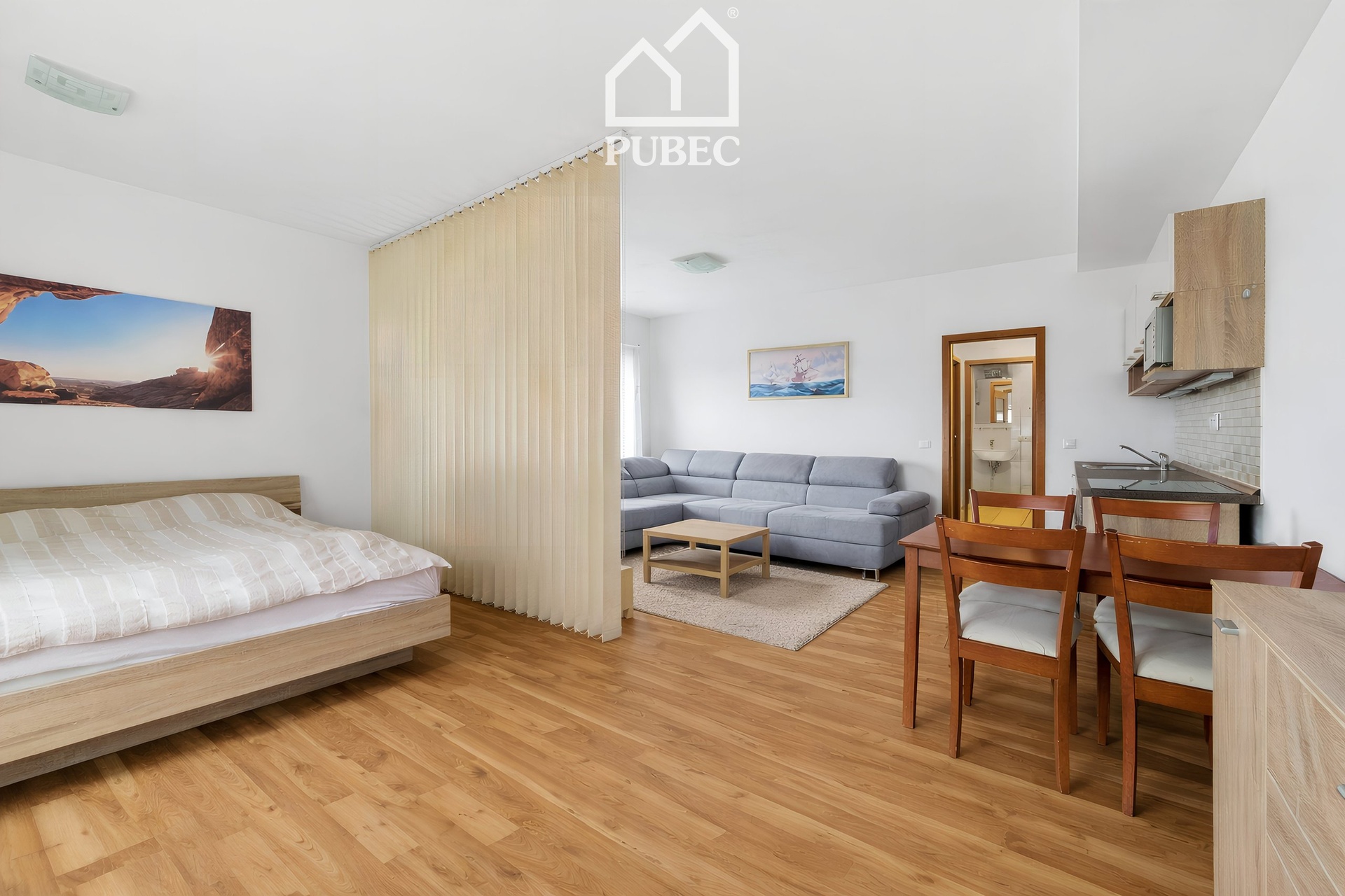 • prostorný pokoj rozdělený na obývací část s kuchyňským koutem a klidovou zónu ložnice s pracovnou