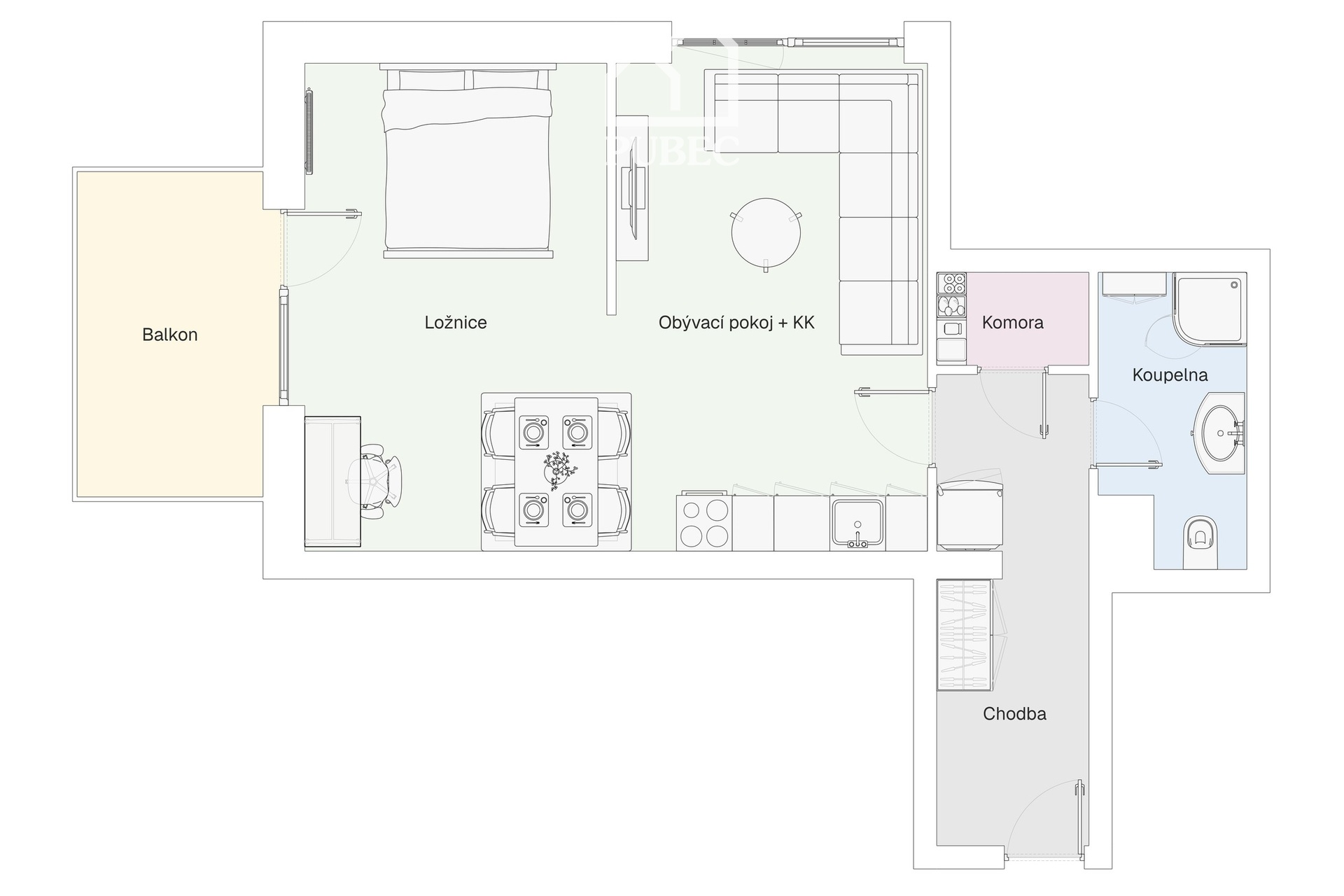 Byt byl původně projektován jako 2+kk, avšak pevná příčka nebyla realizována. Díky tomu vznikl velkorysý otevřený prostor, který je prakticky a elegantně členěn pomocí vertikálních žaluzií – byt tak opticky i funkčně působí stále jako 2+kk. Pro zájemce, kteří preferují klasické dispoziční řešení, je vybudování příčky velmi jednoduchou záležitostí – technicky nenáročný zásah, který lze realizovat rychle a bez složitých stavebních úprav.