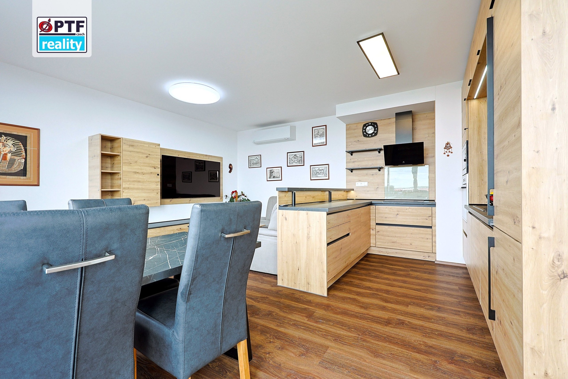 Obývák s kuchyní tvoří jeden volný prostor – dost velký na to, abyste dýchali, dost intimní na to, aby to byl domov. Kuchyně Senesi je na místě, spotřebiče běží, podlahové topení hřeje. Nepřicházíte do rozestavěného bytu, kde tři měsíce něco dodělávate. Přijdete, odložíte kufr a jste doma.