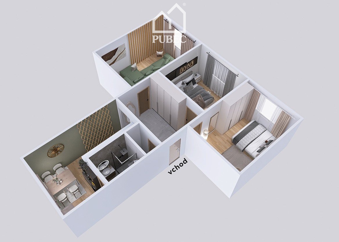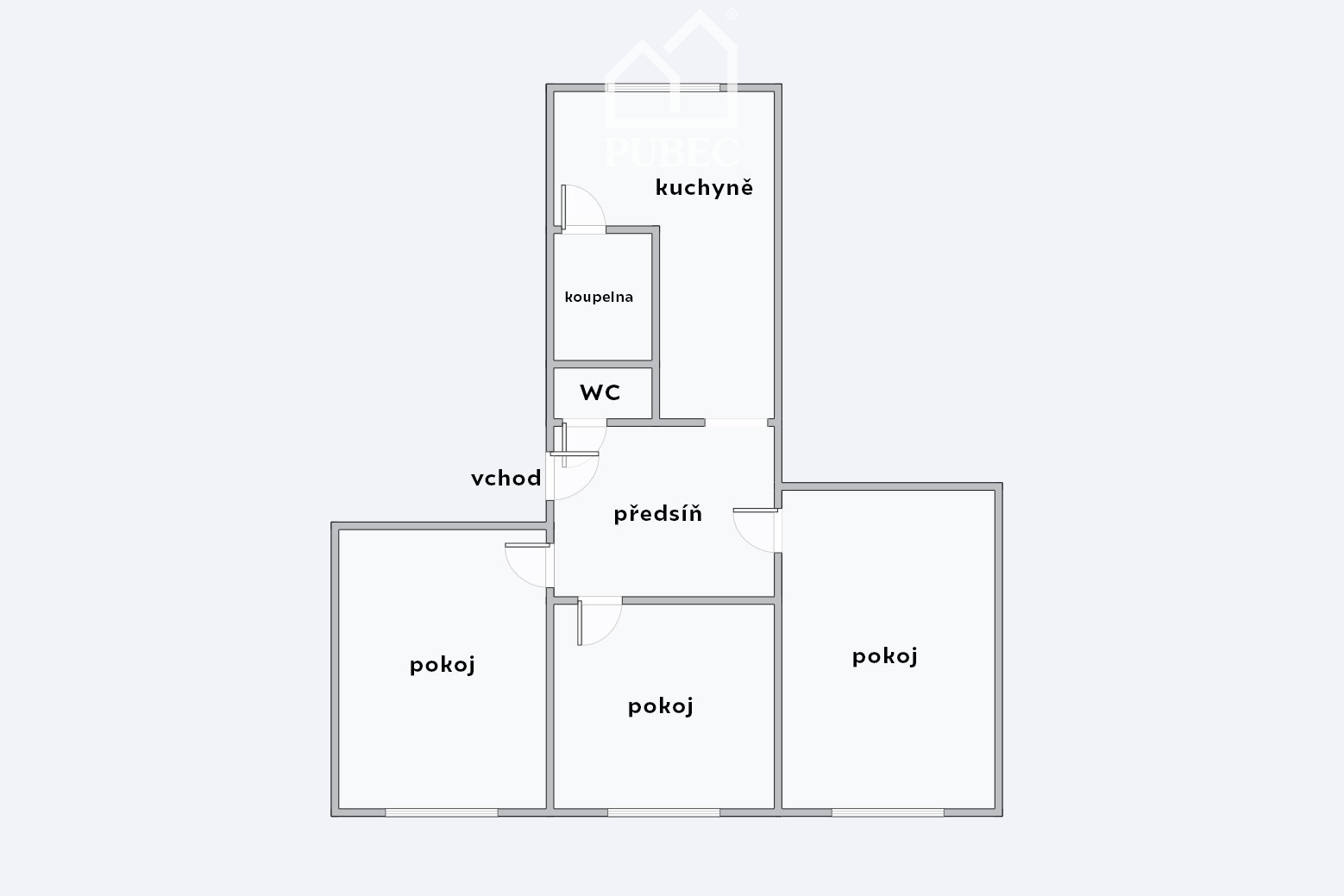 Praktická dispozice: Byt má velmi logické uspořádání – 3 neprůchozí pokoje, které jsou přístupné z centrální předsíně, což zajišťuje maximální soukromí všech členů domácnosti.