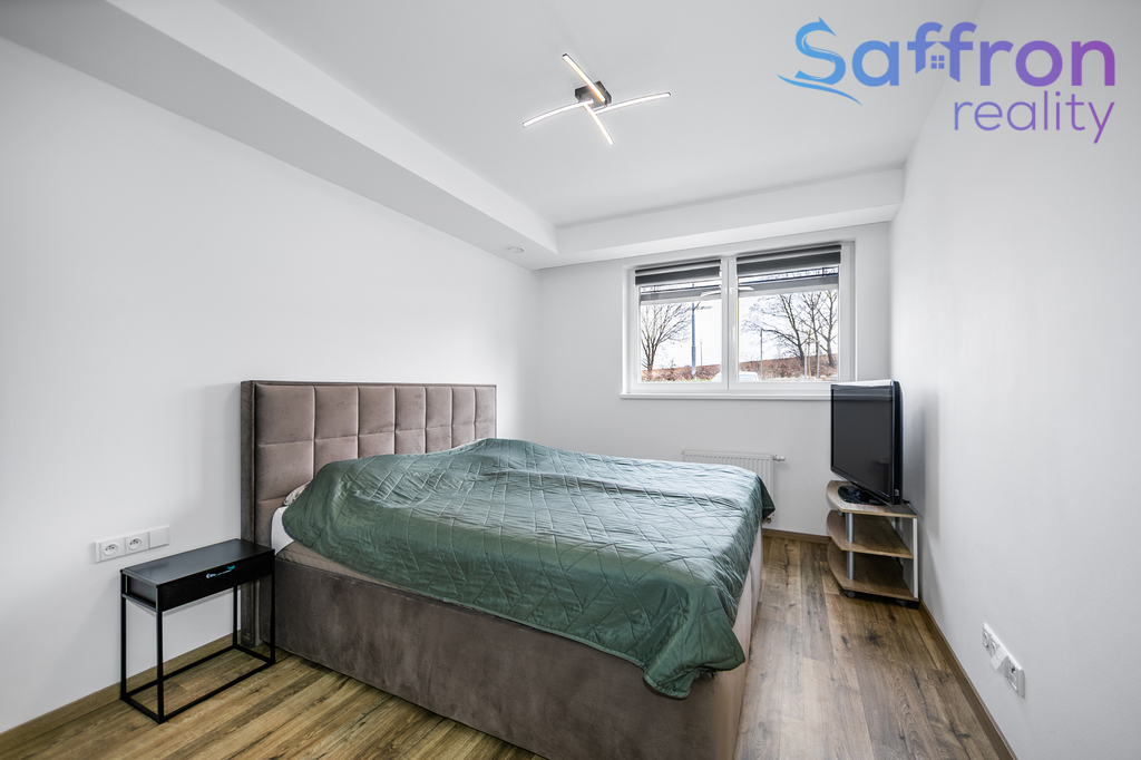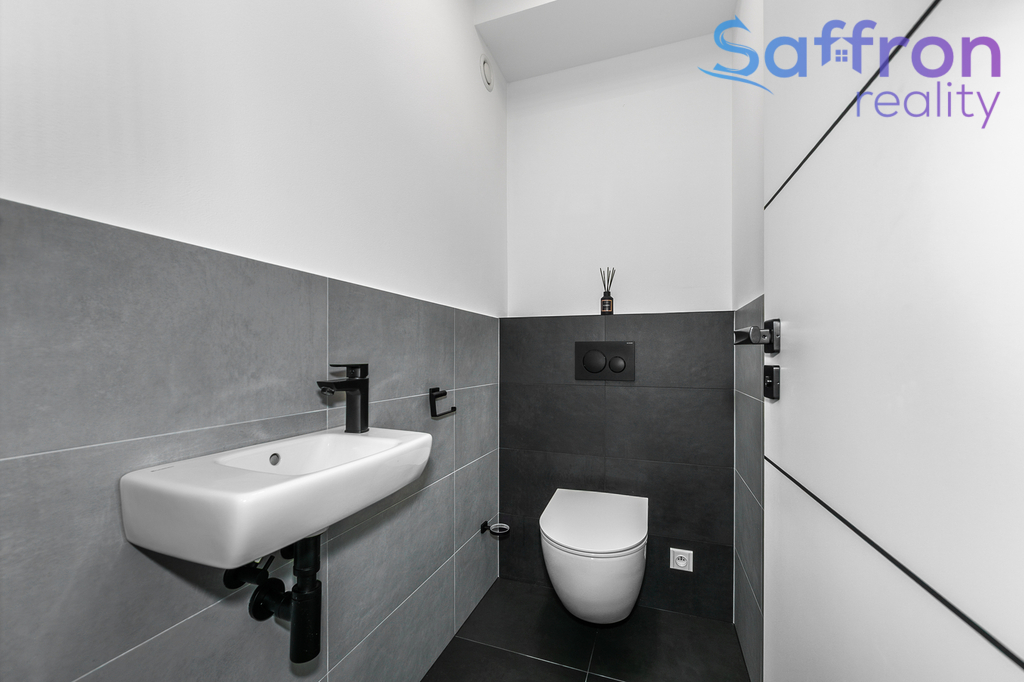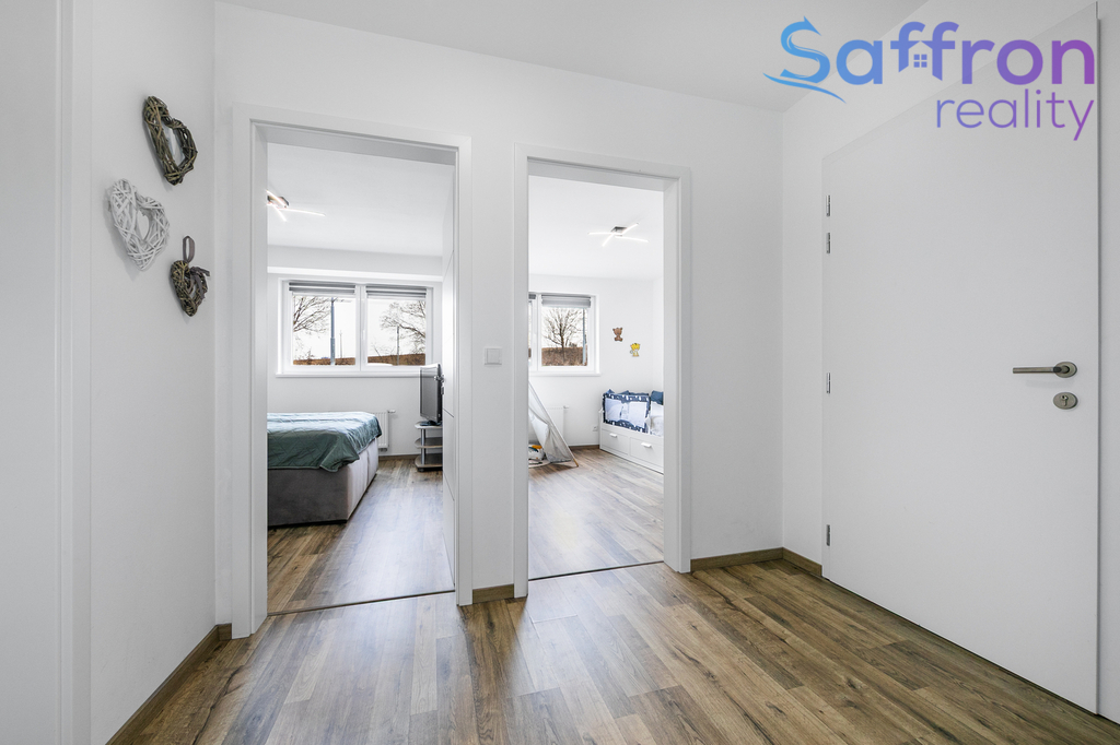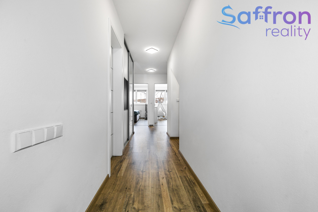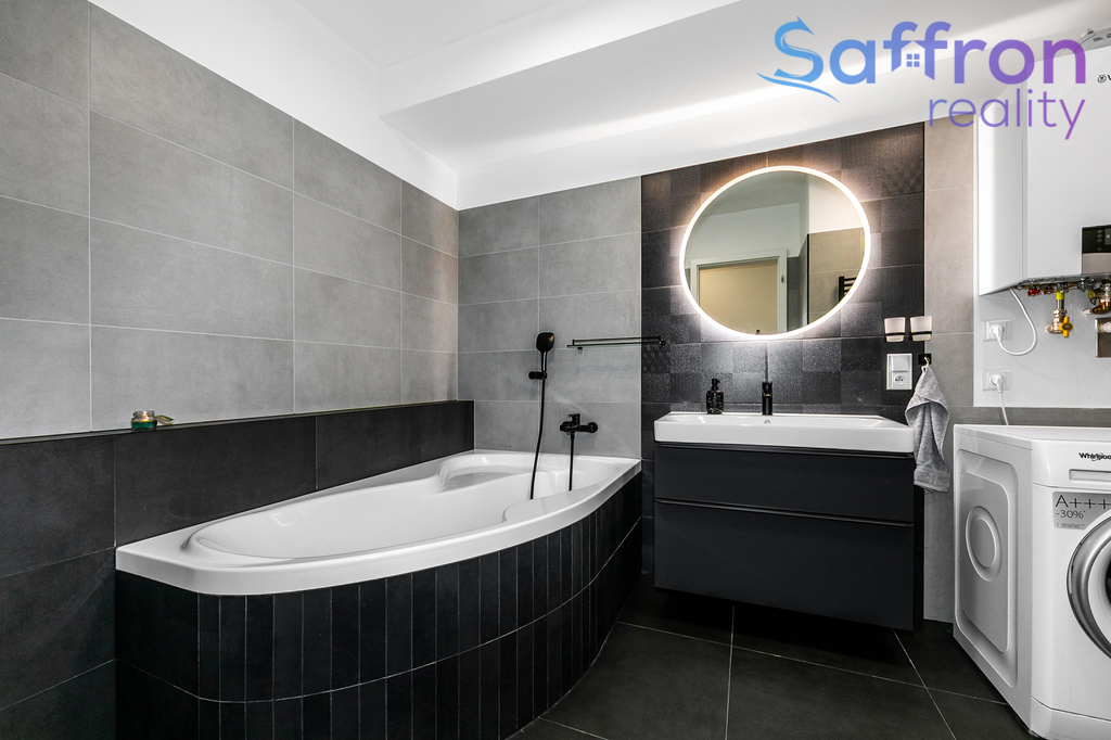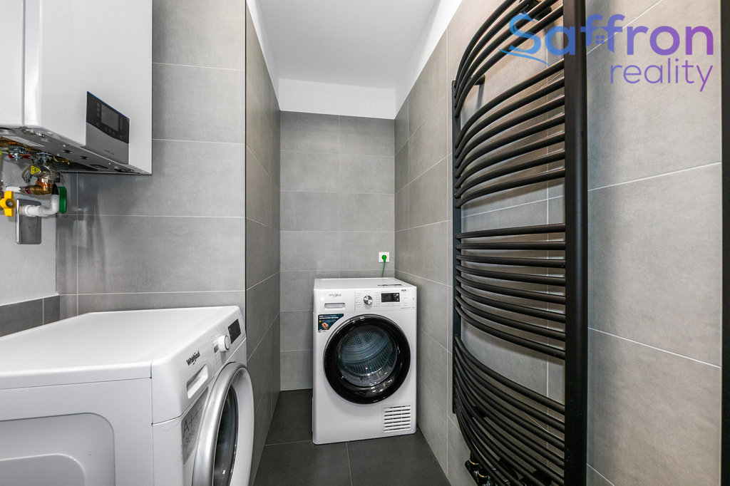 Dispozice bytu je velmi praktická a promyšlená. Kromě hlavního obytného prostoru zde najdete samostatnou ložnici a další pokoj, který může sloužit jako dětský pokoj, pracovna nebo pokoj pro hosty. Koupelna je řešena moderně s vanou, designovým osvětlením a dostatkem prostoru pro pračku i sušičku. Výhodou je také samostatná technická místnost, která poskytuje další úložný prostor a zvyšuje celkový komfort bydlení. K bytu náleží parkovací místo přímo u vchodu do domu, což výrazně zpříjemňuje každodenní fungování.