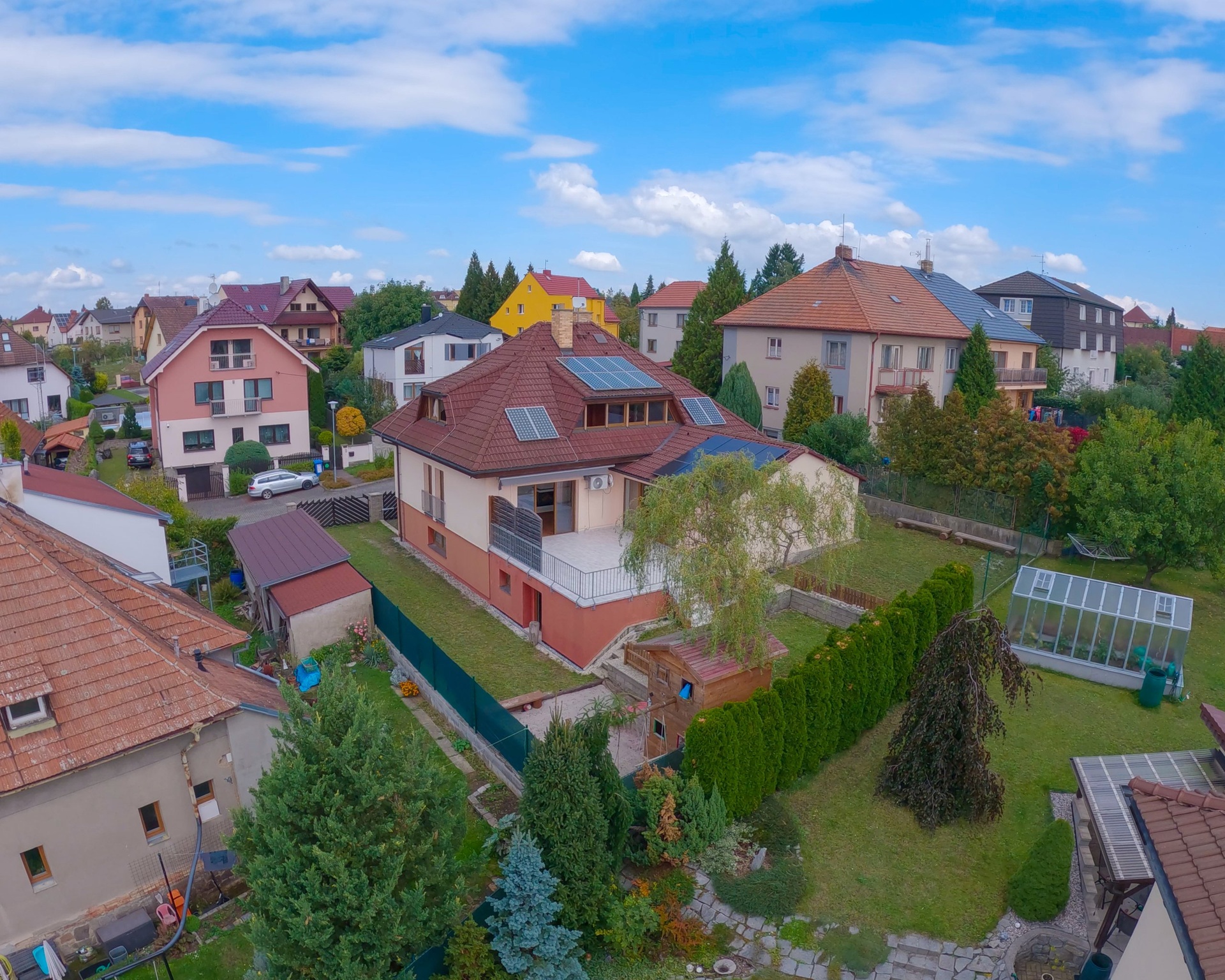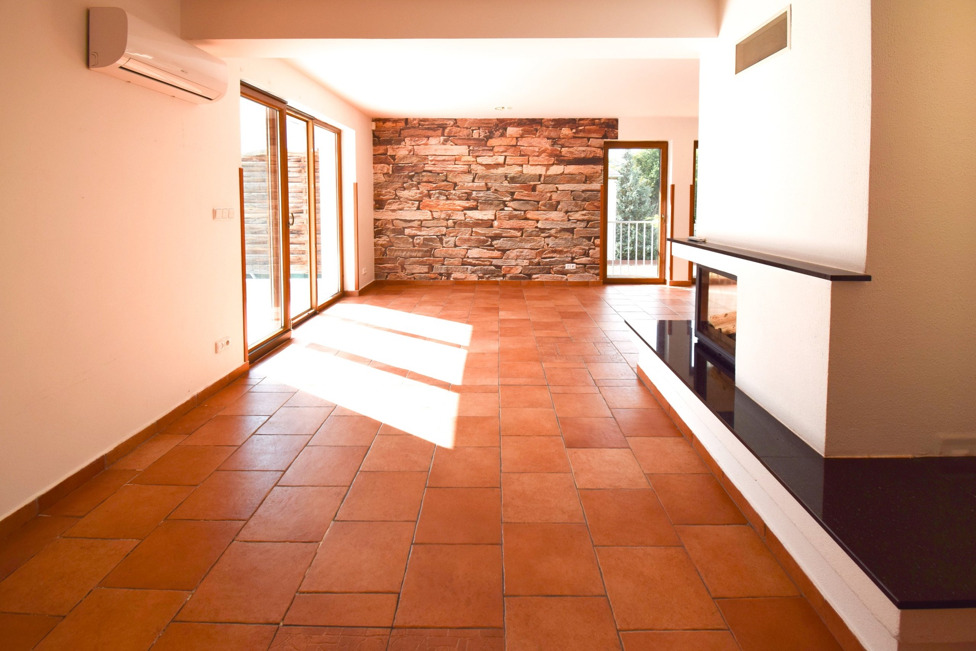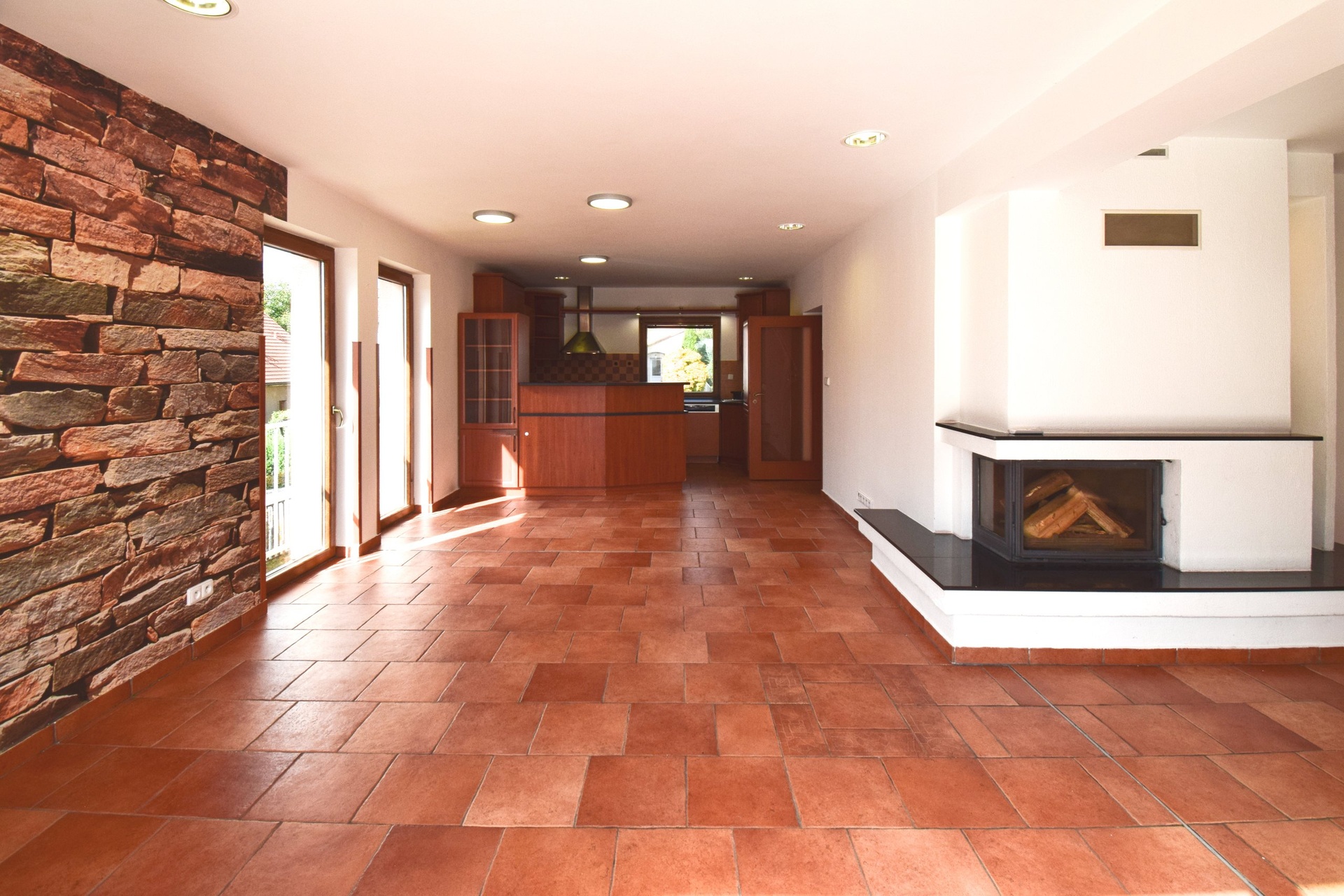 Krbová kamna nejen pro dlouhé zimní večery dodávají obývacímu prostoru nádech příjemné domácí atmosféry. Navazující prostor bazénu za prosklenými dveřmi je pak už jen třešinkou na dortu. Z bazénu můžete pohodlně vstoupit na terasu, přičemž zde máte naprosté soukromí. Privátní prostory domu jsou důmyslně ukryty před zvědavými zraky sousedů i kolemjdoucích.