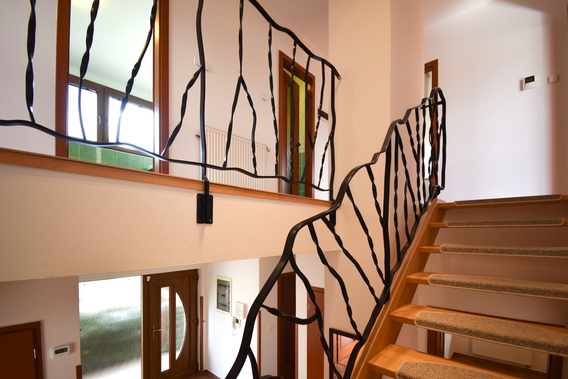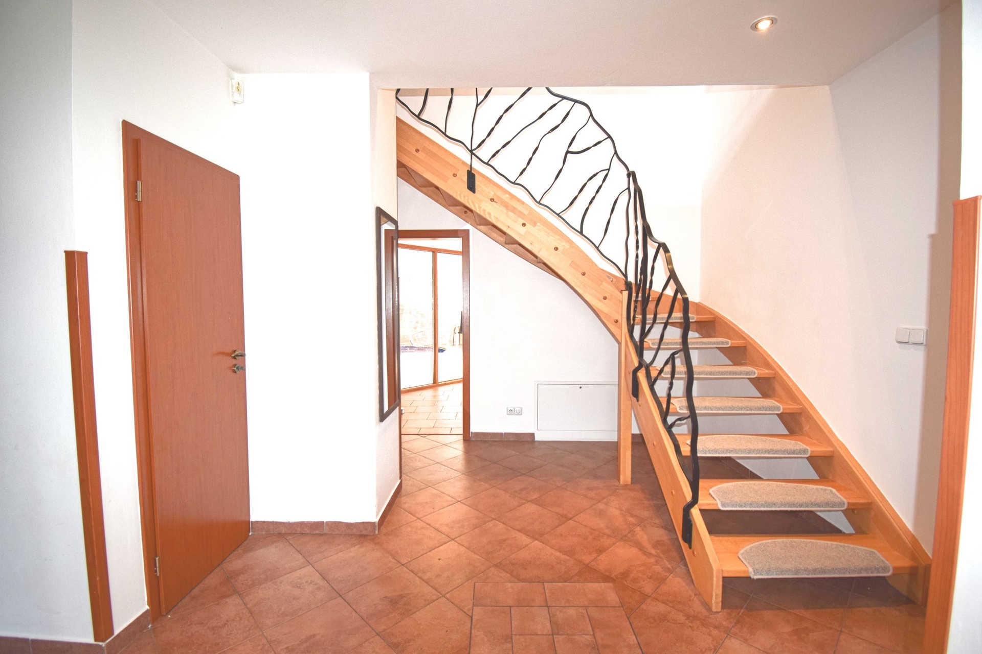 Hlavní obytný prostor začíná prostornou vstupní halou, jejímž hlavním prvkem je točité schodiště s kovaným zábradlím.