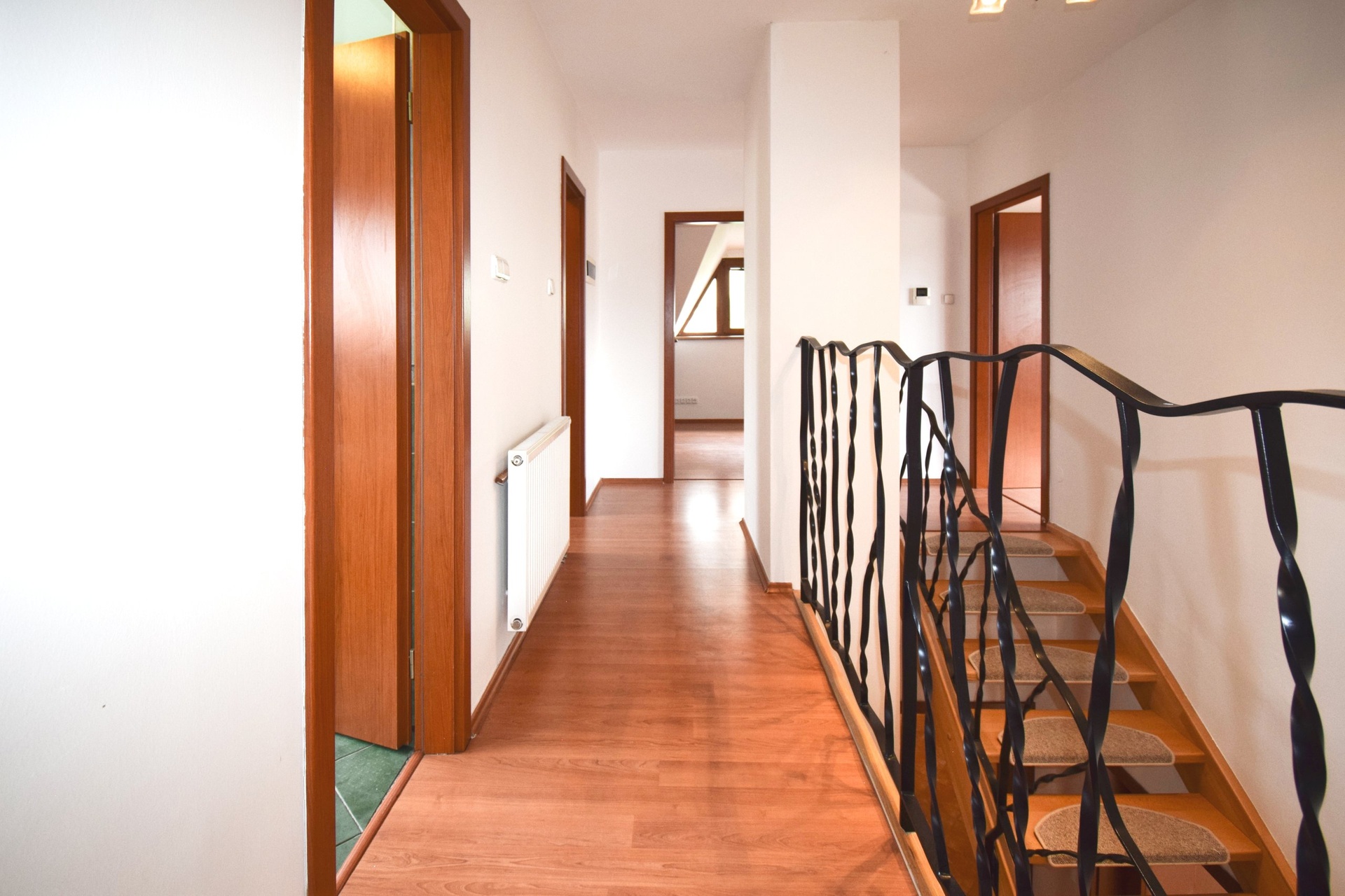 V prvním patře domu jsou 3 ložnice, koupelna s vanou a sprchovým koutem a samostatné WC. Z každého pokoje si můžete užít nádherný výhled do okolí.