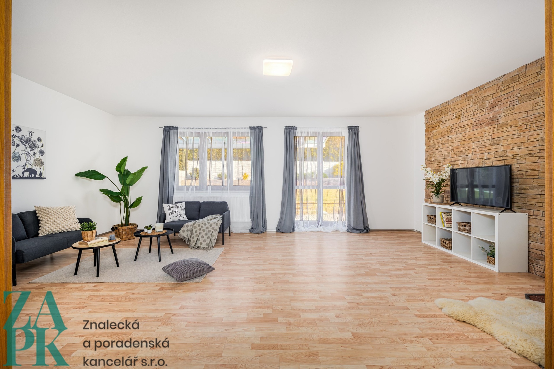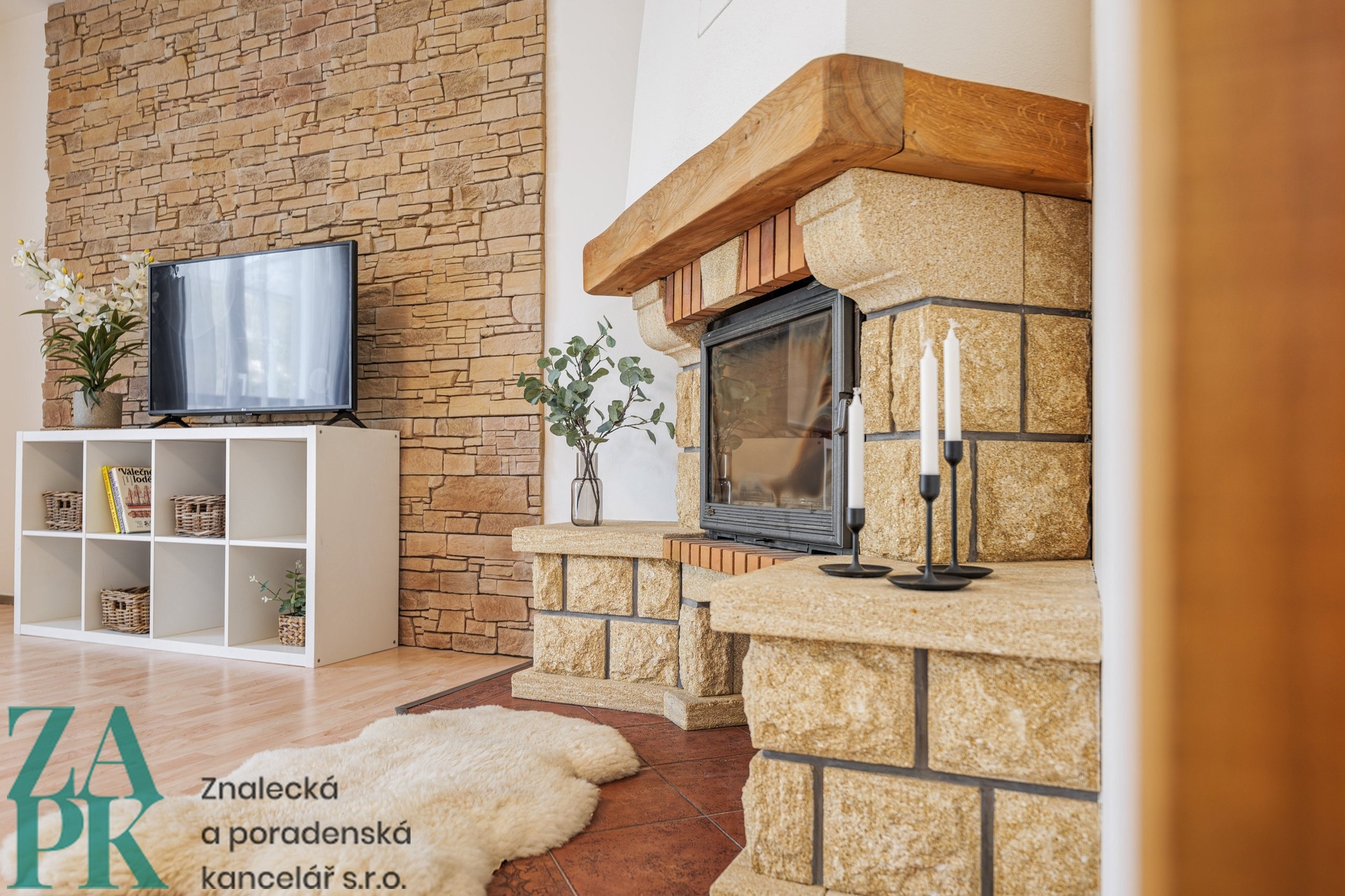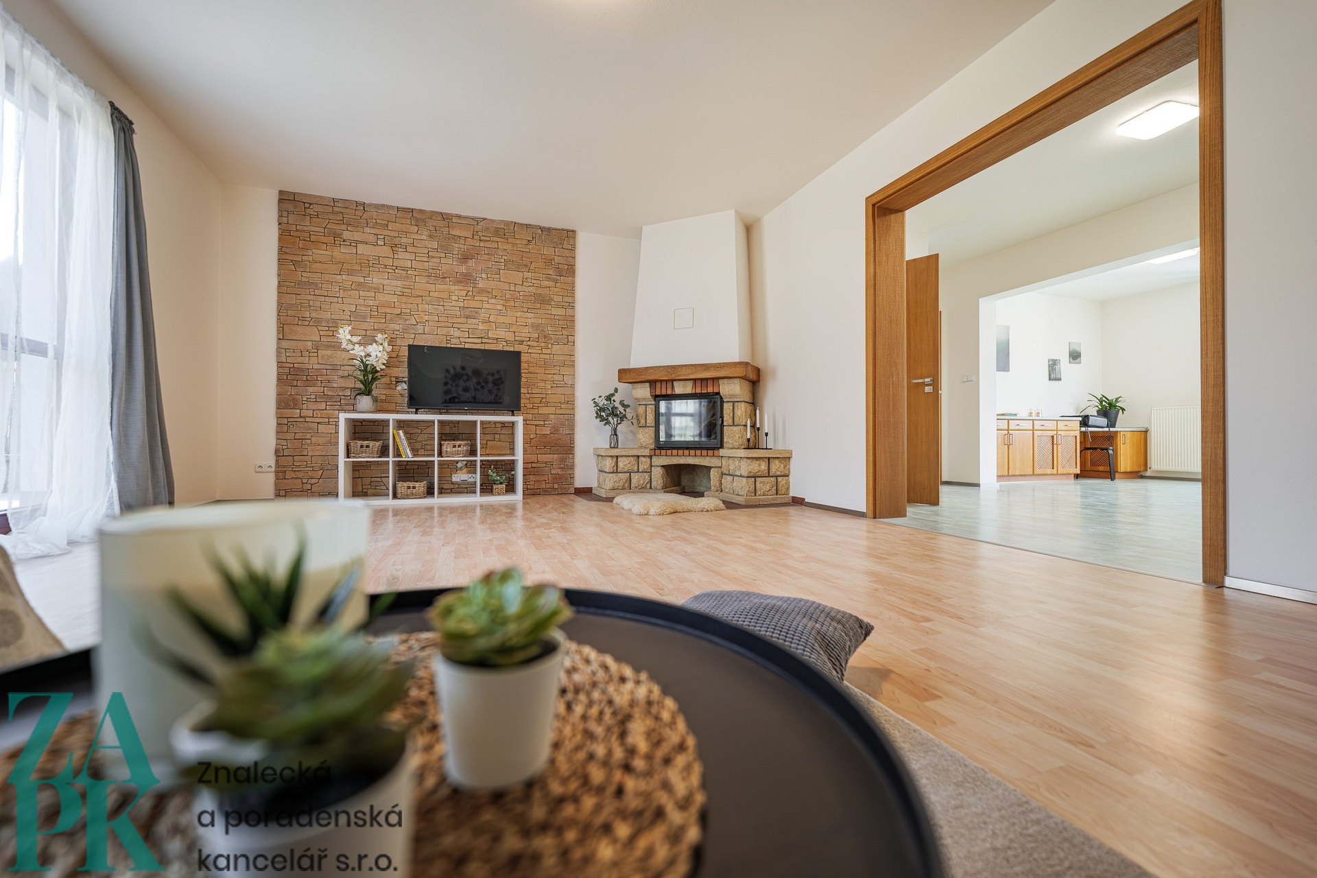 • Prostorný obývací pokoj s krbem a vlezem na zahradu