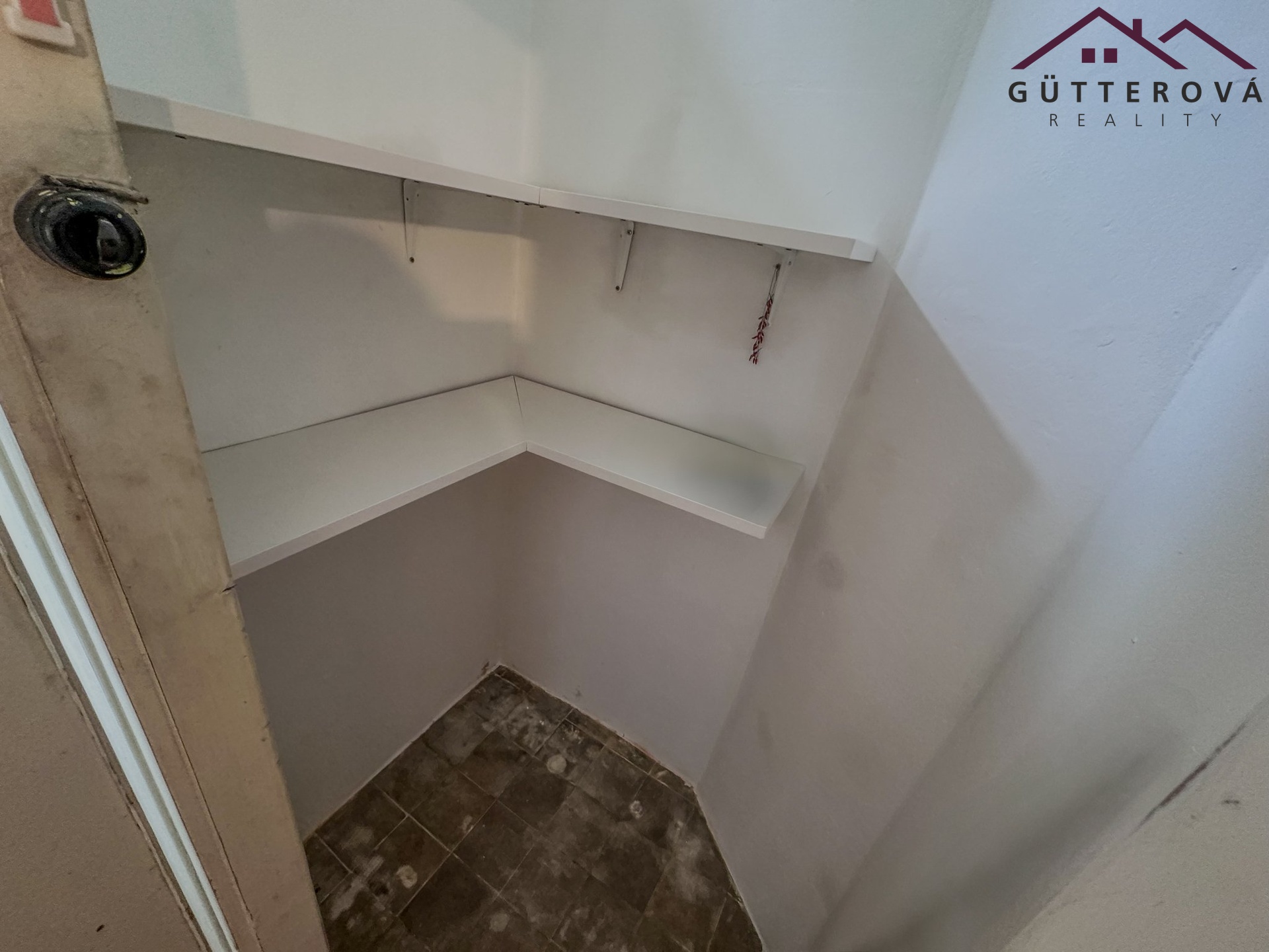 Byt tvoří dva pokoje (cca. 20m2 každý), kuchyňský kout, koupelna s vanou, samostatné WC, chodba, šatna, spíž.