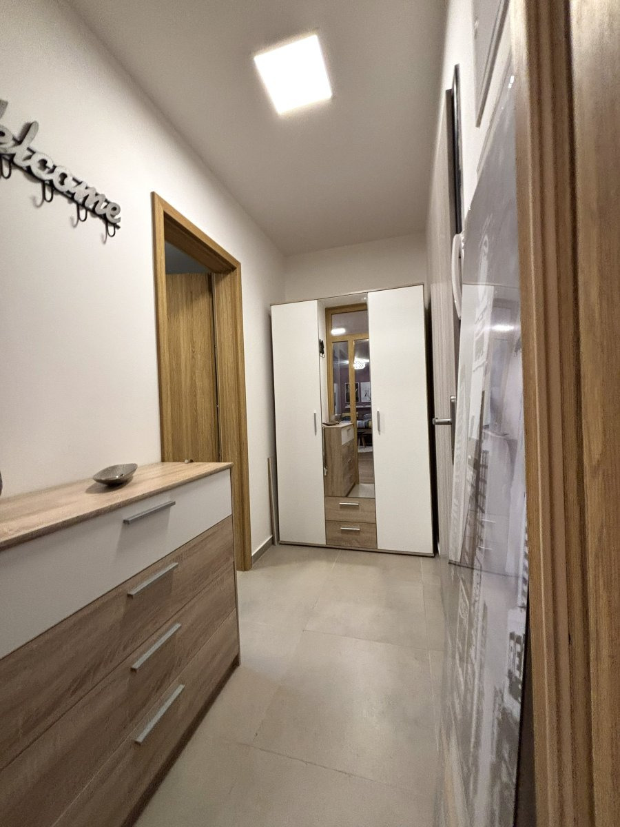 Interiér je ve velmi dobrém stavu a působí vzdušně i útulně zároveň. Hlavní obytná část chytře propojuje kuchyňský kout s obývacím prostorem a klidovou zónou pro spánek – ideální pro jednotlivce nebo pár, kteří chtějí mít město doslova na dosah. Díky plnému vybavení je byt připraven k okamžitému komfortnímu užívání bez dalších investic.