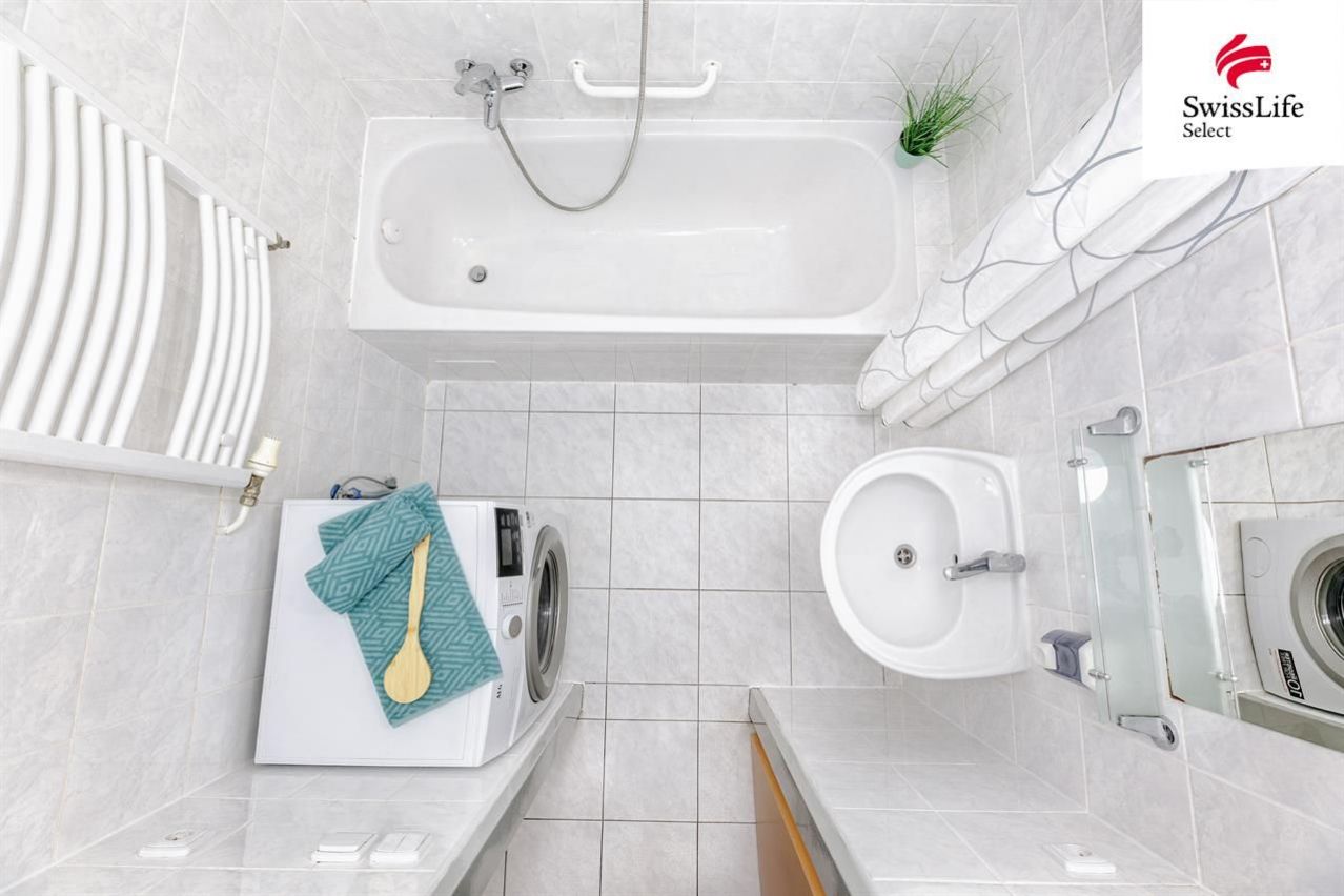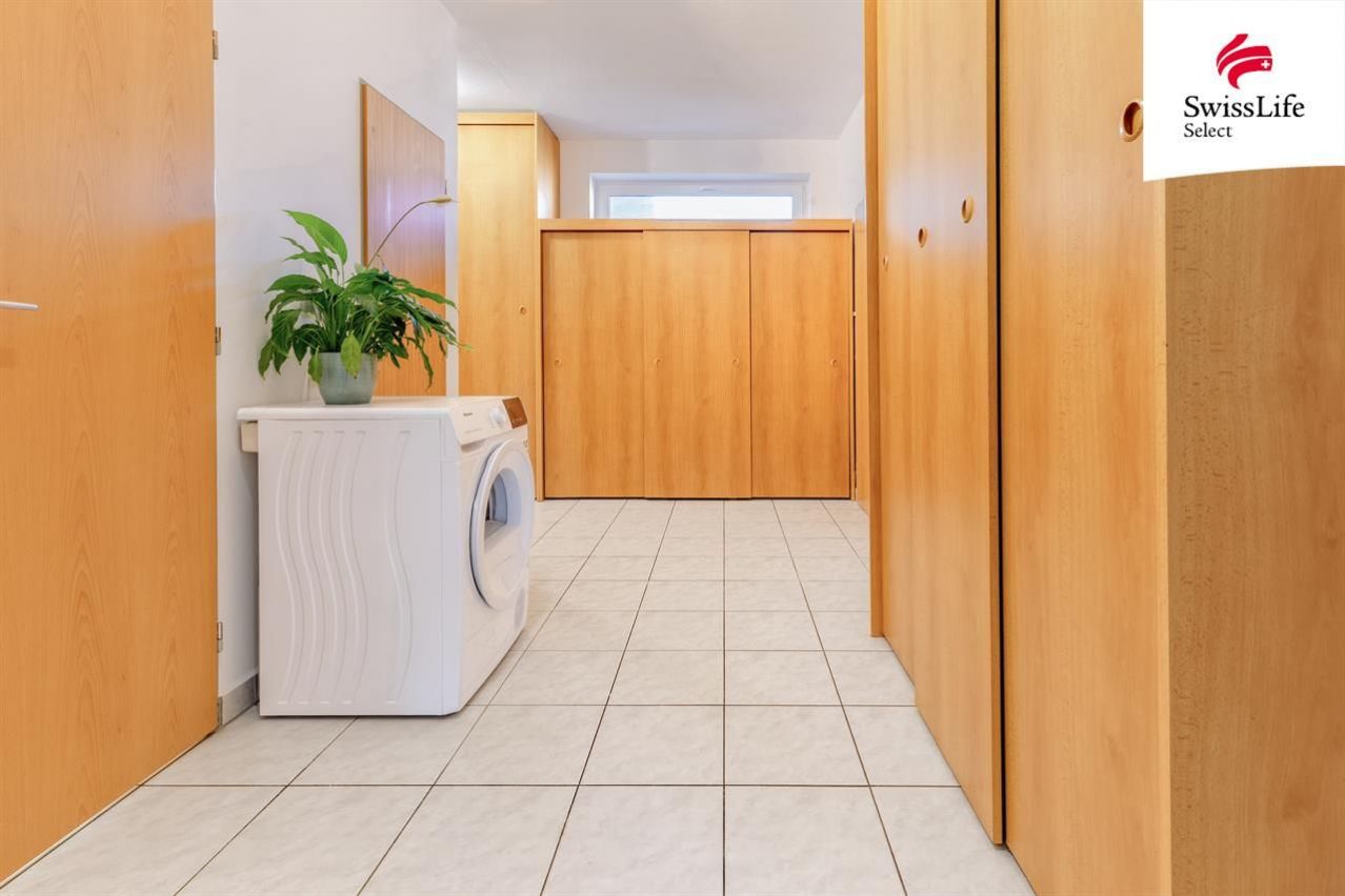 Obývací pokoj spojený s kuchyňským koutem je dostatečně velký, aby se sem vešla sedací souprava i jídelní stůl pro rodinu. Ložnice z něj přístupná je vybavená úložným prostorem a i z ní je vstup na lodžii. Nadstandardní množství úložných prostor je ve velké předsíni. Z ní jsou přístupné jak další pokoj, tak koupelna, samostatná toaleta i komora. Byt je kromě kuchyňské linky vybaven také lednicí, pračkou a sušičkou. Vytápění bytu i ohřev vody je centrální dálkový.