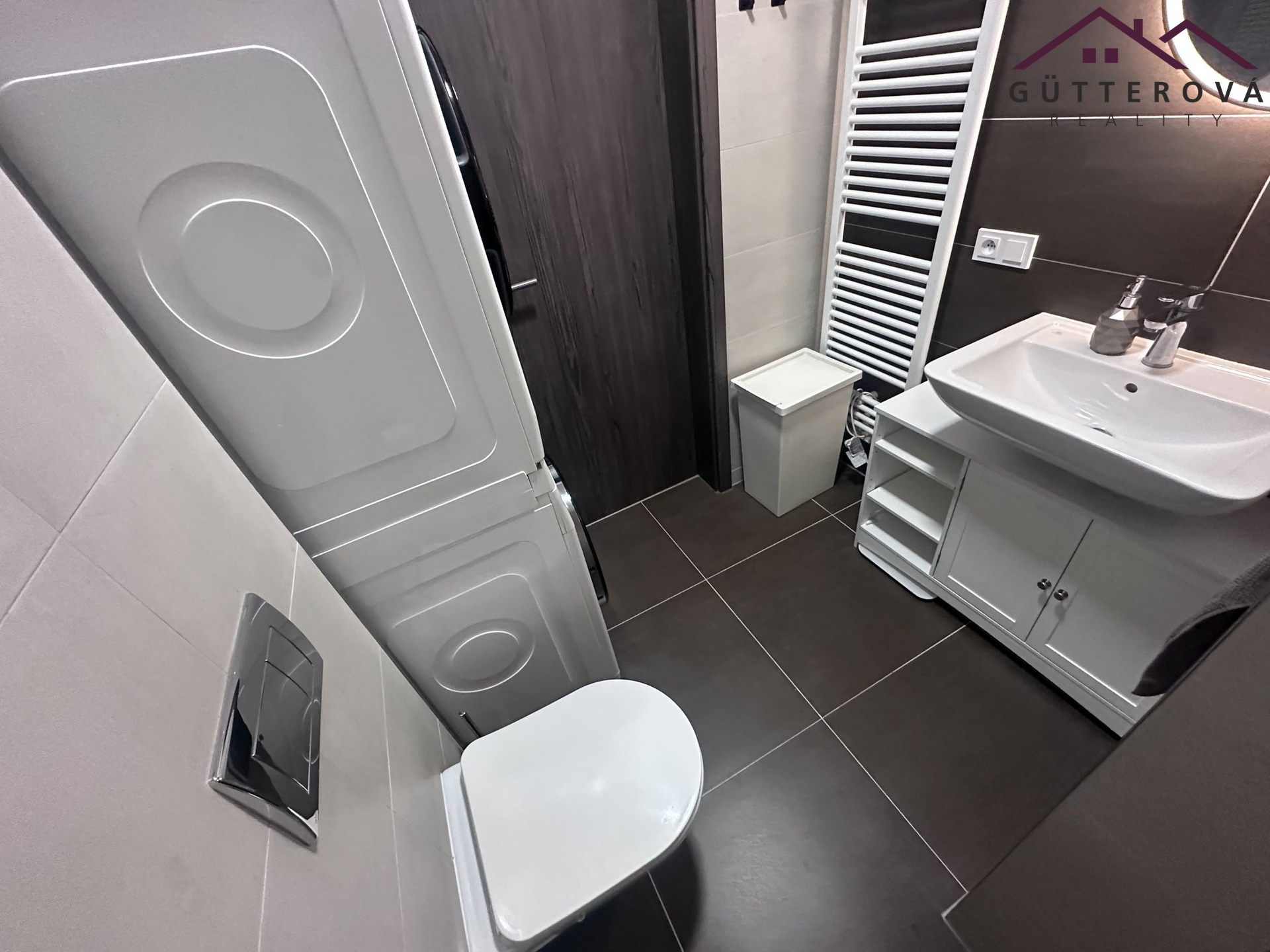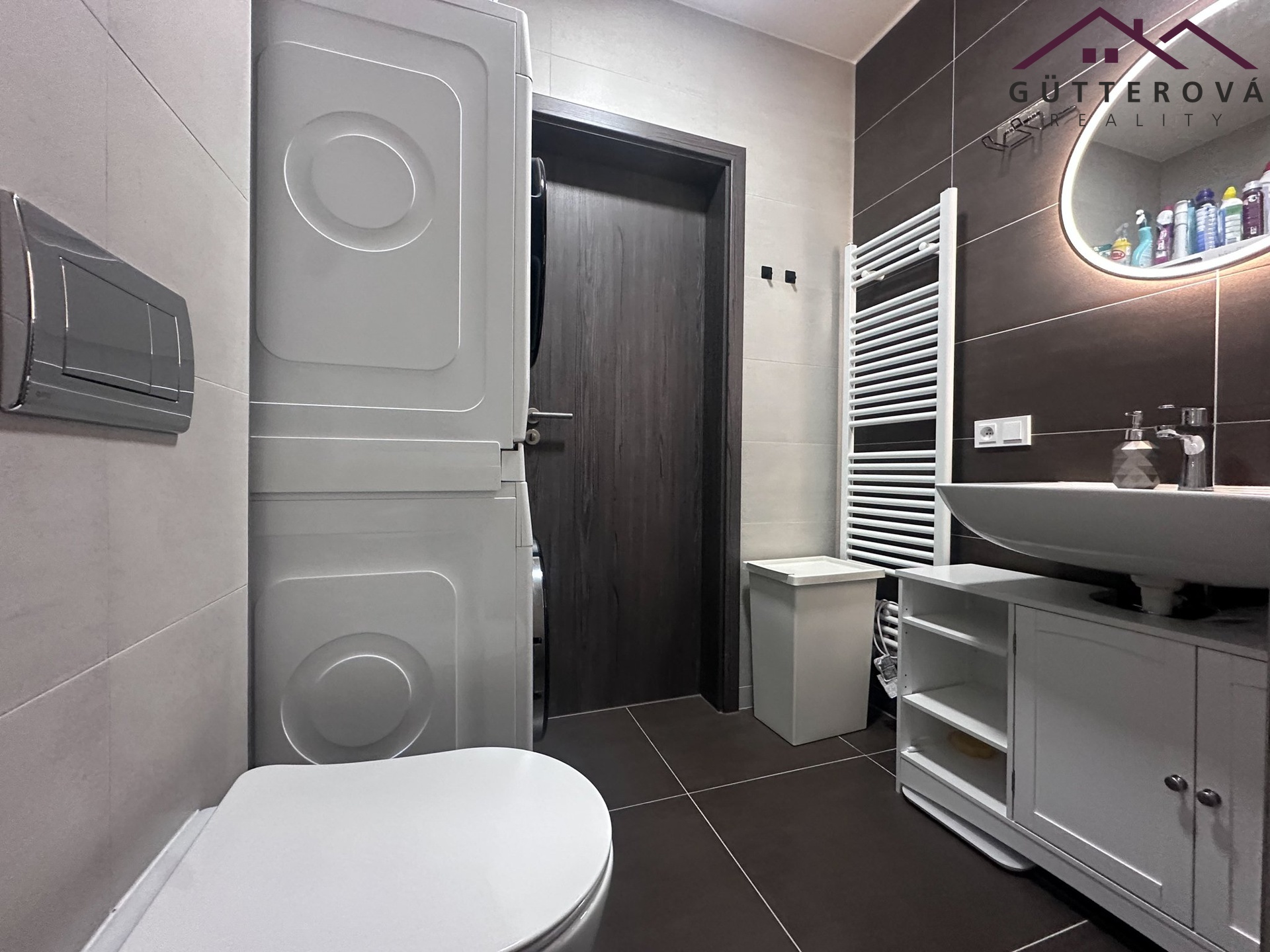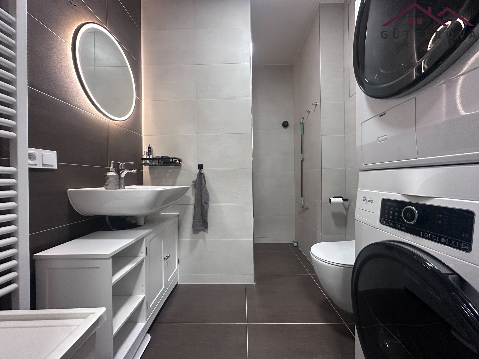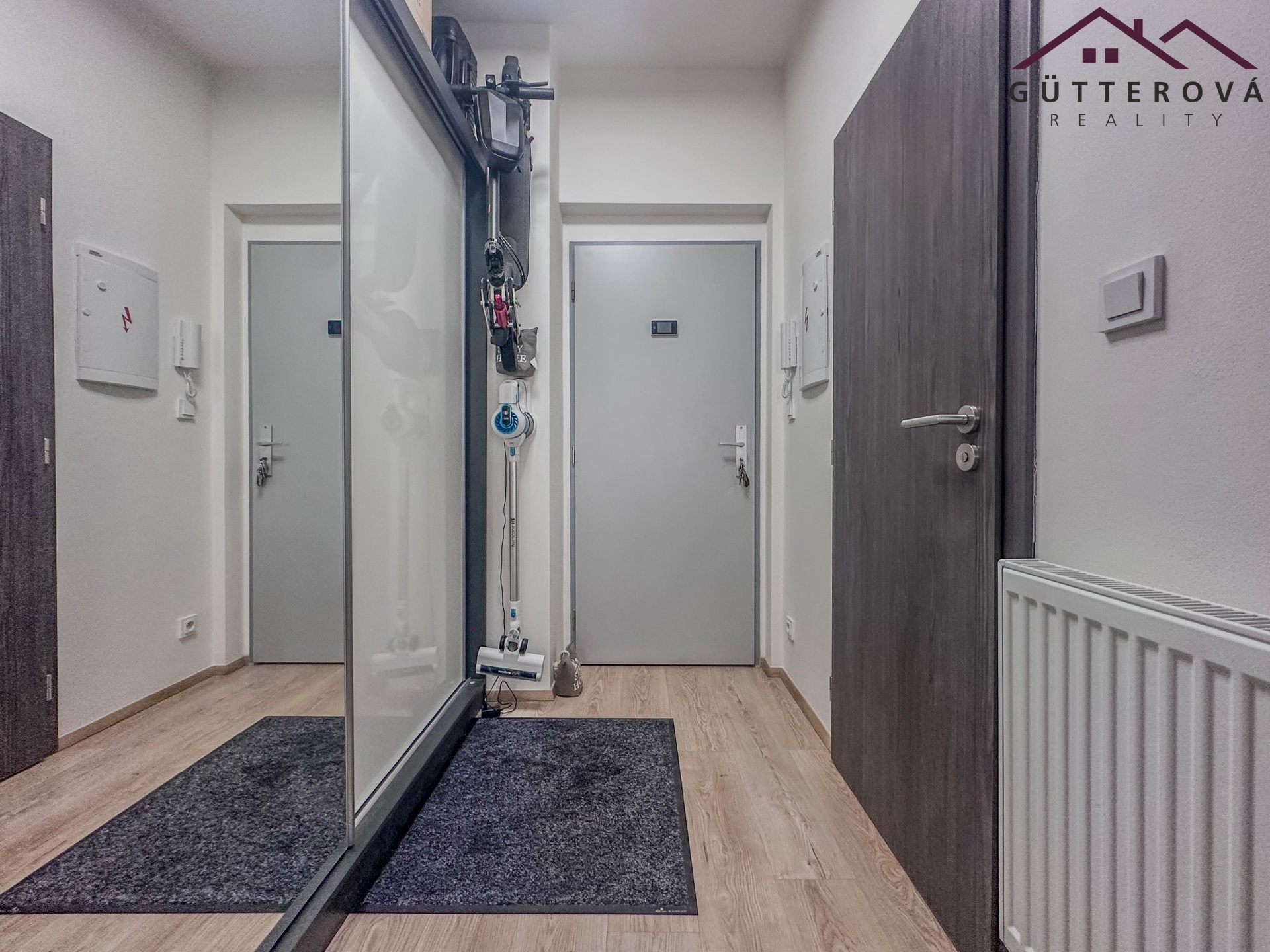 Bytová jednotka je umístěna do 2. NP novostavby s výtahem a tvoří ho chodba s vestavěnou skříní, moderní koupelna s WC a sprchovým koutem.