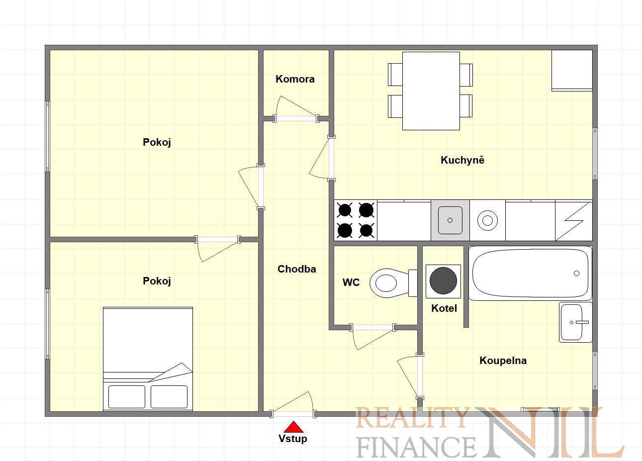 Byt je velmi prostorný, dominantou je velký obývací pokoj, ze kterého je vchod do ložnice. V bytě je také praktická komora a dvě vestavěné skříně. Další vybavení bytu: kuchyňský stůl + 4 židle, dřevěný rám manželské postele.