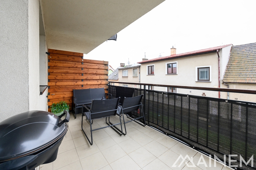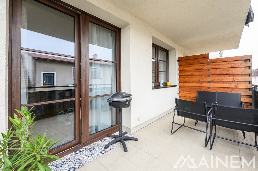 Byt se nachází ve 2. nadzemním podlaží novostavby z roku 2019. Díky své orientaci nabízí příjemně prosluněný obývací pokoj s kuchyňským koutem orientovaný na jih, zatímco ložnice a druhý pokoj směřují na sever. Součástí kuchyně je myčka, trouba, varná deska a digestoř. Hned vedle kuchyňské linky je vstup do spíže, kam lze umístit pračka se sušičkou. Součástí ložnice je prostorná šatna. V celém bytě je podlahové vytápění, přičemž zdrojem tepla a teplé vody je plynový kotel pro celý dům. Byt se dává do pronájmu bez vybavení. Veškeré vybavení na fotografiích je současných nájemců.