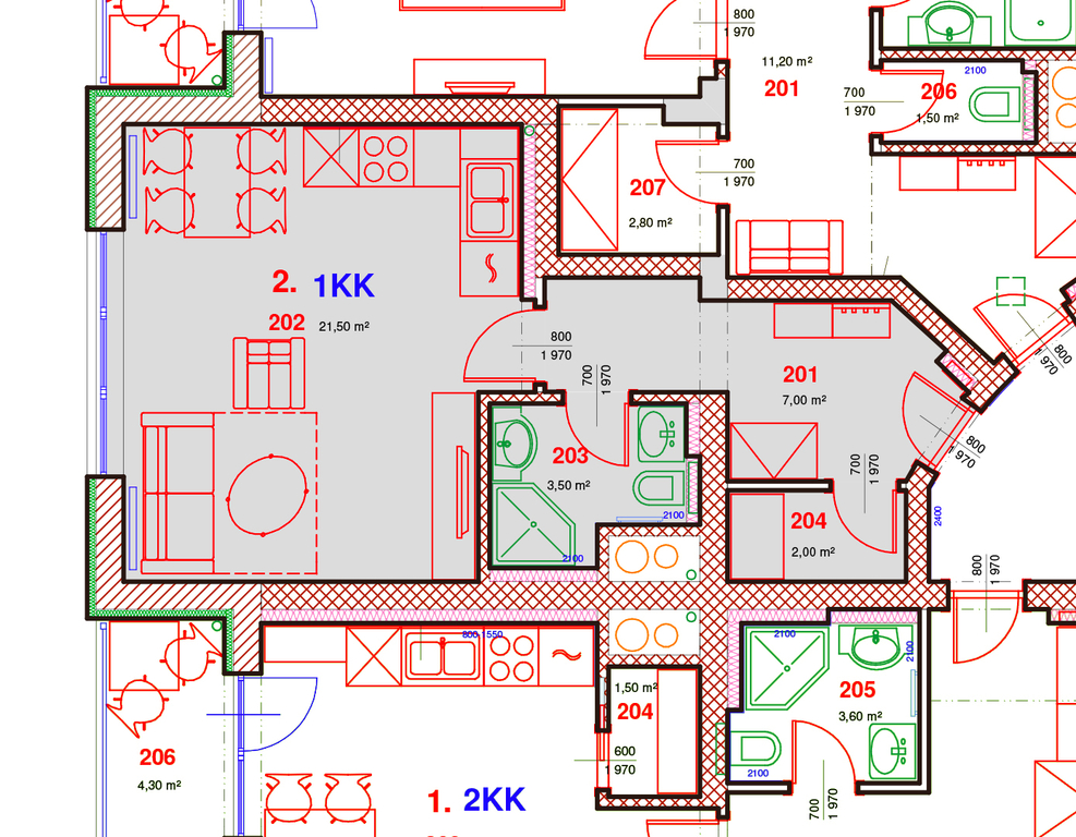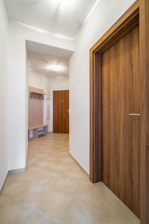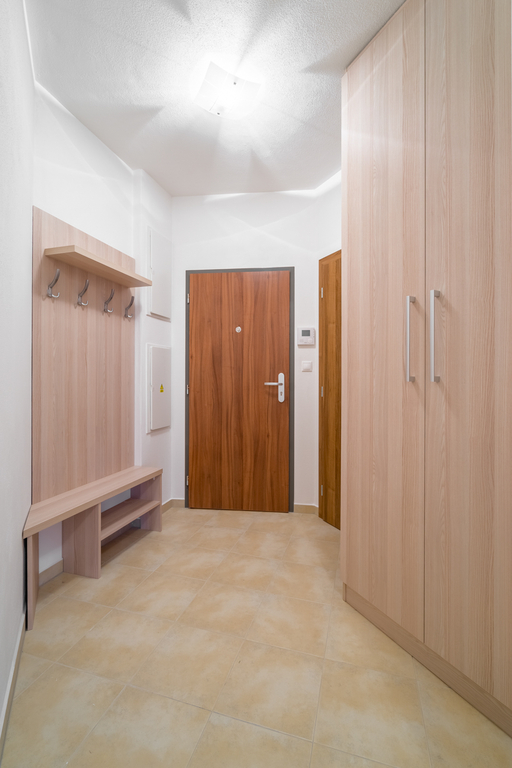 Byt je vybavený kuchyňskou linkou včetně vestavné elektrické trouby, sklokeramické desky, digestoře a myčky nádobí. Součástí vybavení je také vestavěná šatní skříň, věšák s botníkem, koupelnový nábytek, video zvonek a kompletní osvětlení.