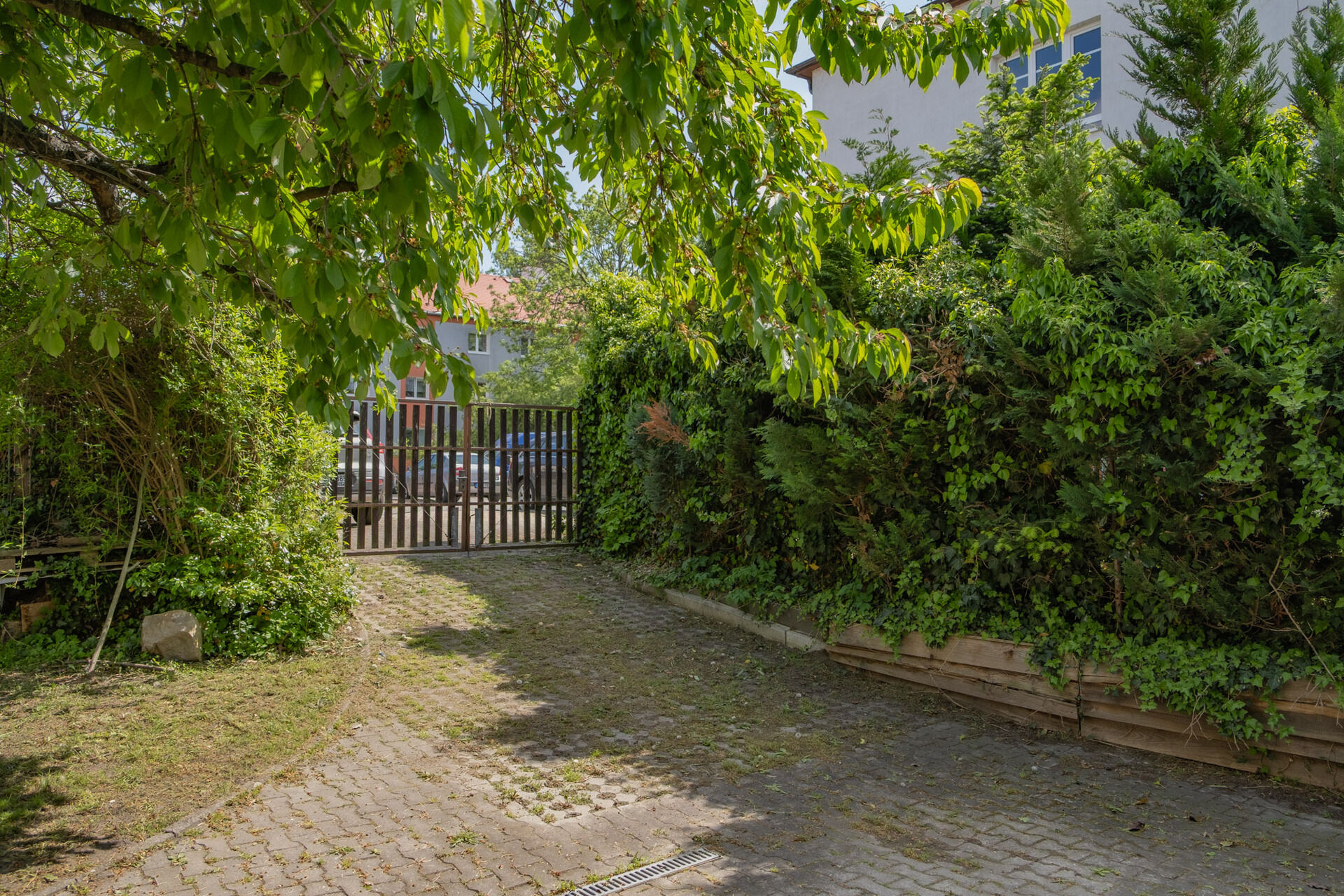 Na pozemku se nachází 2 zděné garáže (19 m² a 20 m²) s příjezdem z ulice Kyjevská. Další přístup na pozemek je zajištěn brankou z ulice Strnadova.