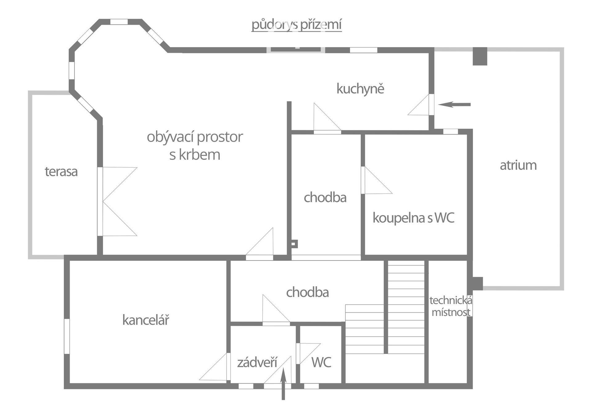 Přízemí: prostorná obytná místnost s krbem, kuchyně, koupelna, oddělená pracovna s vlastním WC, technická místnost, průchod do atria