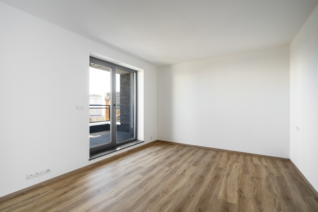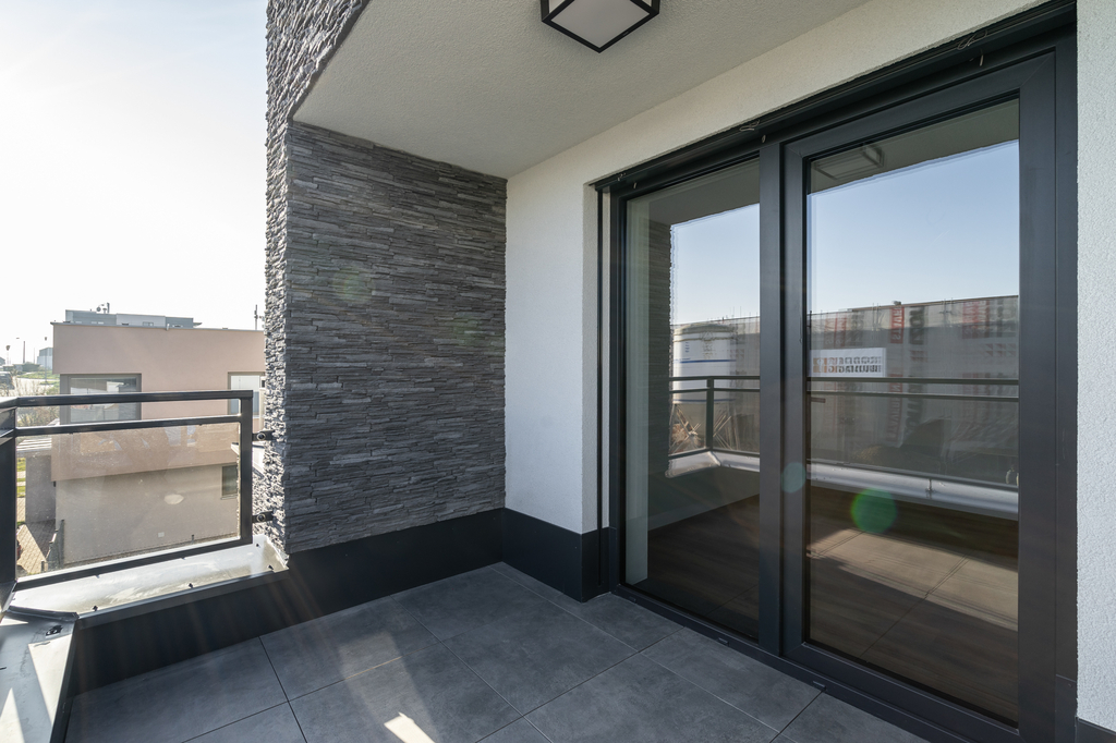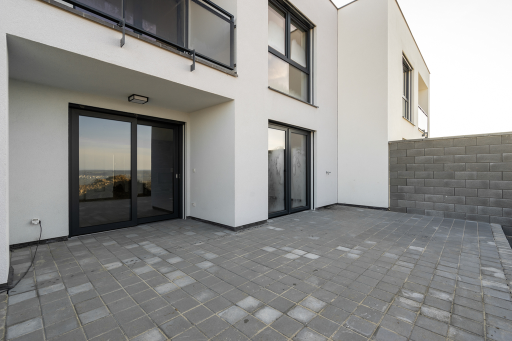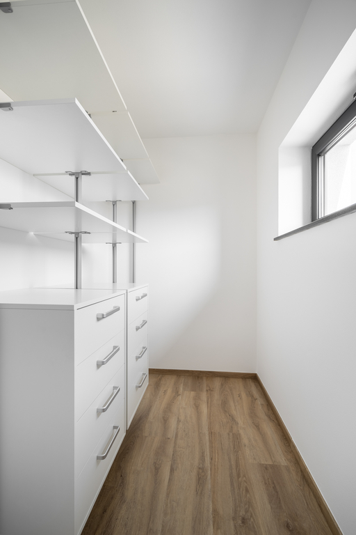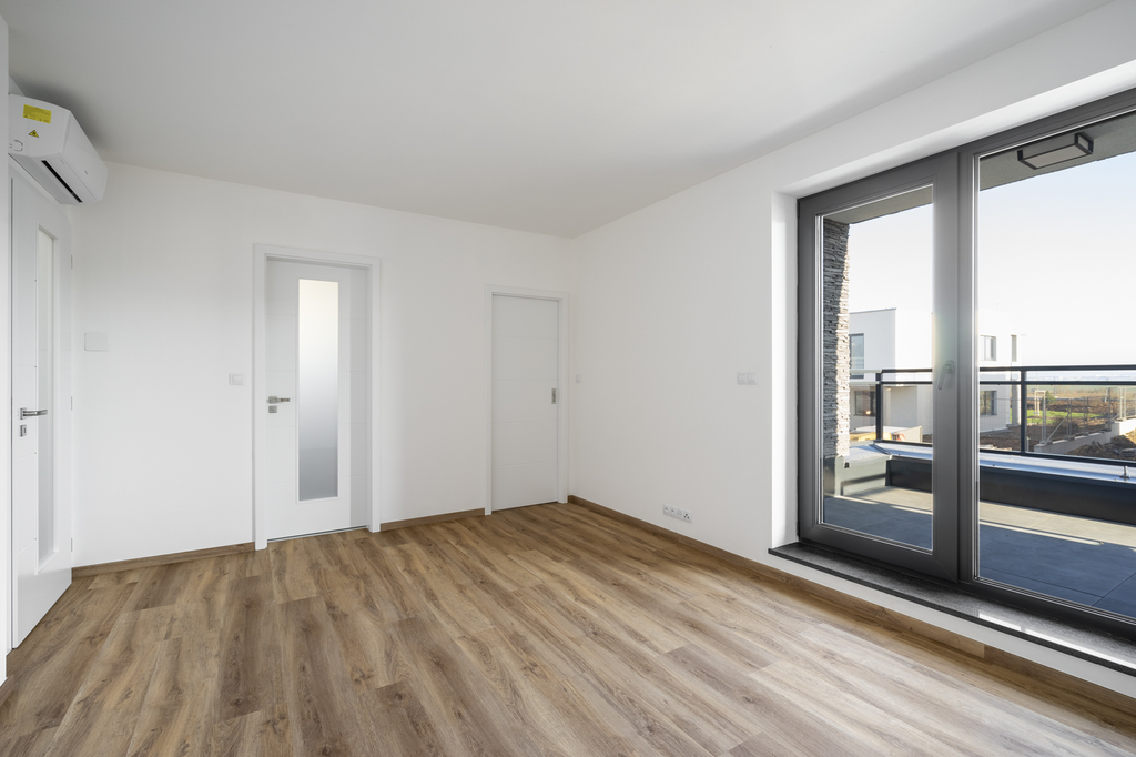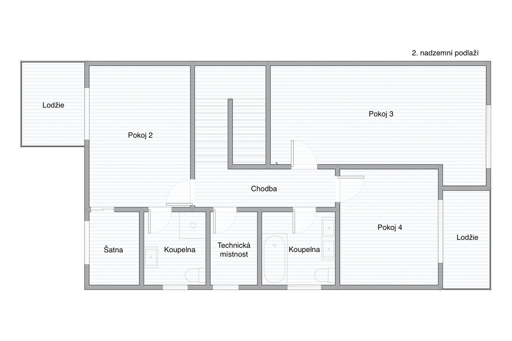V patře se nachází hlavní ložnice s vlastní koupelnou, šatnou a vstupem na východně orientovaný balkon. Dále jsou zde dva samostatné pokoje, z nichž jeden má přímý vstup na západně orientovanou lodžii. Patro doplňuje třetí koupelna s toaletou a technická místnost s přípojkou na pračku i sušičku.