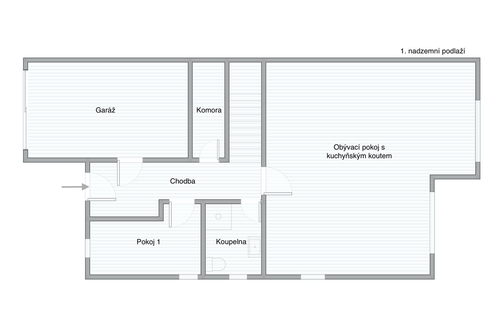 Většinu obytné části přízemí zaujímá obývací pokoj, jehož dominantou je krbová vložka s kamenným obložením. Navazující kuchyně s jídelnou jsou součástí otevřeného prostoru. Velká francouzská okna nejen opticky zvětšují tento prostor, ale zároveň umožňují vstup na terasu. Přízemí domu je dále členěno na vstupní chodbu, menší místnost vhodnou jako pracovna, koupelnu s toaletou, komoru pod schodištěm a garáž propojenou s interiérem domu.