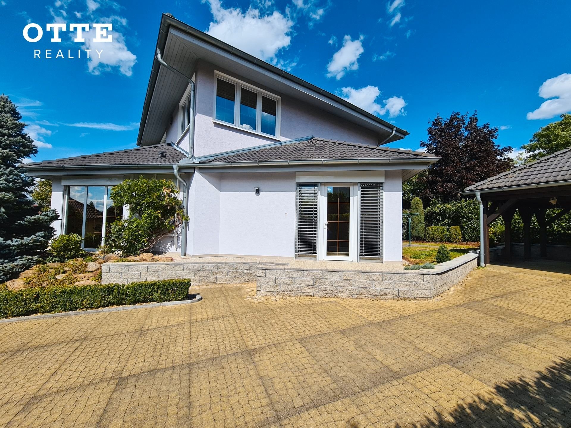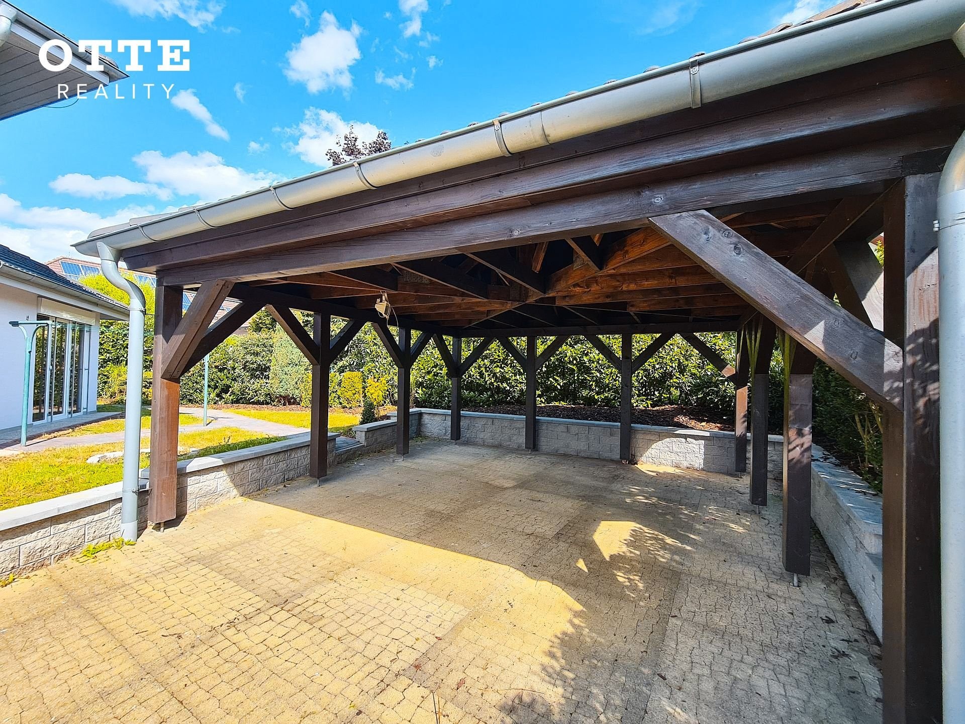 Zahrada je udržovaná se vzrostlou zelení s prostornou, zastřešenou, dřevěnou terasou u domu. V zadní části zahrady je zahradní domek. Celková výměra pozemku je 780 m2. Vjezd na pozemek zajišťují elektricky ovládaná vrata na dálkové ovládání. K parkování je možné používat zastřešené parkovací stání pro dva automobily, před tímto carpointem jsou další parkovací možnosti.