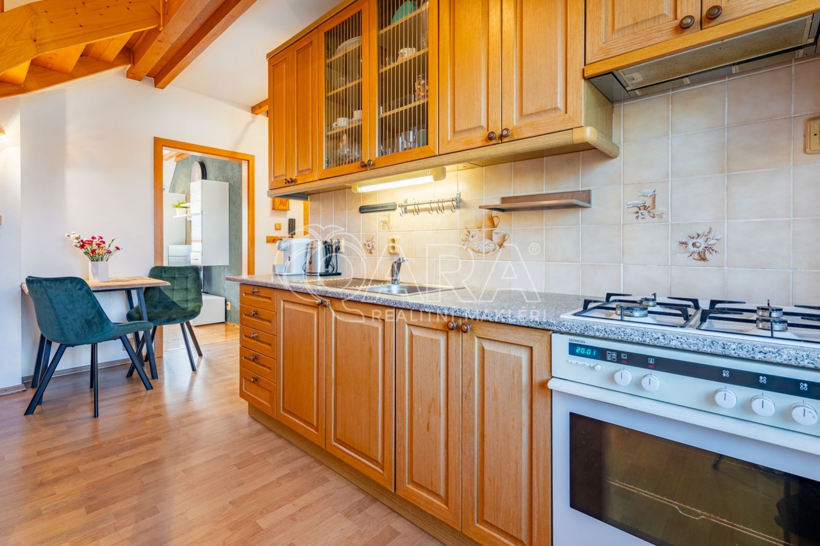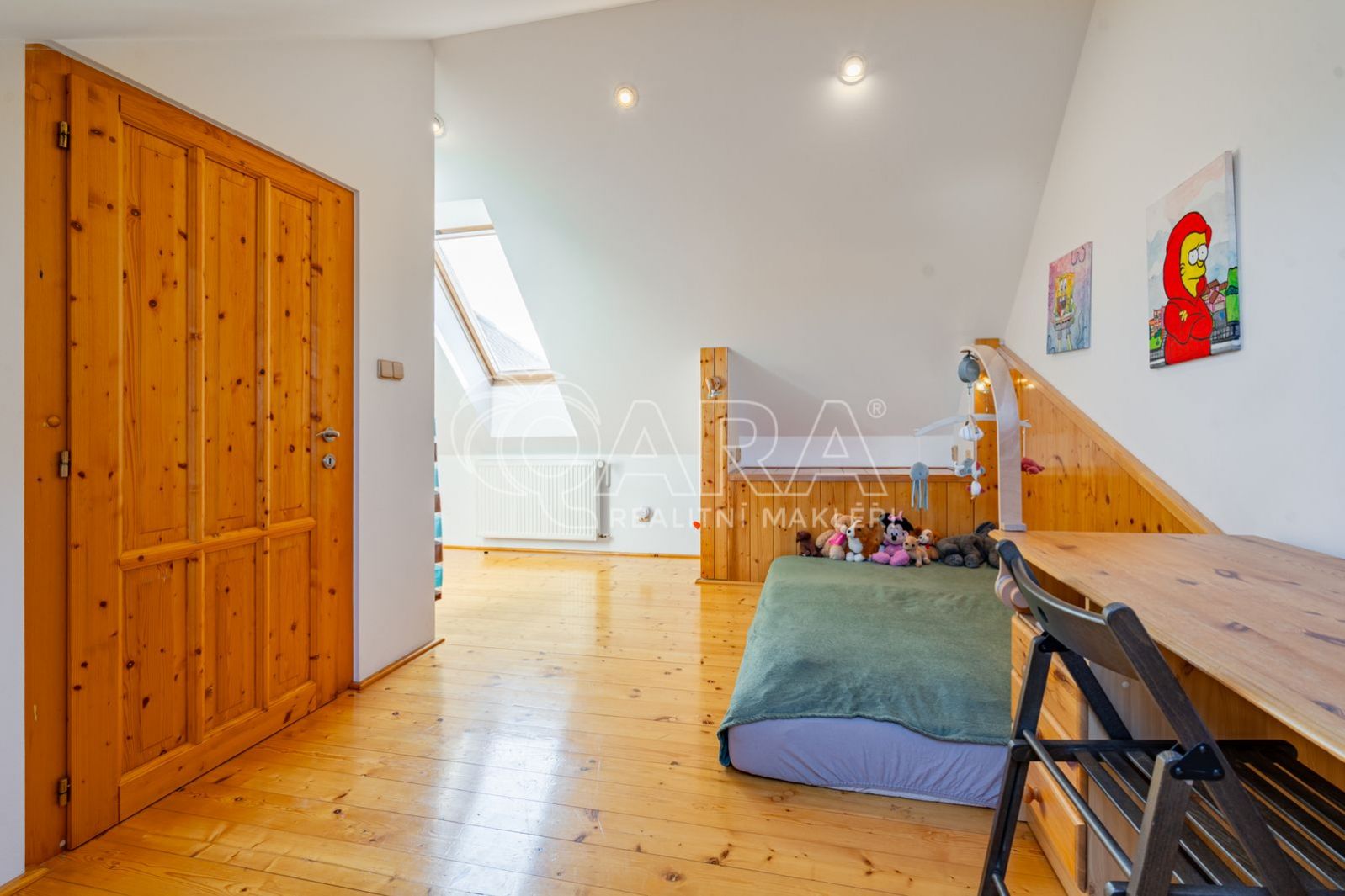 Podkrovní oáza: Z kuchyně vede dřevěné schodiště do horního pokoje s okny na obě strany, ideální jako ložnice nebo klidná pracovna.