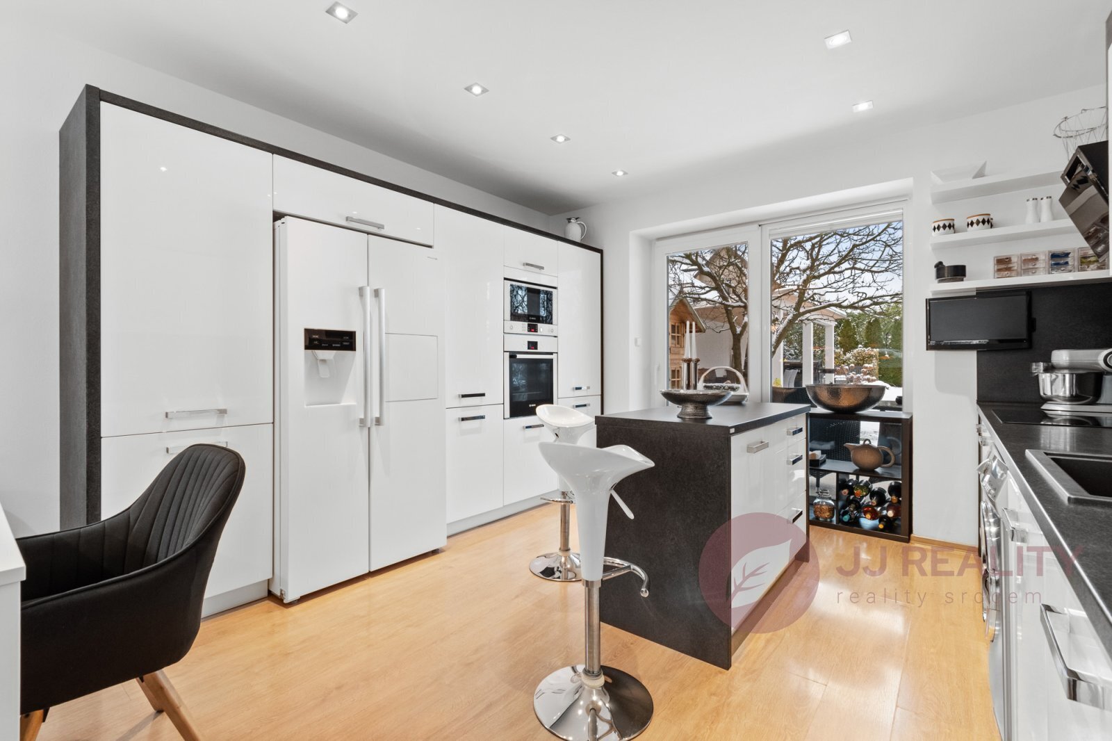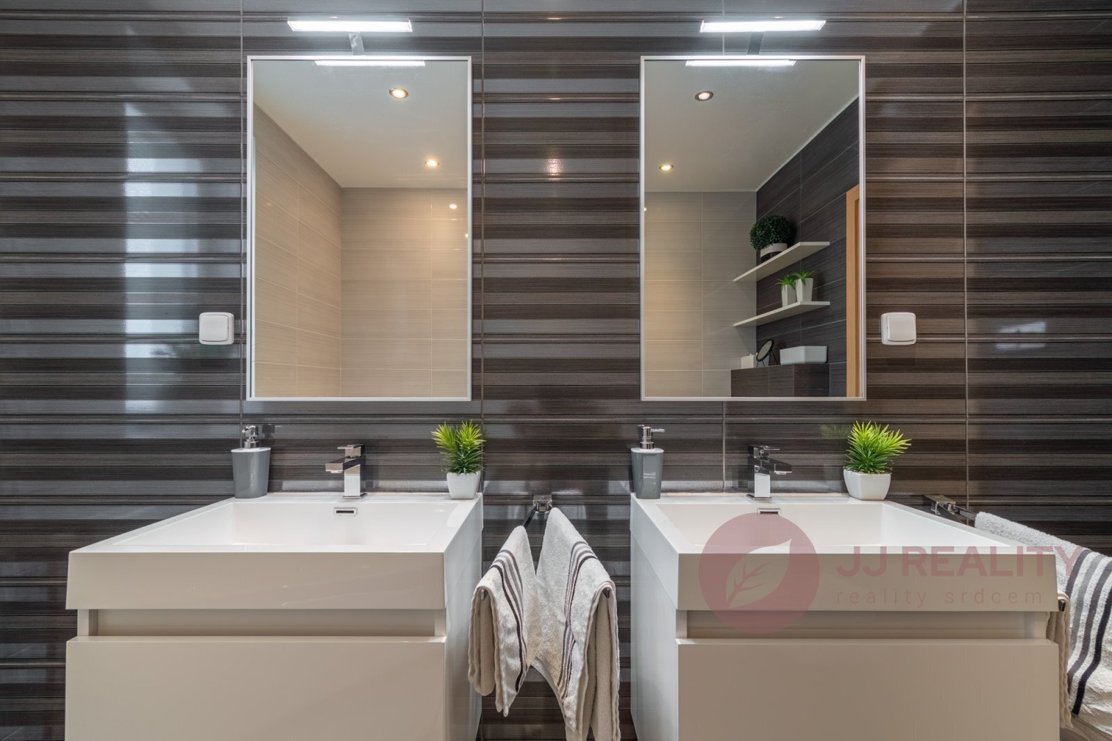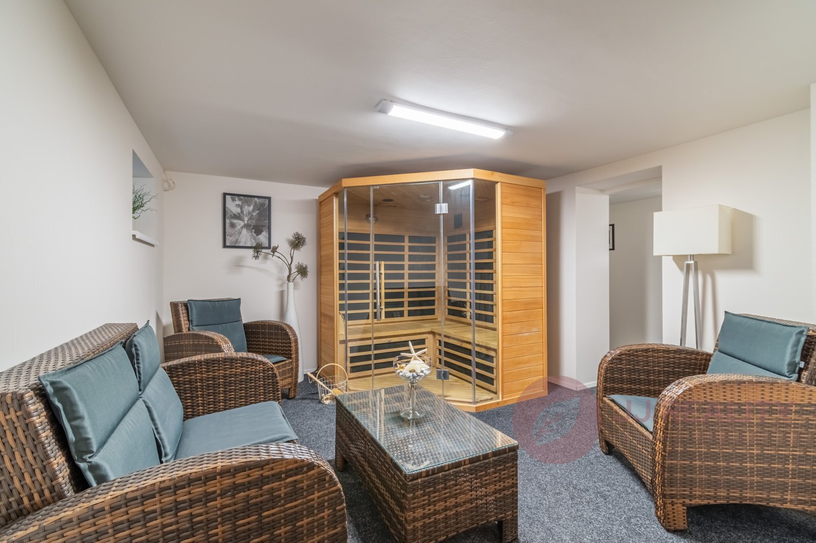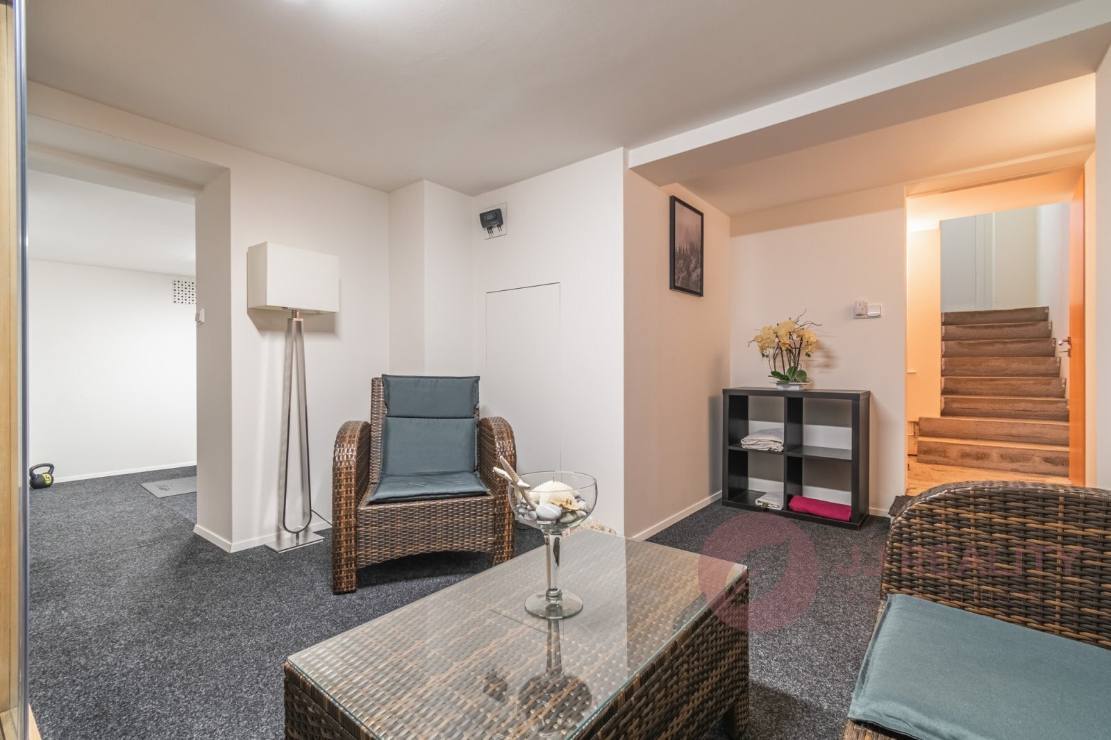 Tento dům se vyznačuje nejen moderním designem a prostorností, ale také pečlivě promyšlenými úložnými prostory, které zajišťují, že váš interiér zůstane uzavřený a organizovaný. Vedlejší vchod domu umožňuje přístup do suterénu, kde se nachází WC pro návštěvníky zahrady či bazénu, relaxační místnost s prostornou rohovou infrasaunou pro čtyři osoby a tělocvičnu. Dále tu najdete technickou místnost a samostatný špajz. Prostory byly vytvořeny z původního podsklepení