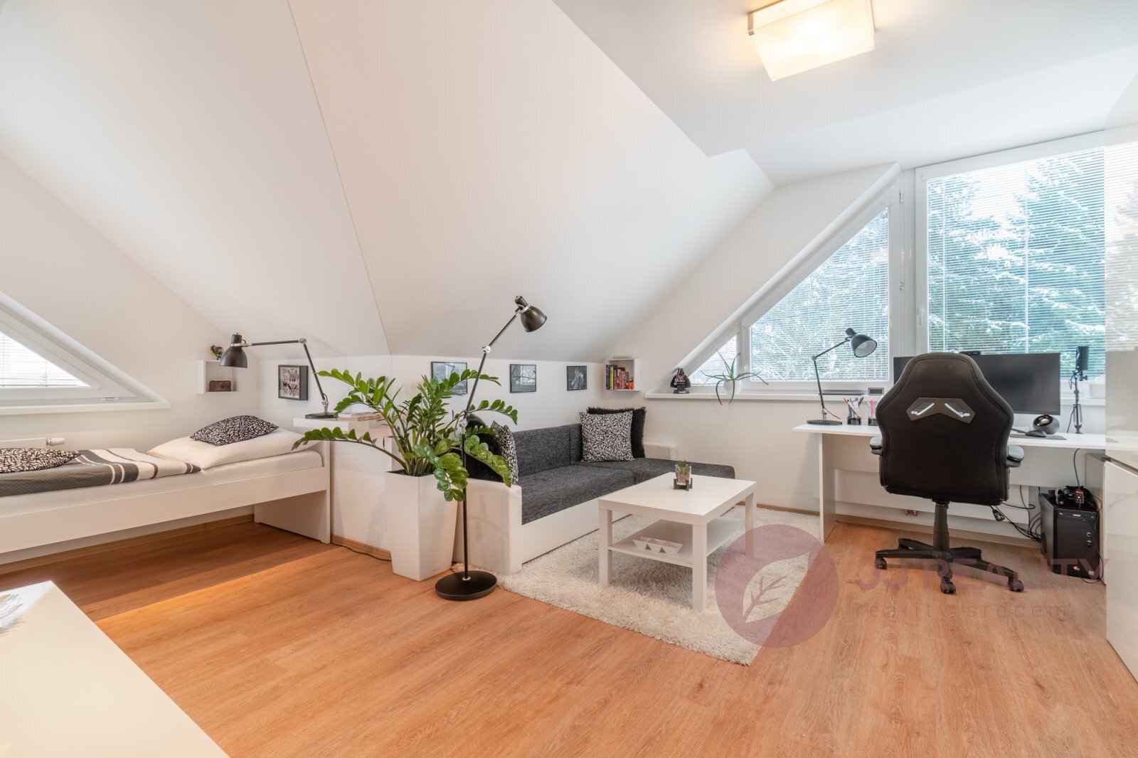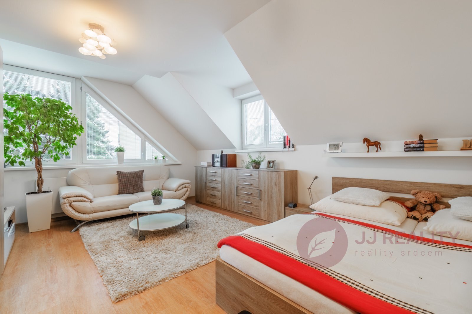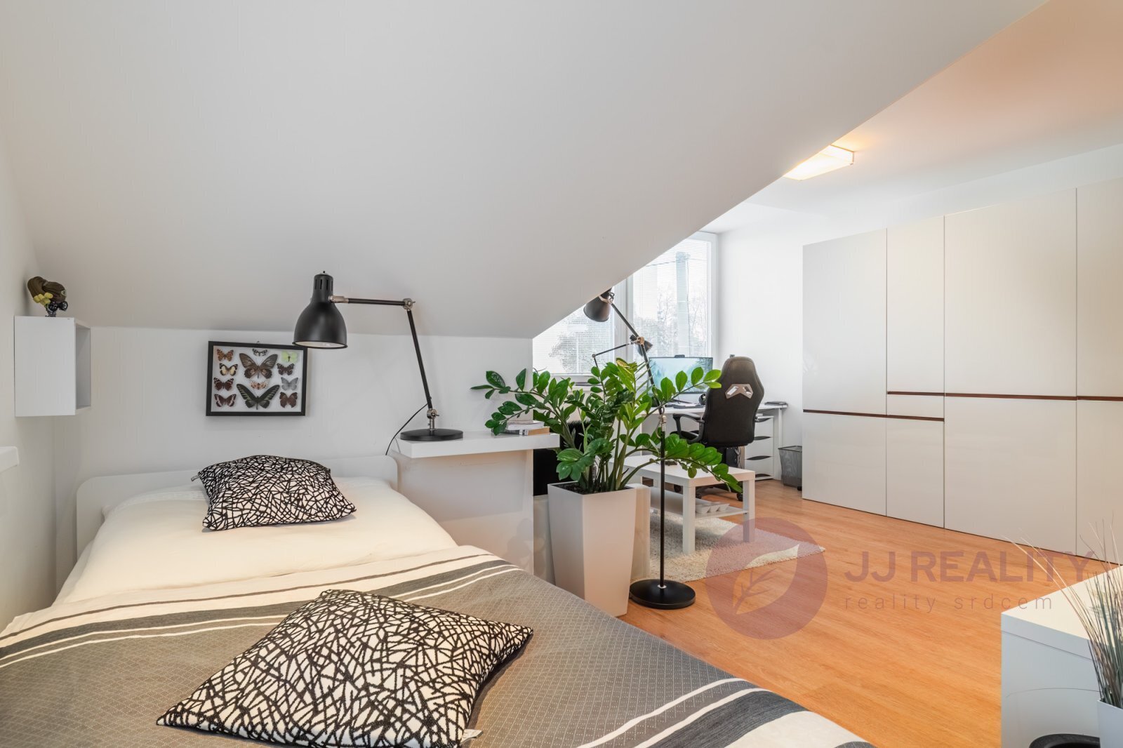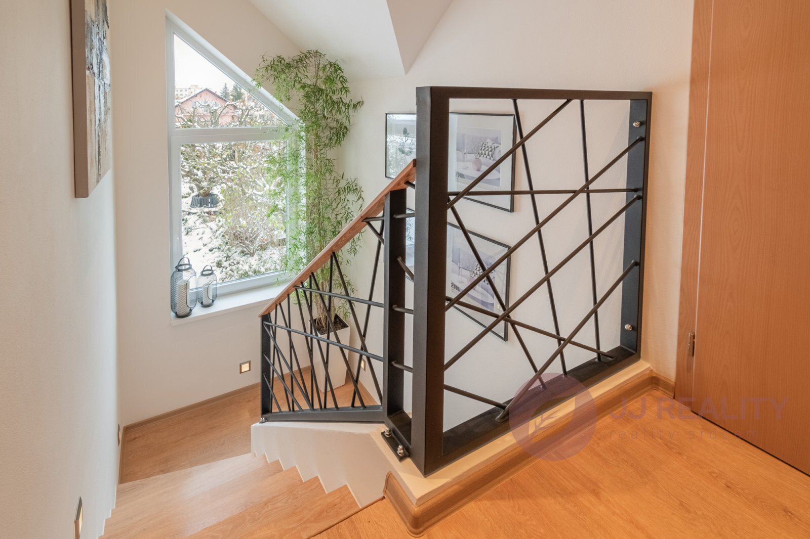 Po betonovém schodišti se dostanete do prvního patra, kde na vás čekají čtyři světlé pokoje. Dva z nich jsou velmi prostorné, třetí disponuje balkónem s dechberoucím výhledem na zahradu a bazén, a čtvrtá místnost slouží jako útulná pracovna s výhledem na Bolevecký rybník. Na patře se rovněž nachází druhá prostorná koupelna s WC, která kombinuje funkčnost s moderním stylem. Všechny pokoje jsou prosvětlené díky velkým oknům s kvalitními trojskly , které nabízejí výhled do všech světových stran.