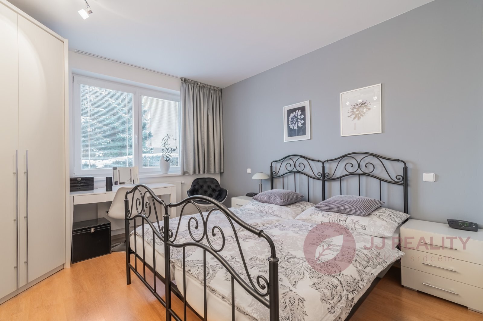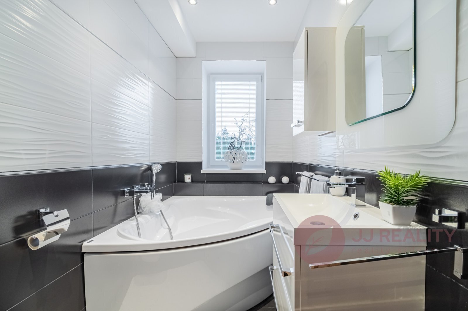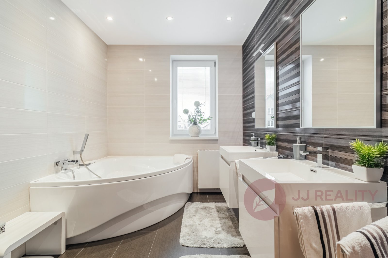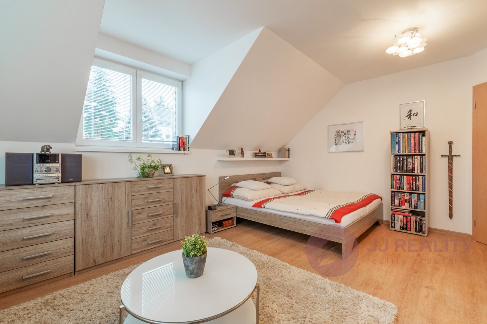 Po betonovém schodišti se dostanete do prvního patra, kde na vás čekají čtyři světlé pokoje. Dva z nich jsou velmi prostorné, třetí disponuje balkónem s dechberoucím výhledem na zahradu a bazén, a čtvrtá místnost slouží jako útulná pracovna s výhledem na Bolevecký rybník. Na patře se rovněž nachází druhá prostorná koupelna s WC, která kombinuje funkčnost s moderním stylem. Všechny pokoje jsou prosvětlené díky velkým oknům s kvalitními trojskly , které nabízejí výhled do všech světových stran.