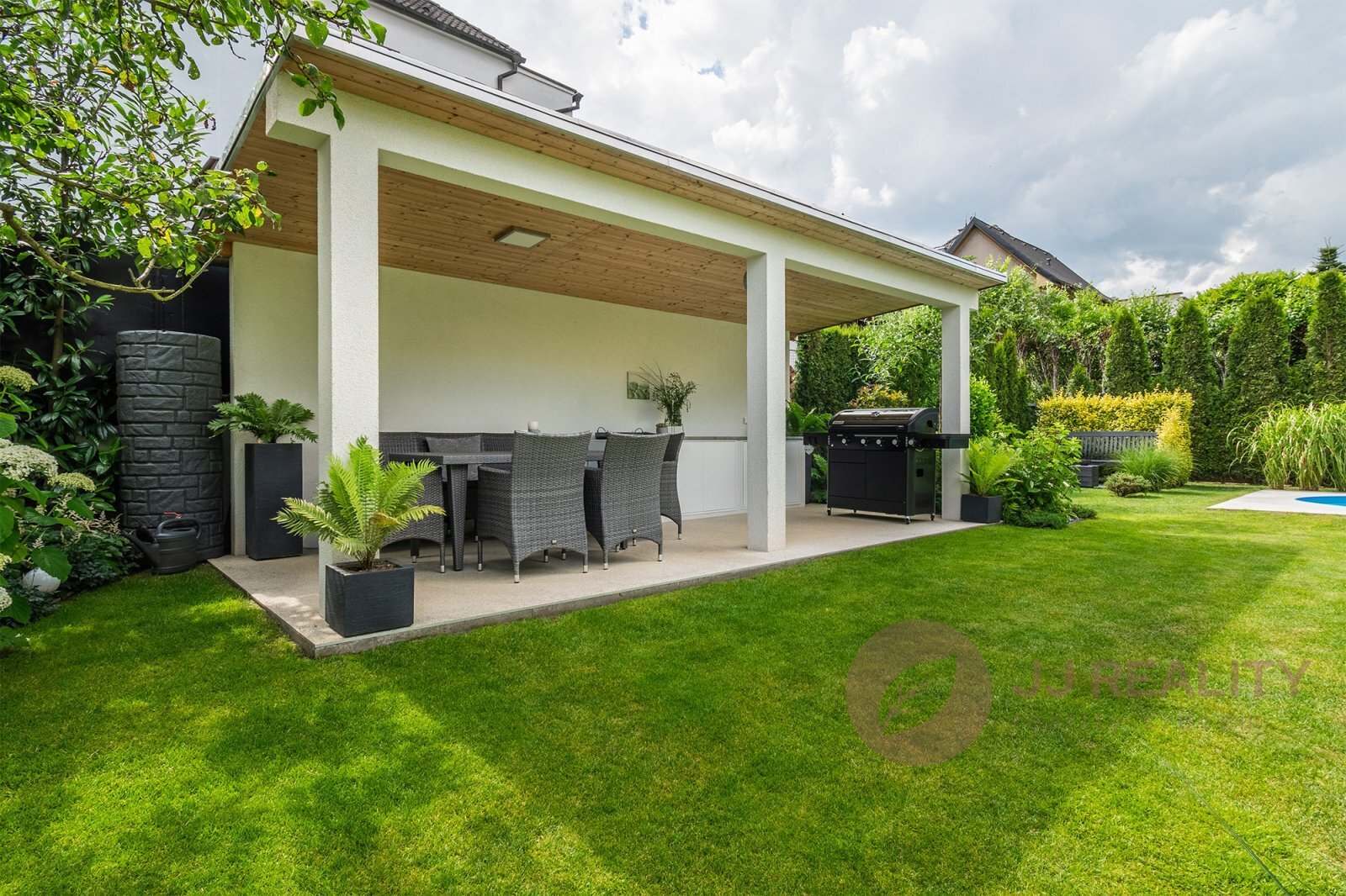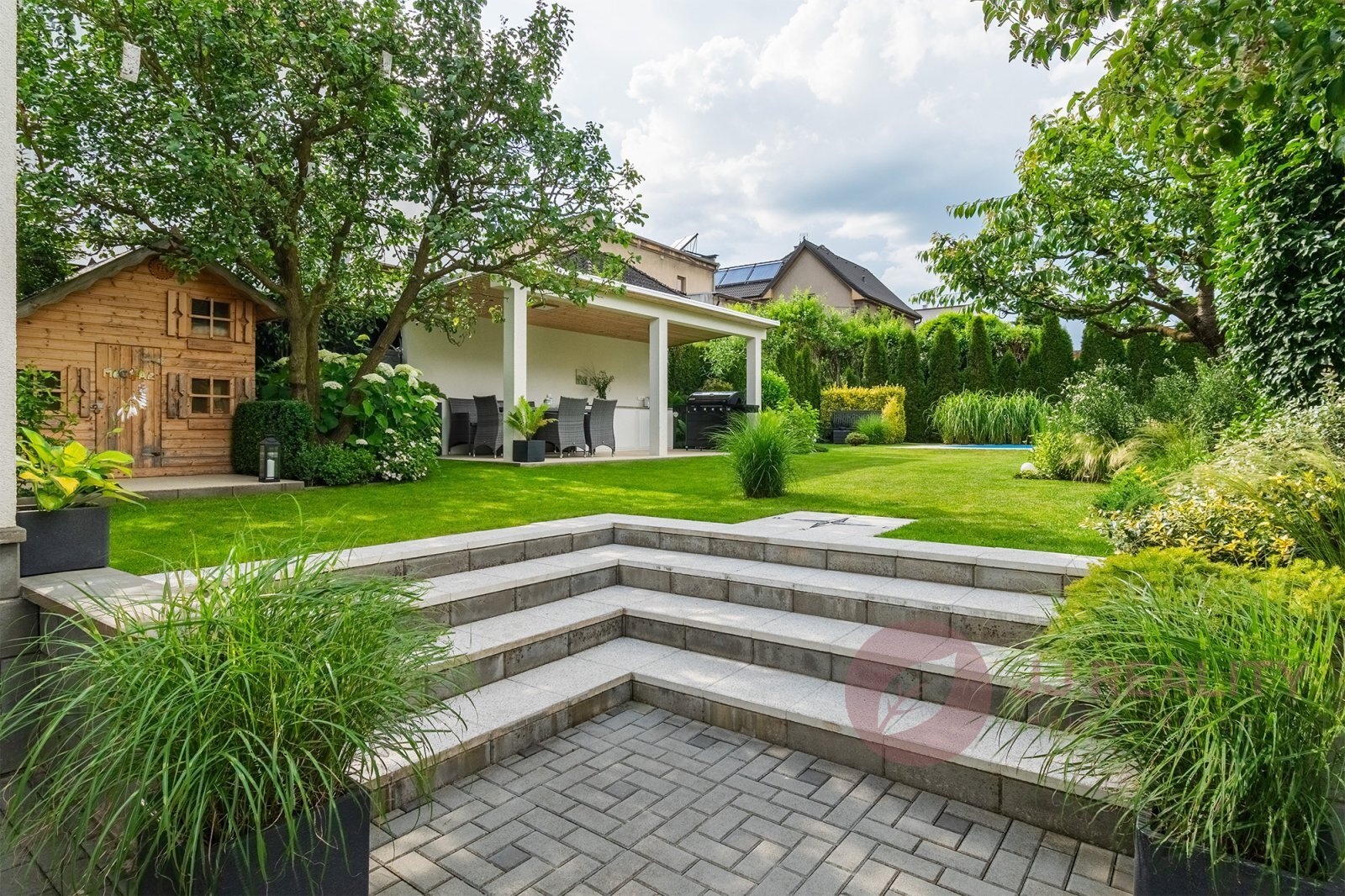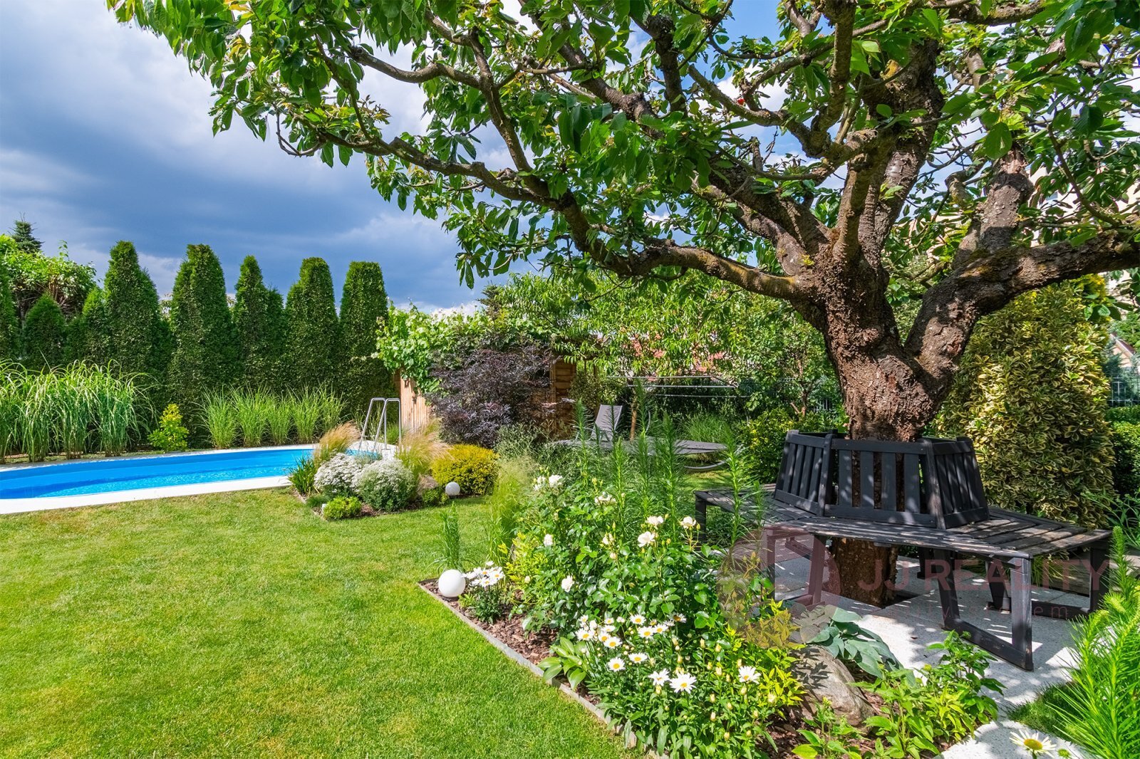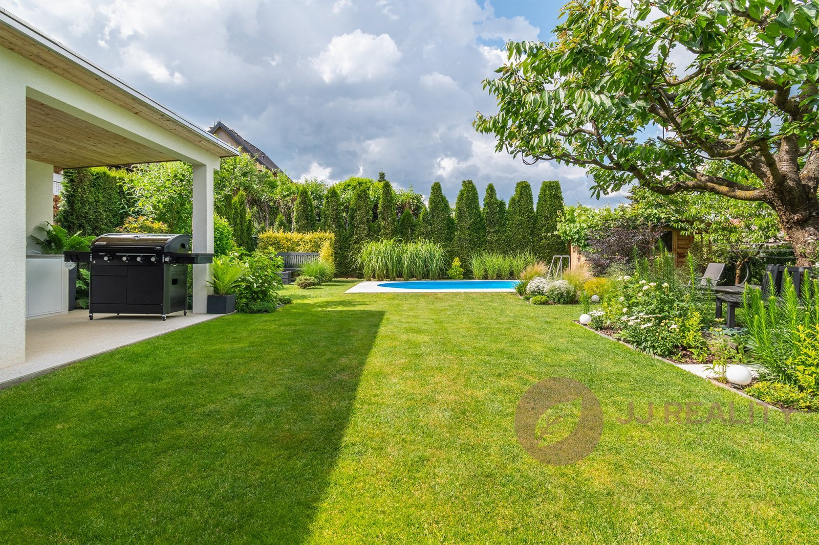 Před domem se rozprostírá malebná užitková zahrádka se skleníkem, zatímco za domem čeká překrásná rovinatá zahrada o rozloze 426 m² se zapuštěným bazénem a zahradním domkem.Na zahradě najdete také prostorné zastřešené posezení s vestavěnou venkovní kuchyní a zvukem vodopádu, který dodává zahradě kouzelnou atmosféru.