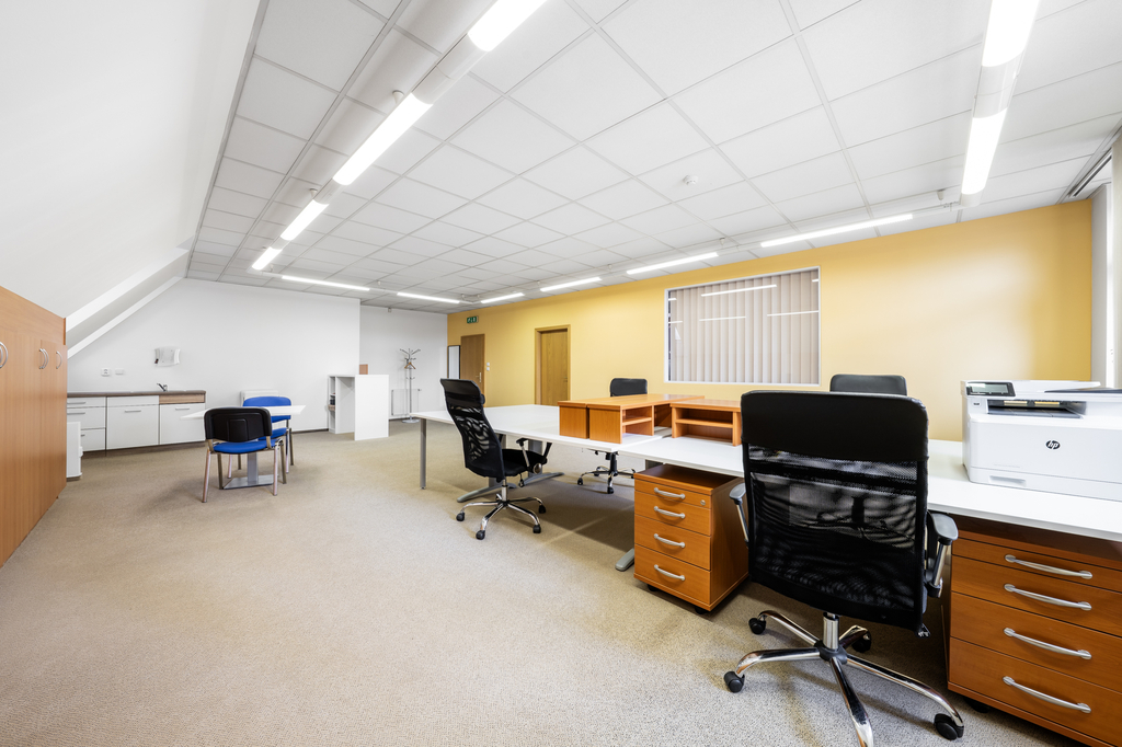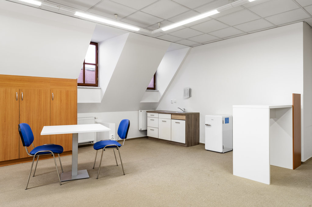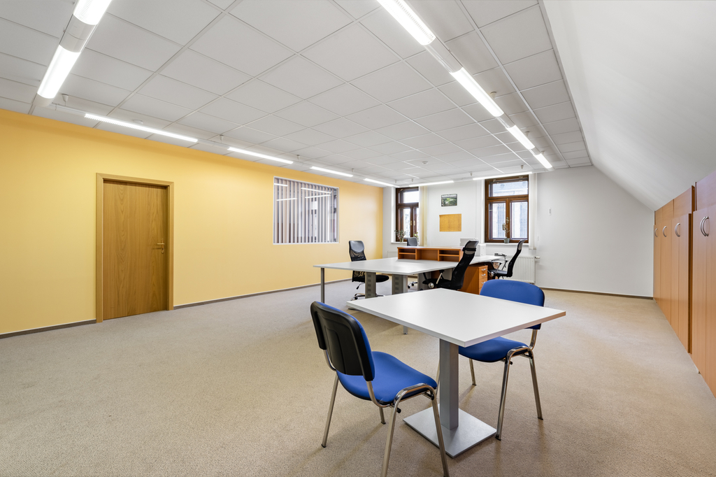 Jedná se o dvě místnosti s krásným výhledem na náměstí, vhodné jako reprezentativní kanceláře či prostory pro klientská jednání. Sociální zázemí (toalety) je přístupné z chodby s vnitřním schodištěm. Vytápění a ohřev vody je ústřední pro celý objekt. Internetové připojení zajišťuje optická síť CETIN, dostupní jsou také poskytovatelé O2, Vodafone, T-Mobile a další.