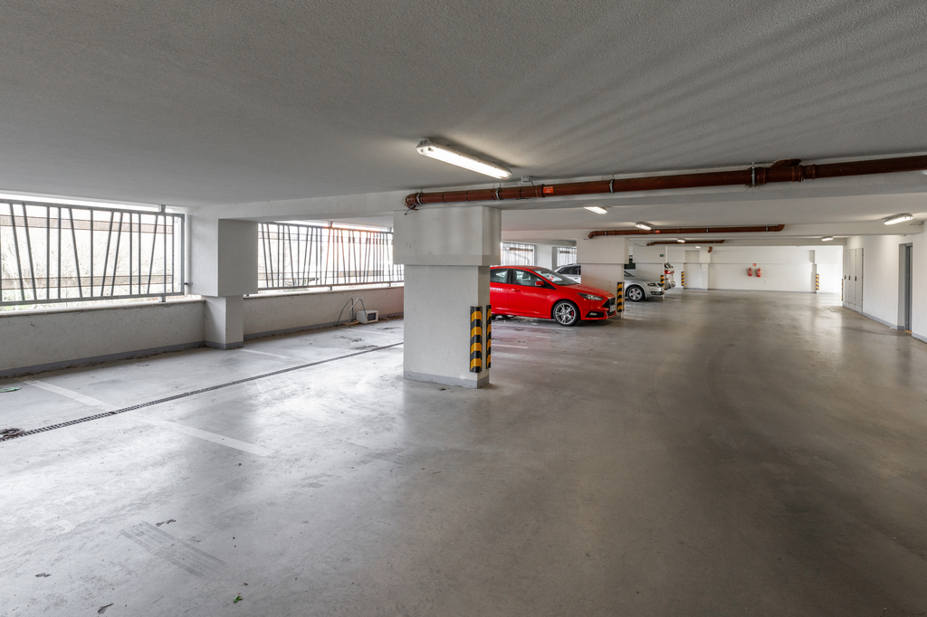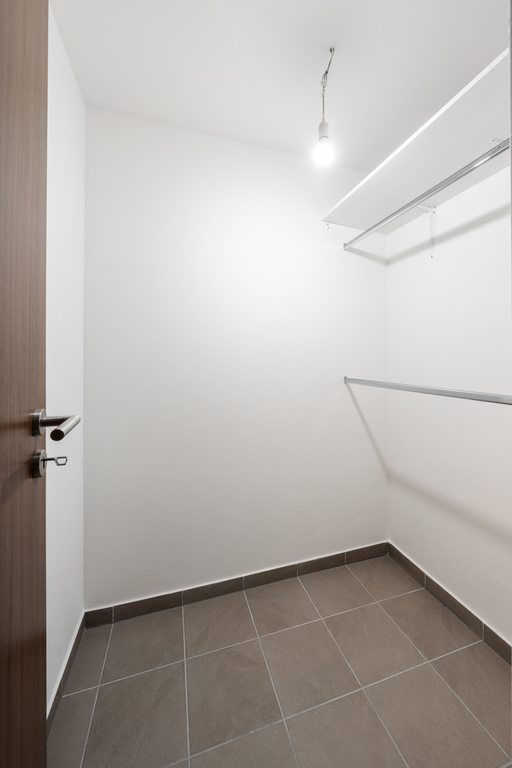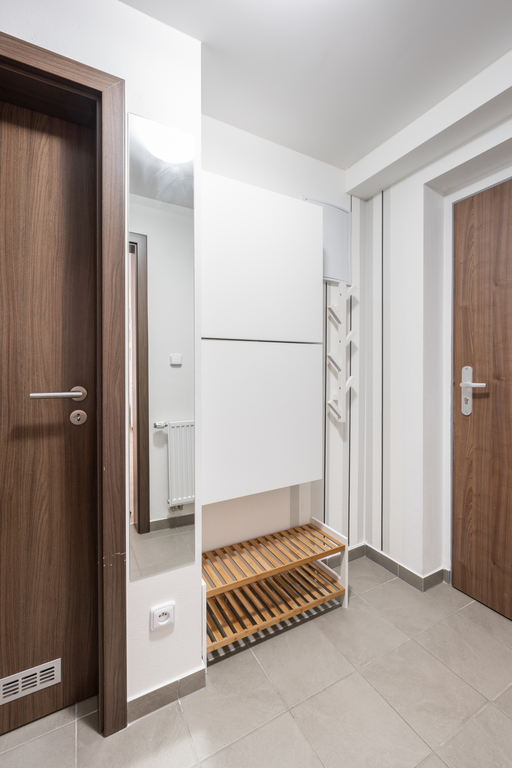 Dispozice zahrnuje pokoj s kuchyňským koutem, komoru, předsíň a koupelnu s toaletou. Balkon je přístupný z pokoje. K bytu kromě garážového parkovacího stání náleží také sklepní kóje (2 m2).