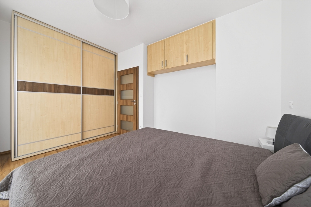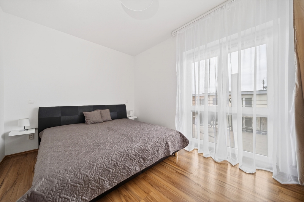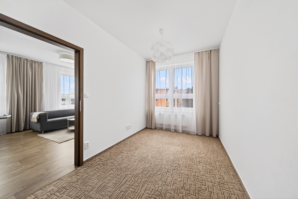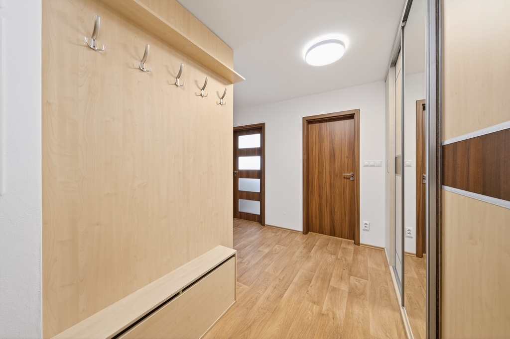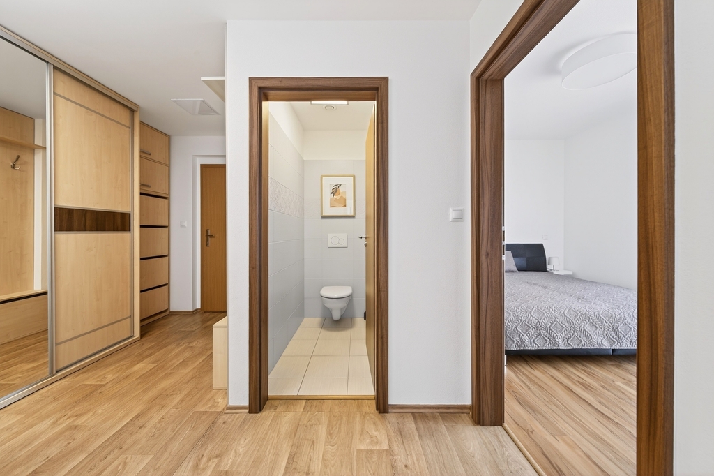 Dispozice bytu je velmi praktická. Ze vstupní předsíně vedou samostatné vstupy do obývacího pokoje s kuchyňským koutem, ložnice, koupelny i na oddělenou toaletu. Pouze samostatný pokoj je přístupný z obývacího pokoje s kuchyňským koutem. Z ložnice je přímý vstup na terasu.