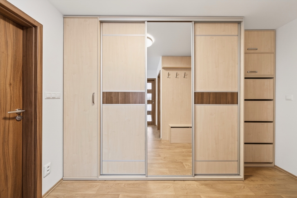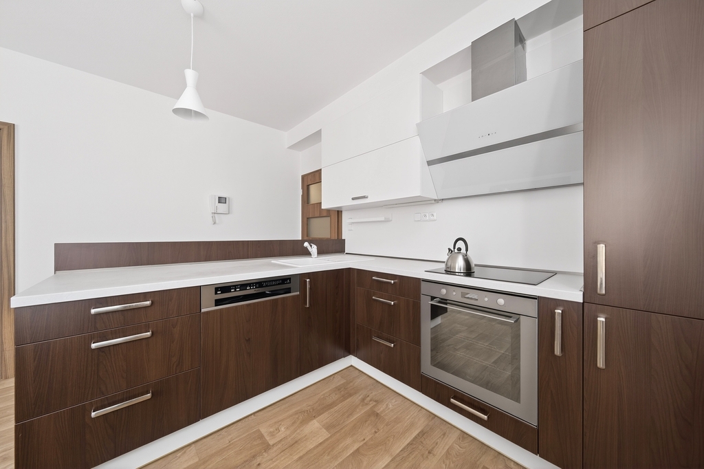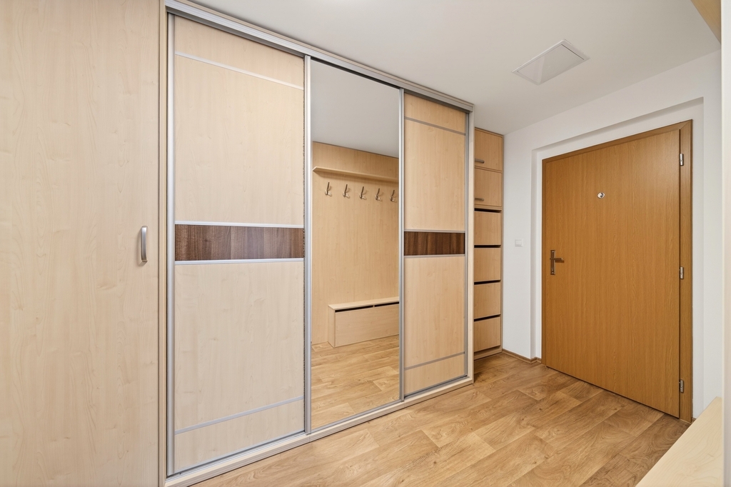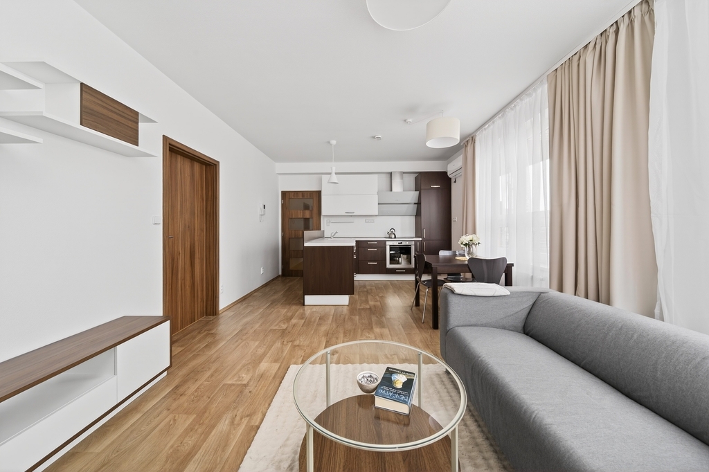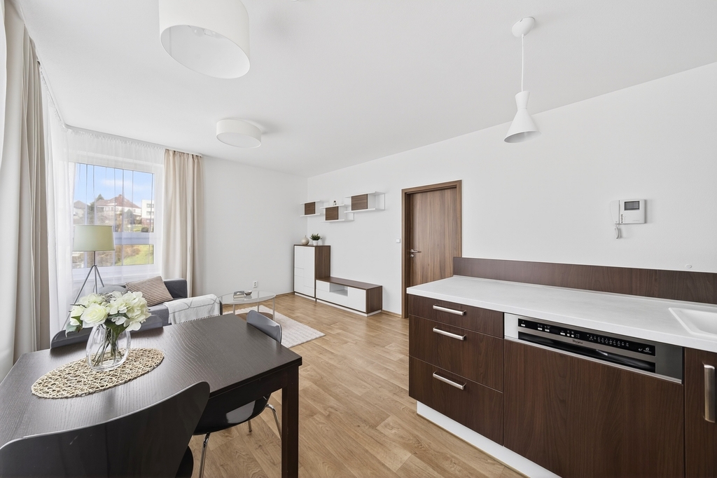 Byt je vybavený kuchyňskou linkou včetně vestavné elektrické trouby, varné desky, digestoře, myčky nádobí, ledničky a mrazáku. Dále je součástí vybavení jídelní stůl se židlemi, pohovka, konferenční stolek, obývací stěna, dvojlůžko (bez matrací), noční stolky, vestavěné skříně v ložnici i předsíni, samostatná skříň v pokoji, věšák, výklopný botník, pračka a venkovní posezení na terase. Samozřejmostí jsou také záclony, závěsy, koupelnový nábytek a kompletní osvětlení.