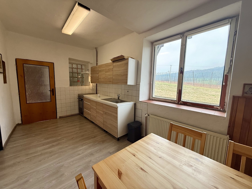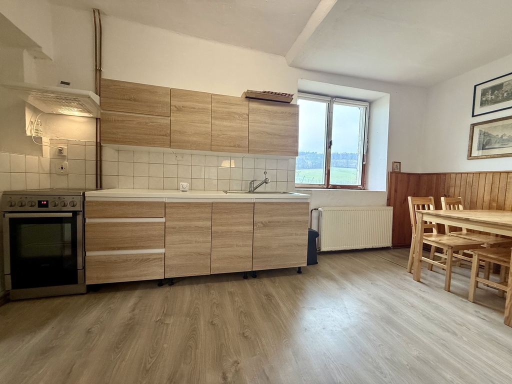 Kuchyně je vybavena horkovzdušnou troubou s 4 plotýnkovým vařičem, digestoří a dřezem.