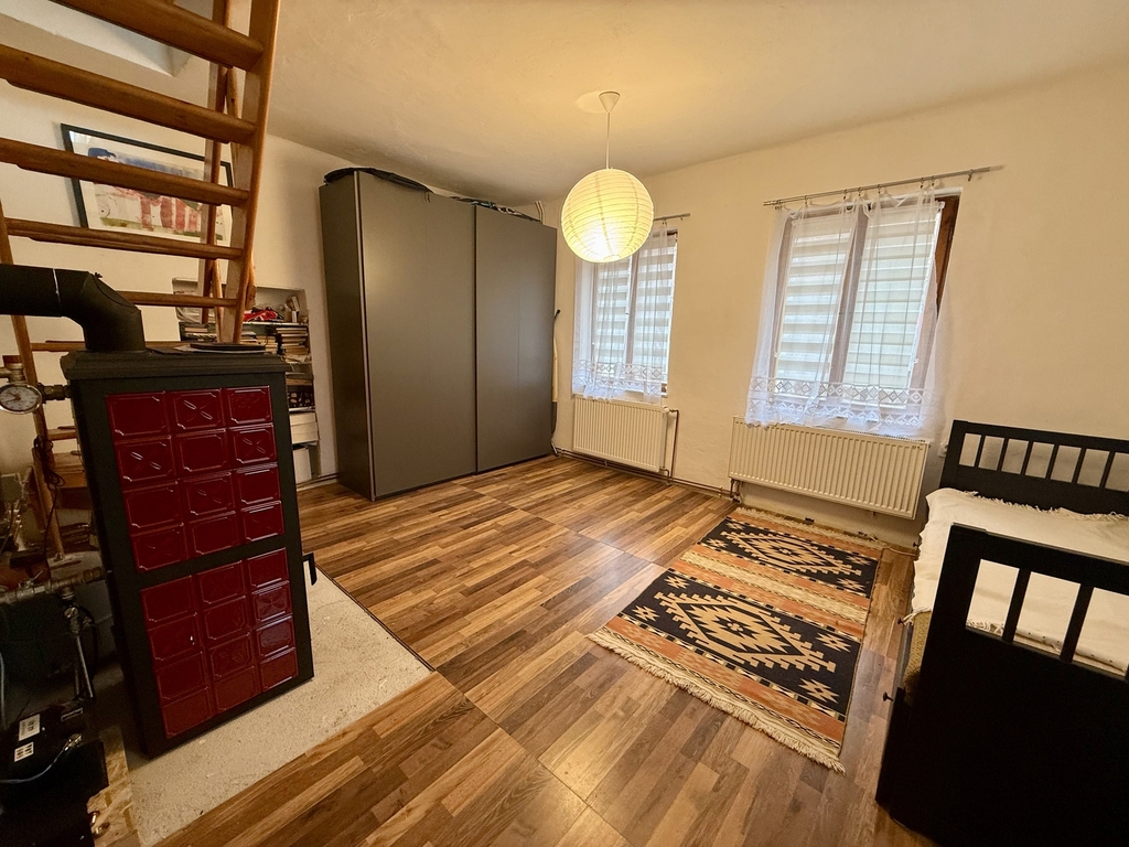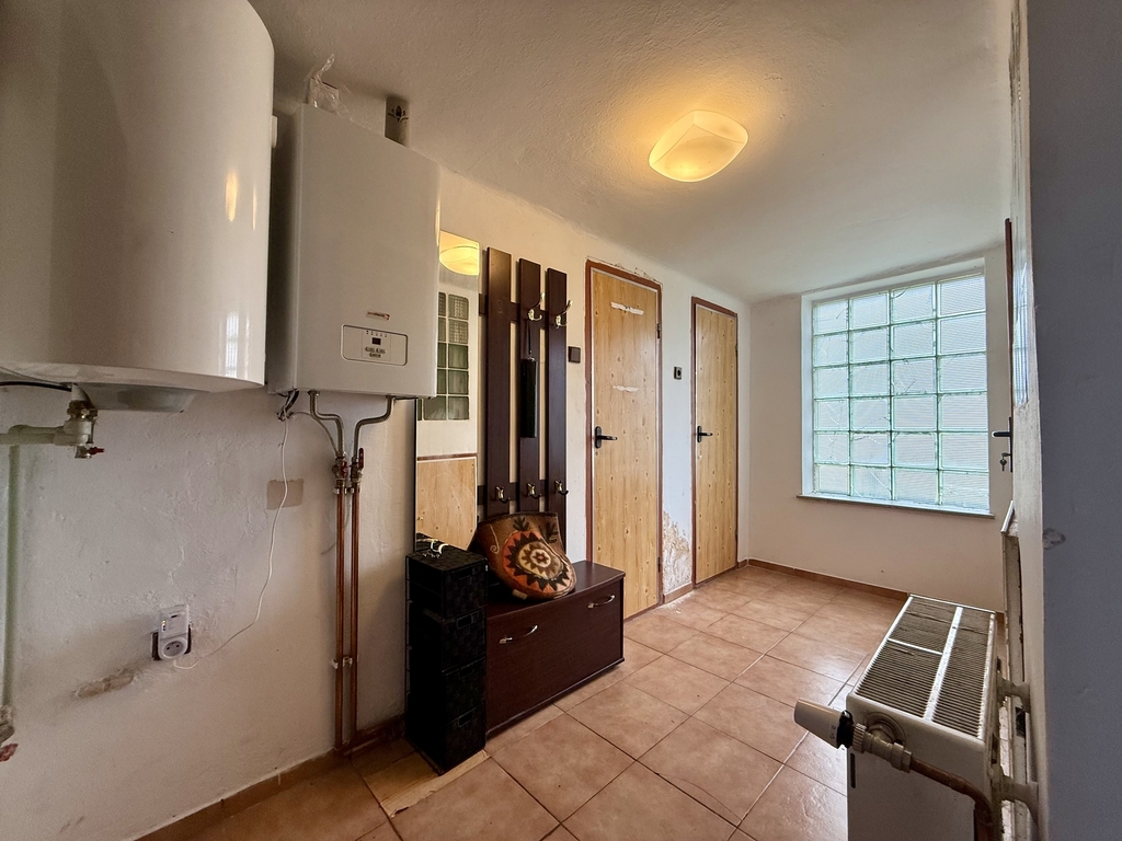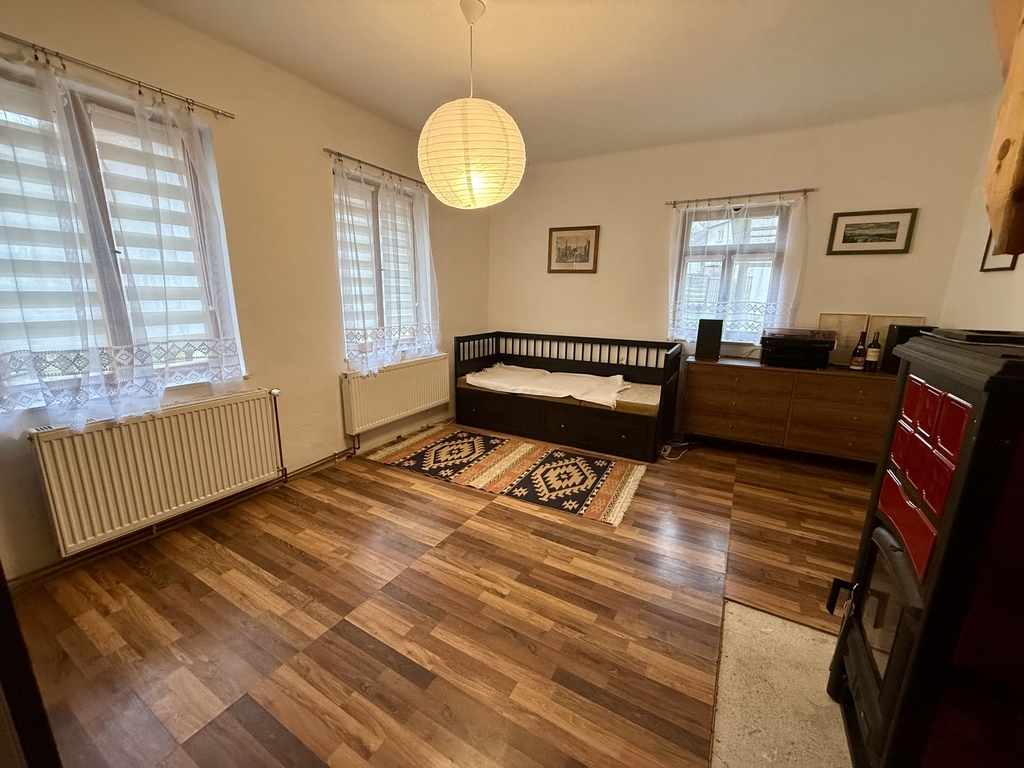 V obývacím pokoji se nachází nová krbová kamna - dům lze vytápět tuhým palivem a není třeba využívat druhou možnost, kterou je elektrický kotel.