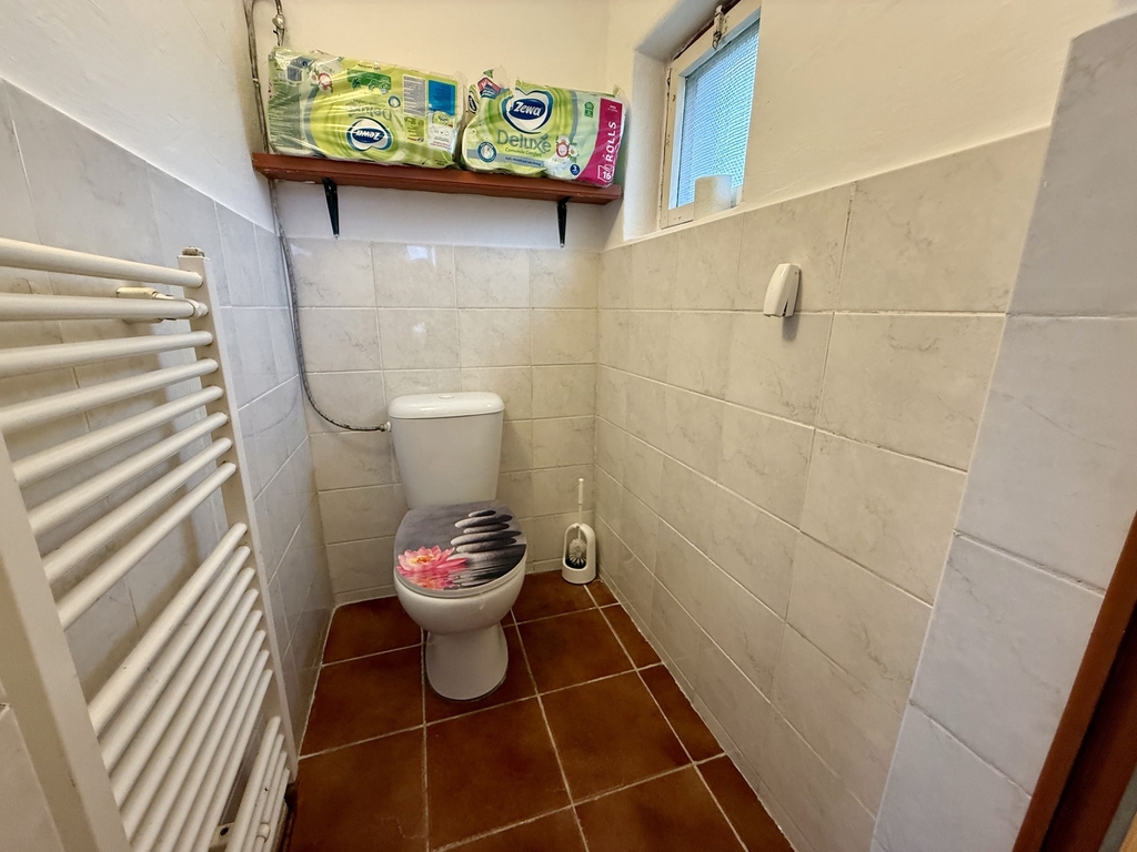 Domeček se dispozičně skládá z předsíně se samostatnou toaletou, koupelnou a vstupem do kuchyně.