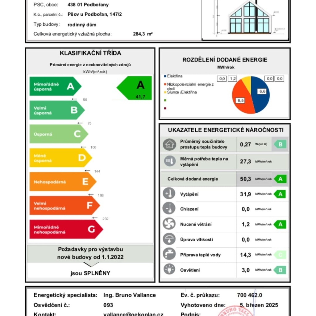 Budoucí PENB bude odpovídat hodnotám nízkoenergetického až pasivního domu třídy "A", což zaručuje nízké provozní náklady.