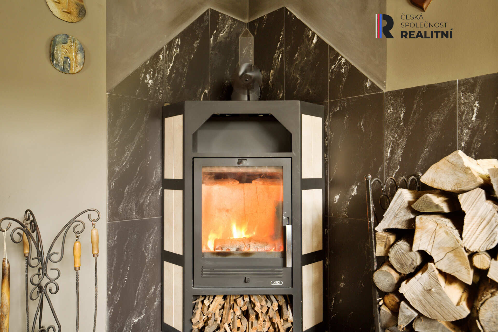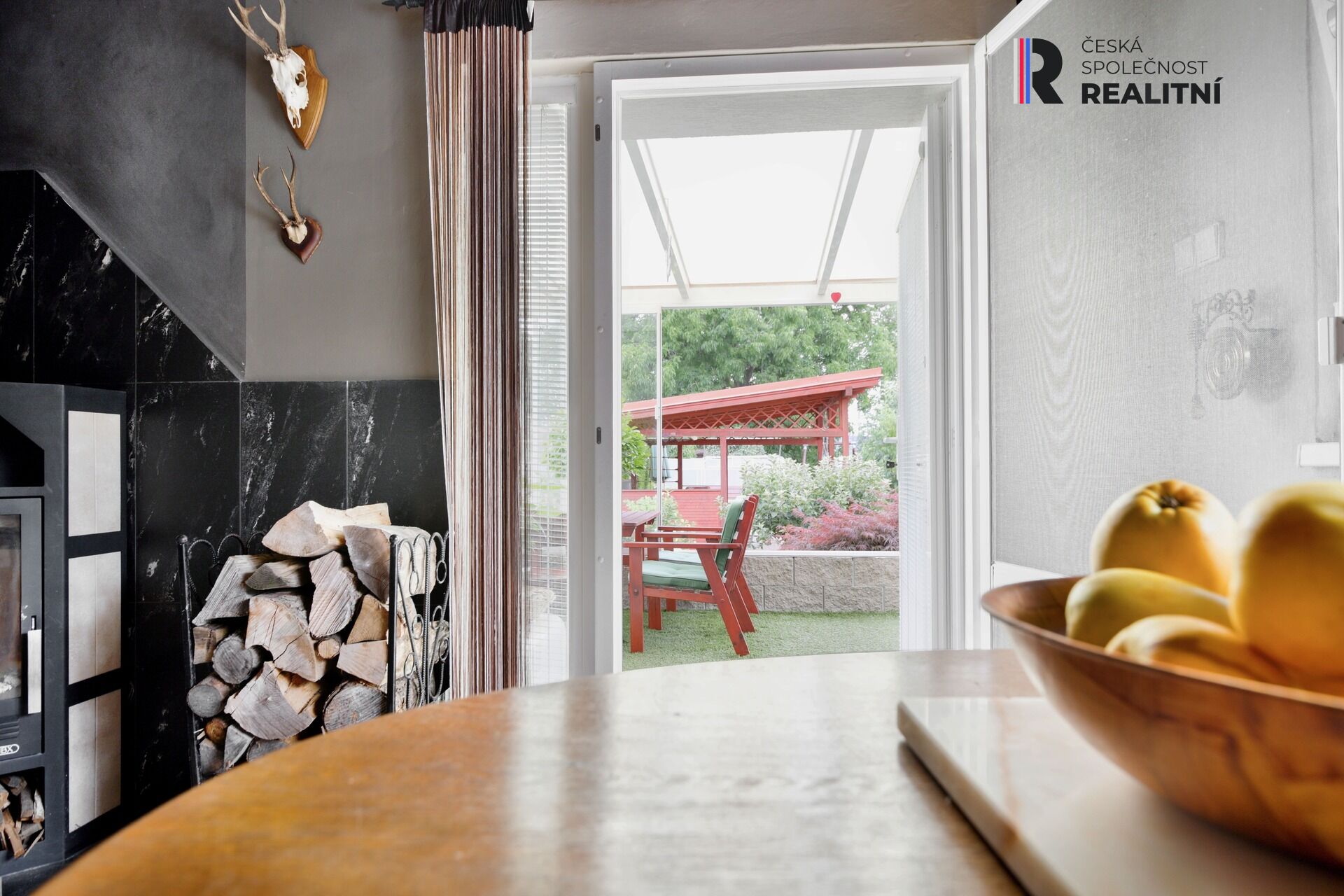 Přístavba: samostatná pracovna s krbem, vhodná a užívaná také jako pokoj pro hosty - přístupná z kuchyně či zimní zahradou.