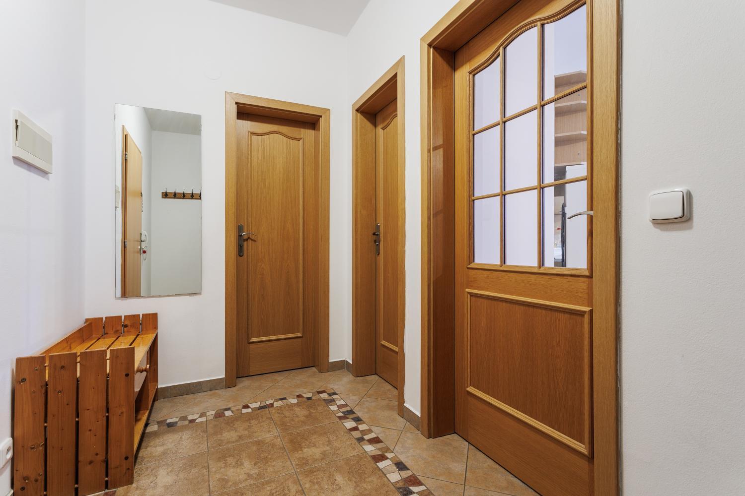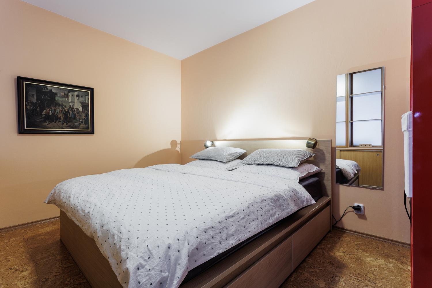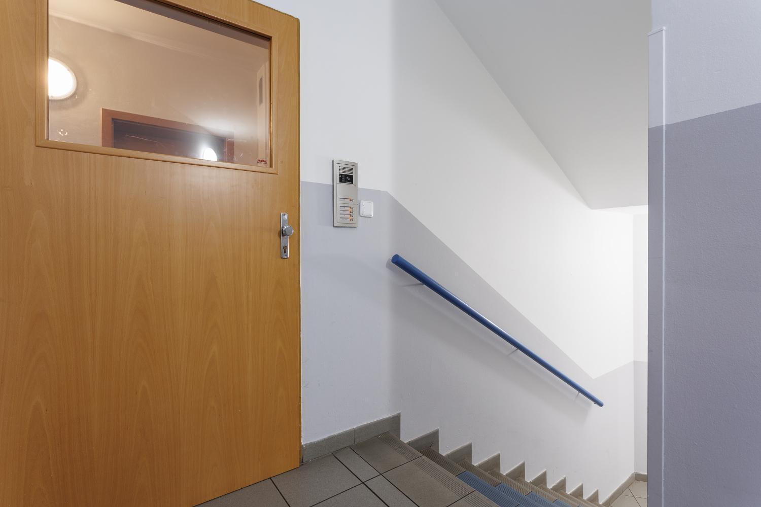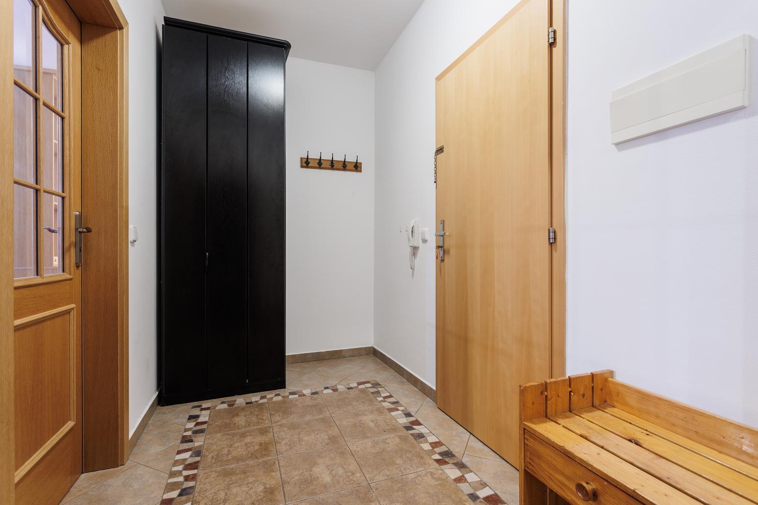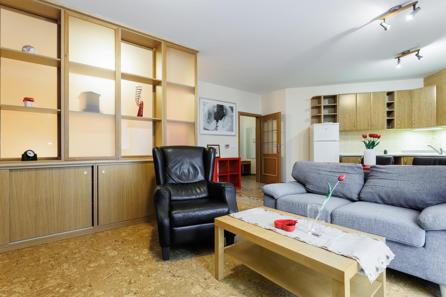 Byt se skládá z prostorné obytné místnosti s kuchyňským koutem, předsíně, koupelny s WC a komory. Hlavní místnost je prakticky rozdělena vestavěnou stěnou na denní a noční část, což zajišťuje pohodlné a funkční využití prostoru. Byt je orientován na jih do klidného vnitrobloku a je velmi světlý.