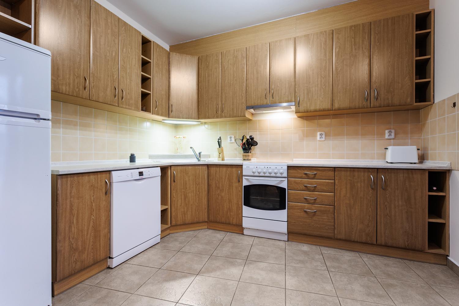 Kuchyňská linka vybavena elektrickým sporákem s troubou, digestoří a myčkou. Podlahové krytiny tvoří kombinace korku a keramické dlažby. Koupelna je obložena keramickým obkladem, vybavena sprchovým koutem, umyvadlem a WC. Vytápění a ohřev vody jsou řešeny centrálně. Vstup do domu i do společných prostor zajištěn čipovým systémem. Měsíční provozní náklady cca 2.100,-Kč (FO, teplo, voda, úklid, výtah, správa, ...). Parkování v rámci rezidenční zóny.