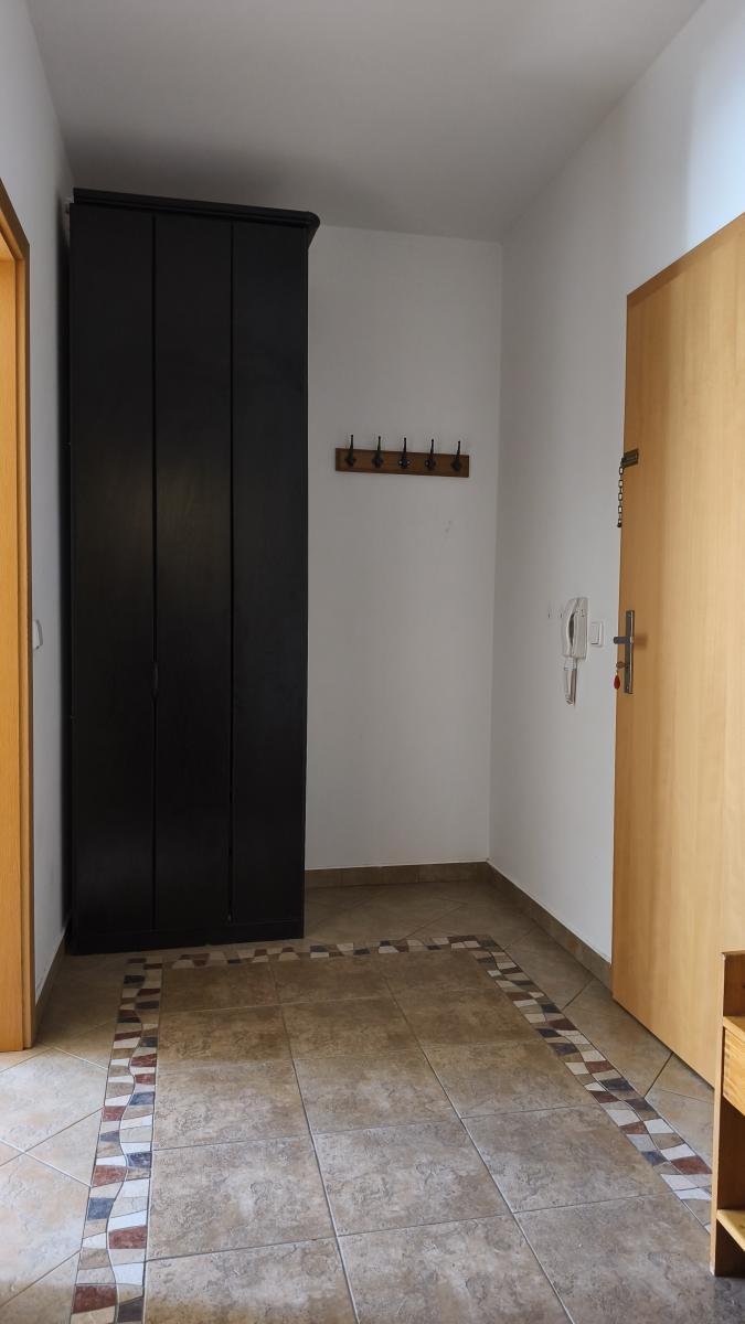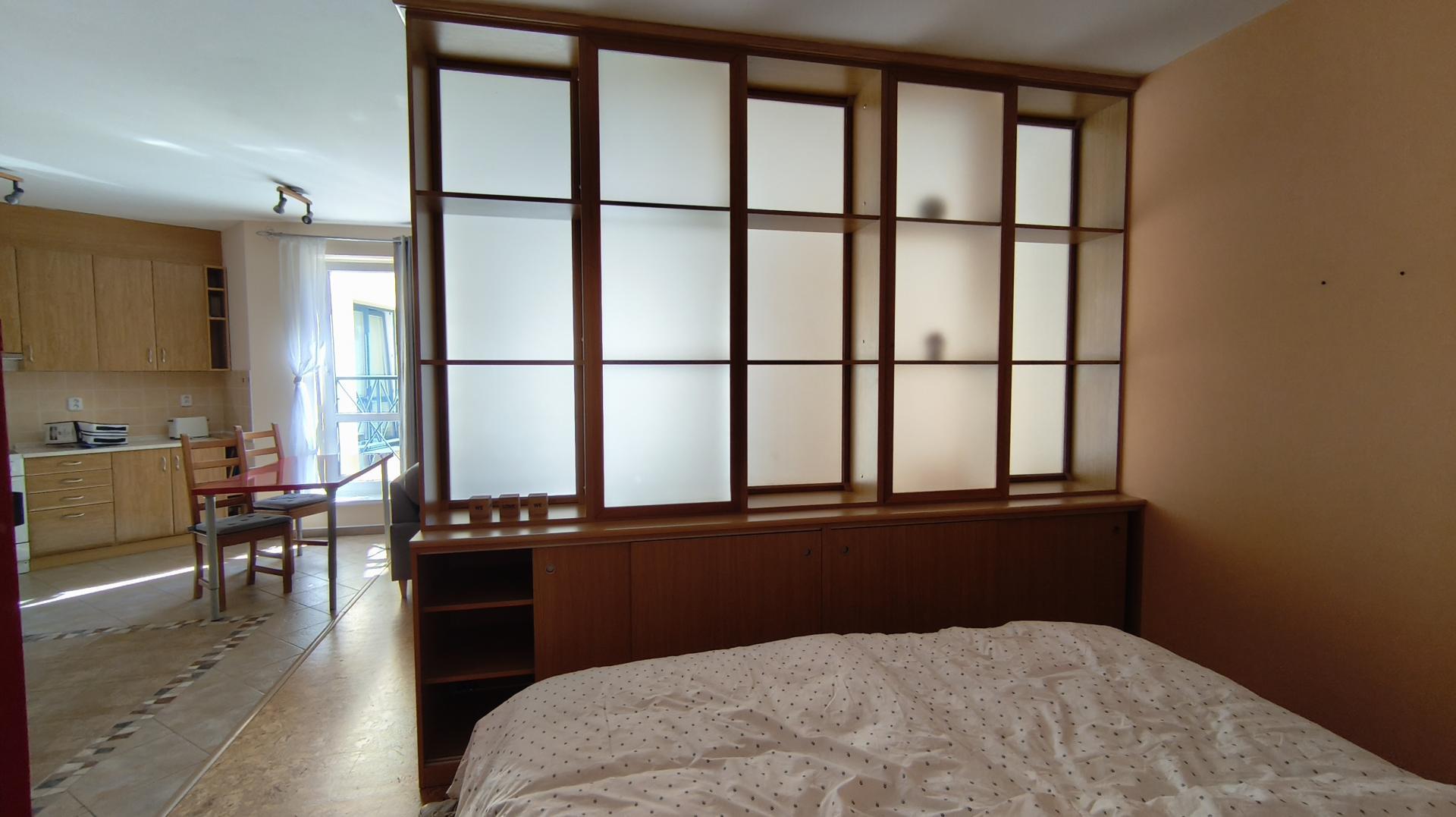Byt se skládá z prostorné obytné místnosti s kuchyňským koutem, předsíně, koupelny s WC a komory. Hlavní místnost je prakticky rozdělena vestavěnou stěnou na denní a noční část, což zajišťuje pohodlné a funkční využití prostoru. Byt je orientován na jih do klidného vnitrobloku a je velmi světlý.