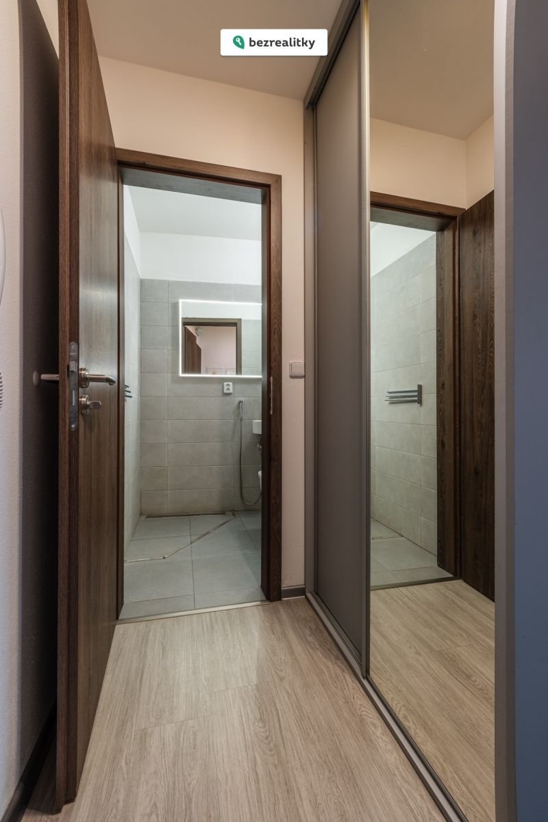 Do bytu se vstupuje přes menší chodbu s vestavěnou skříní se zrcadlem, odkud se jde buď na samostatné WC se sprchou např. pro mytí psa, nebo se pokračuje do prostorného obývacího pokoje s velkou kuchyňskou linkou vybavenou vestavěnými spotřebiči (lednice, indukční deska, trouba, mikrovlnná trouba, myčka, odsavač par).
