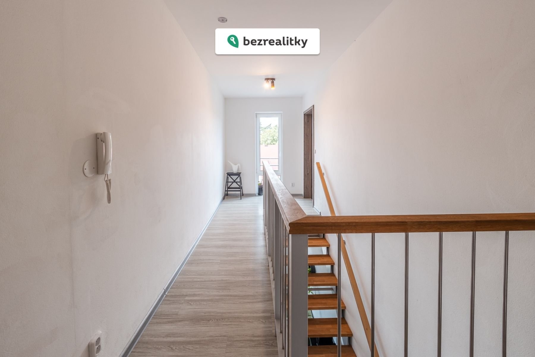 Z obývacího pokoje vedou dřevěné schody do druhého patra, kde je chodba, ve které lze u okna vybudovat např. pracovní koutek nebo koutek pro cvičení. Z chodby se pokračuje do ložnice s velkou vestavěnou skříní se zrcadlem nebo do koupelny se sprchovým koutem, WC a plynovým kondenzačním kotlem.