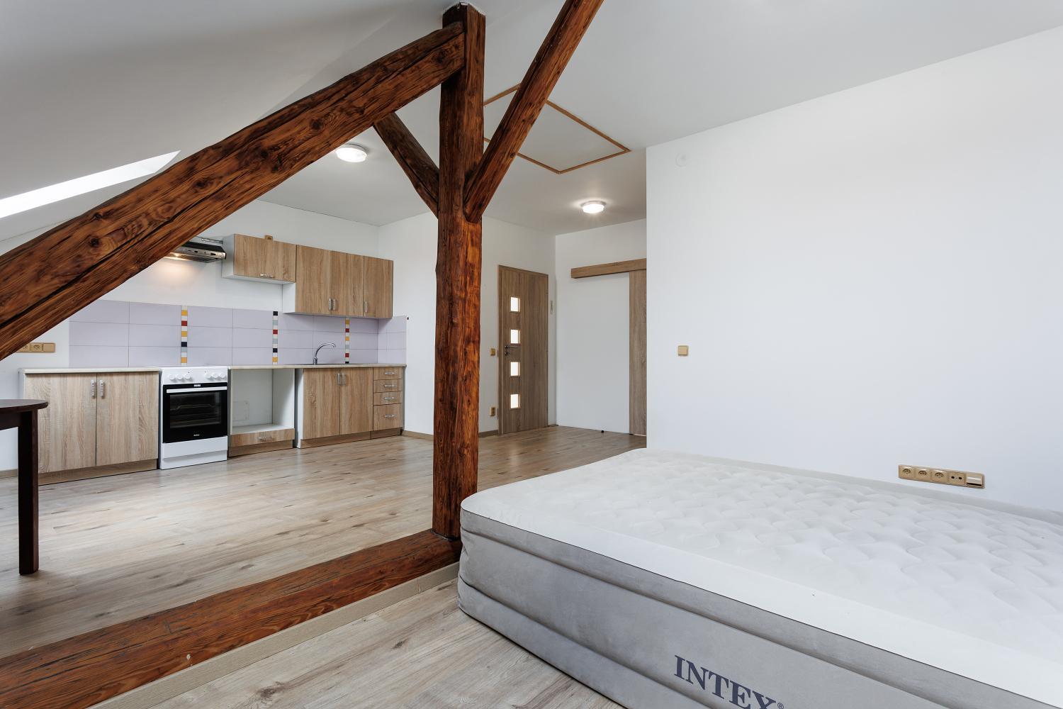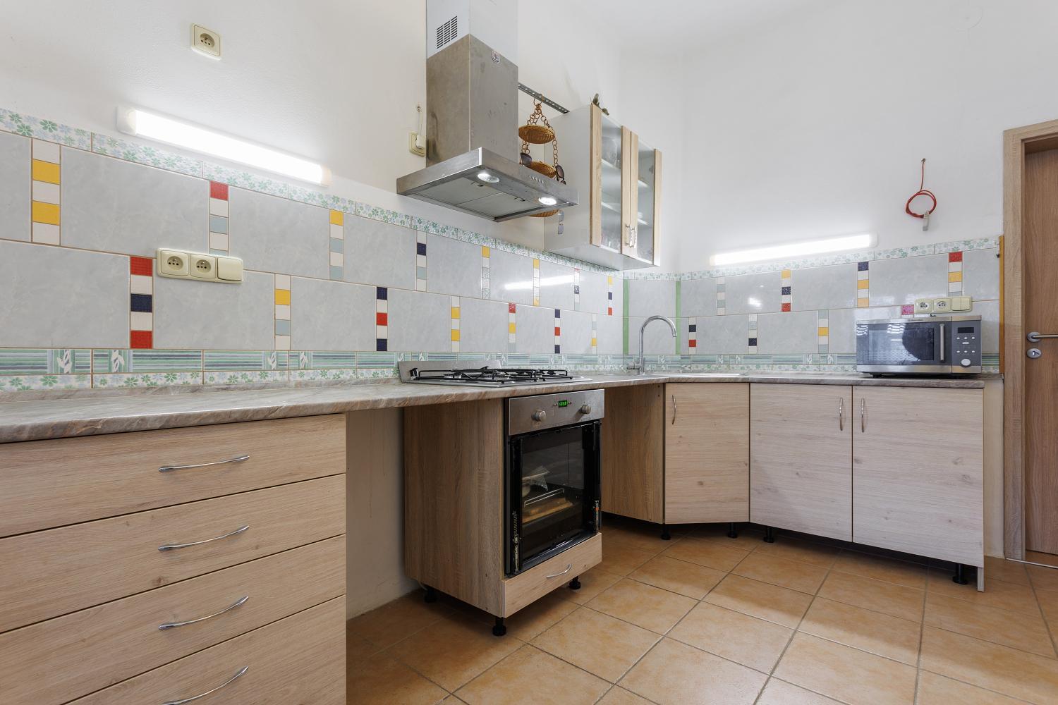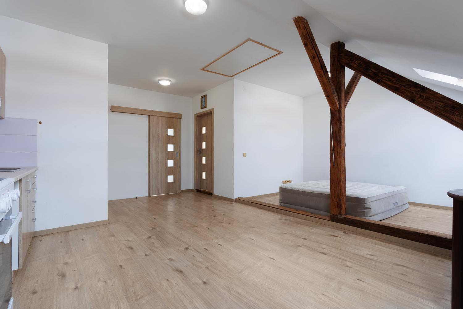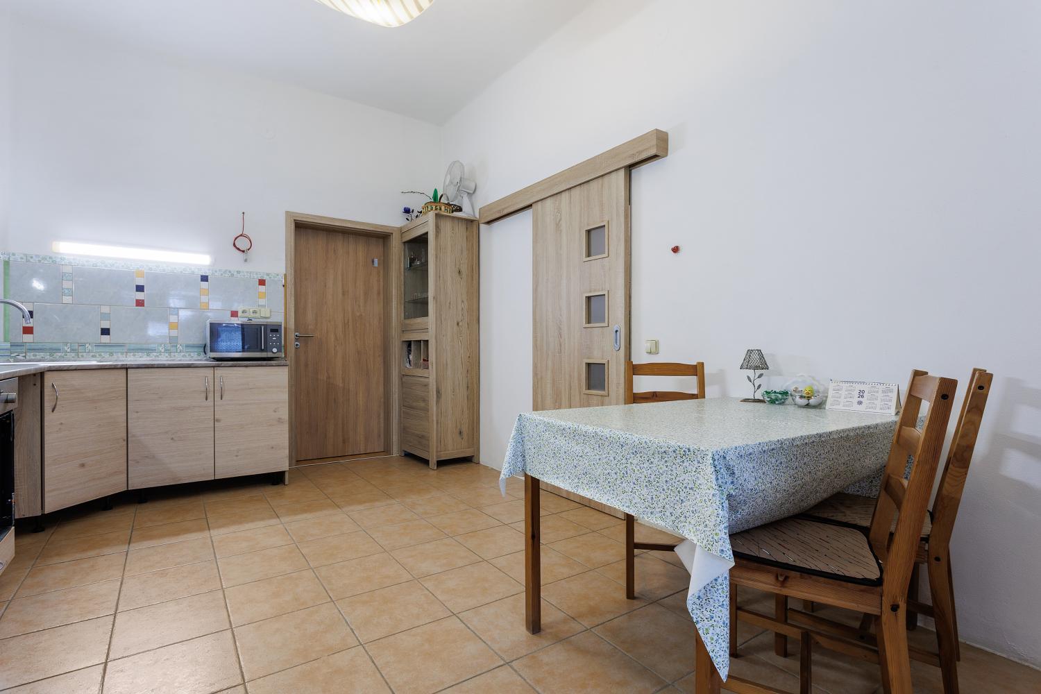 Vstup do domu z ulice, pokračuje chodbou, podél boční stěny domu, chodba prochází celým domem a z ní je vstup jednak do přízemní jednotky 2+kk halou propojenou s obytnou kuchyní. Dále jednotka obsahuje pokoj, koupelnu se sprchovacím koutem a WC, a má vstup do sklípku. Z chodby se vychází ven na terasu a dvorek. Z terasy vstup schodištěm do podkrovní jednotky 2+kk s koupelnou se sprchovacím koutem a WC. Za domem stojí hrubá stavba s novým krovem a krytinou a přípojkami sítí pro případný prostor k podnikání, k pronajímání nebo jako kancelář, wellness, apod. Plocha přízemí 72,7 m2 vč. chodby, plocha podkroví 65,3 m2 vč. malé střešní terasy a schodiště. Ústřední topení s plynovým kotlem, ohřev vody bojlerem. PENB třída C