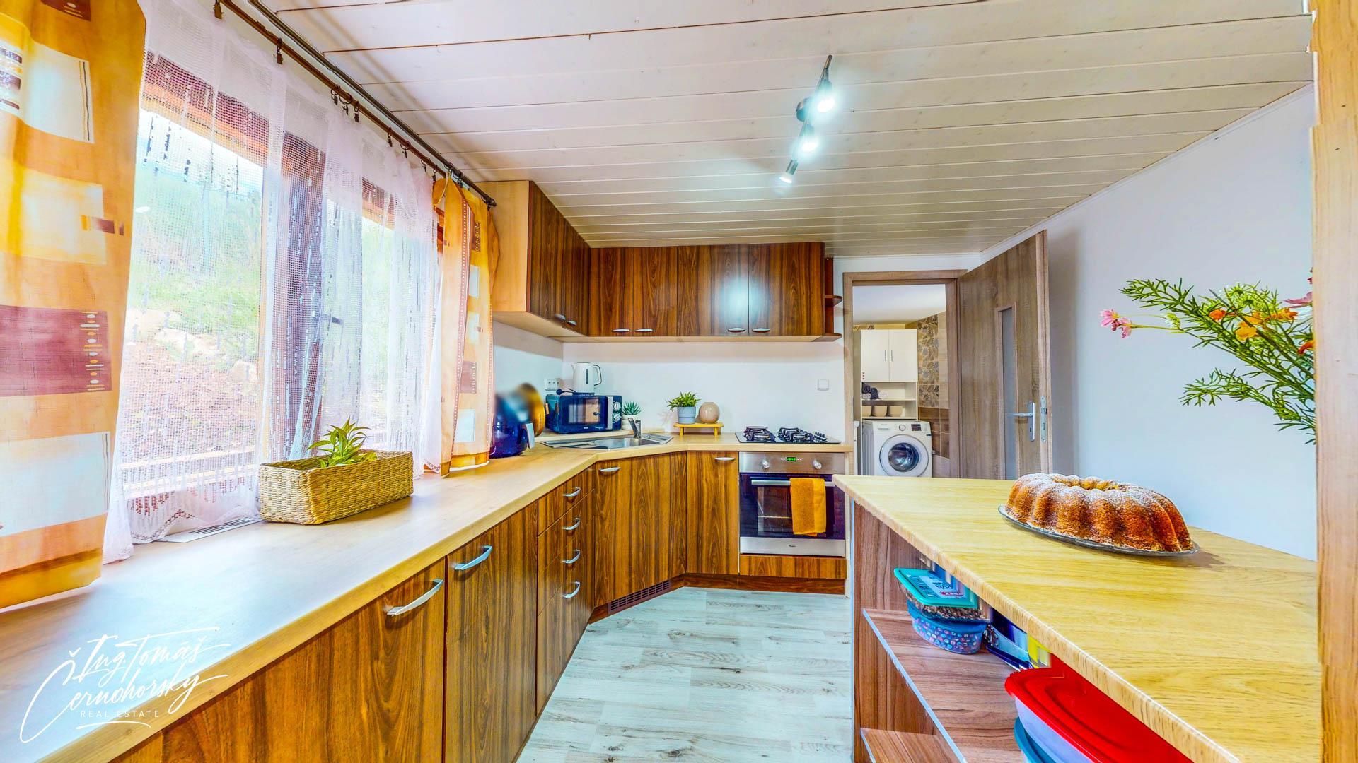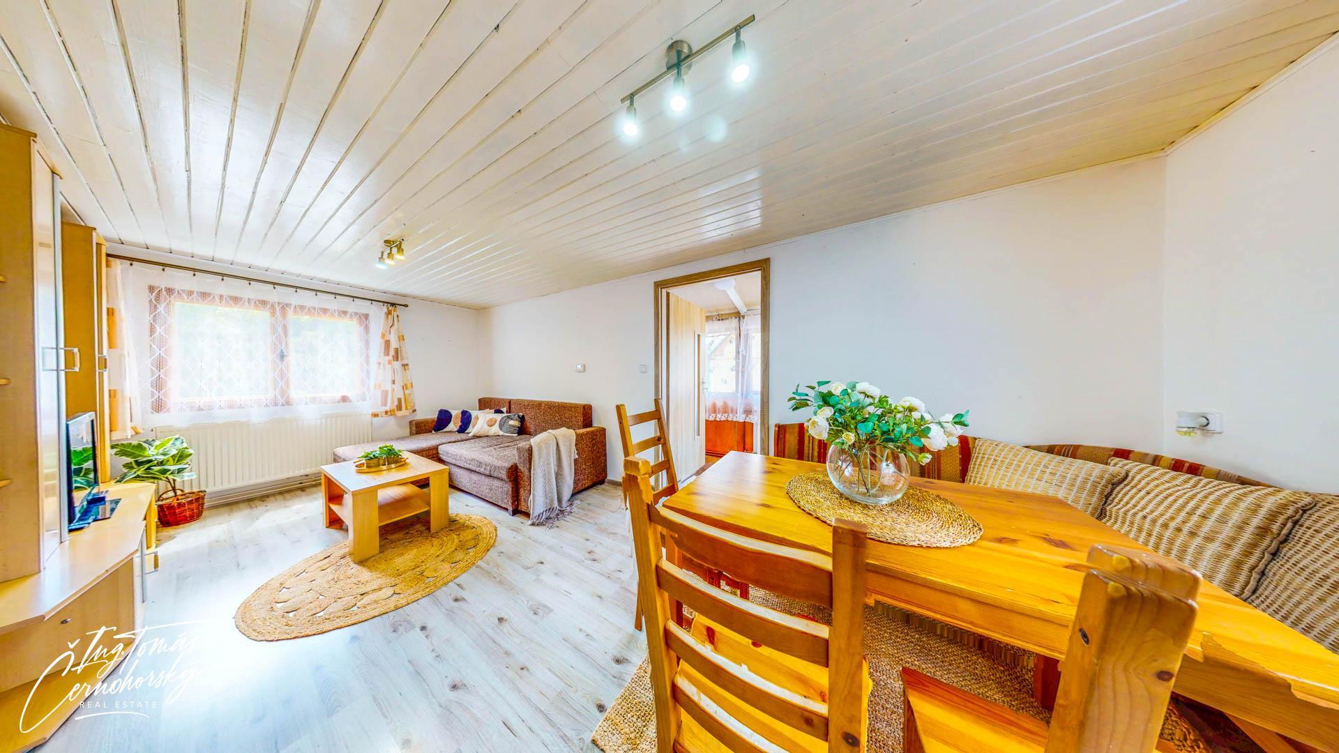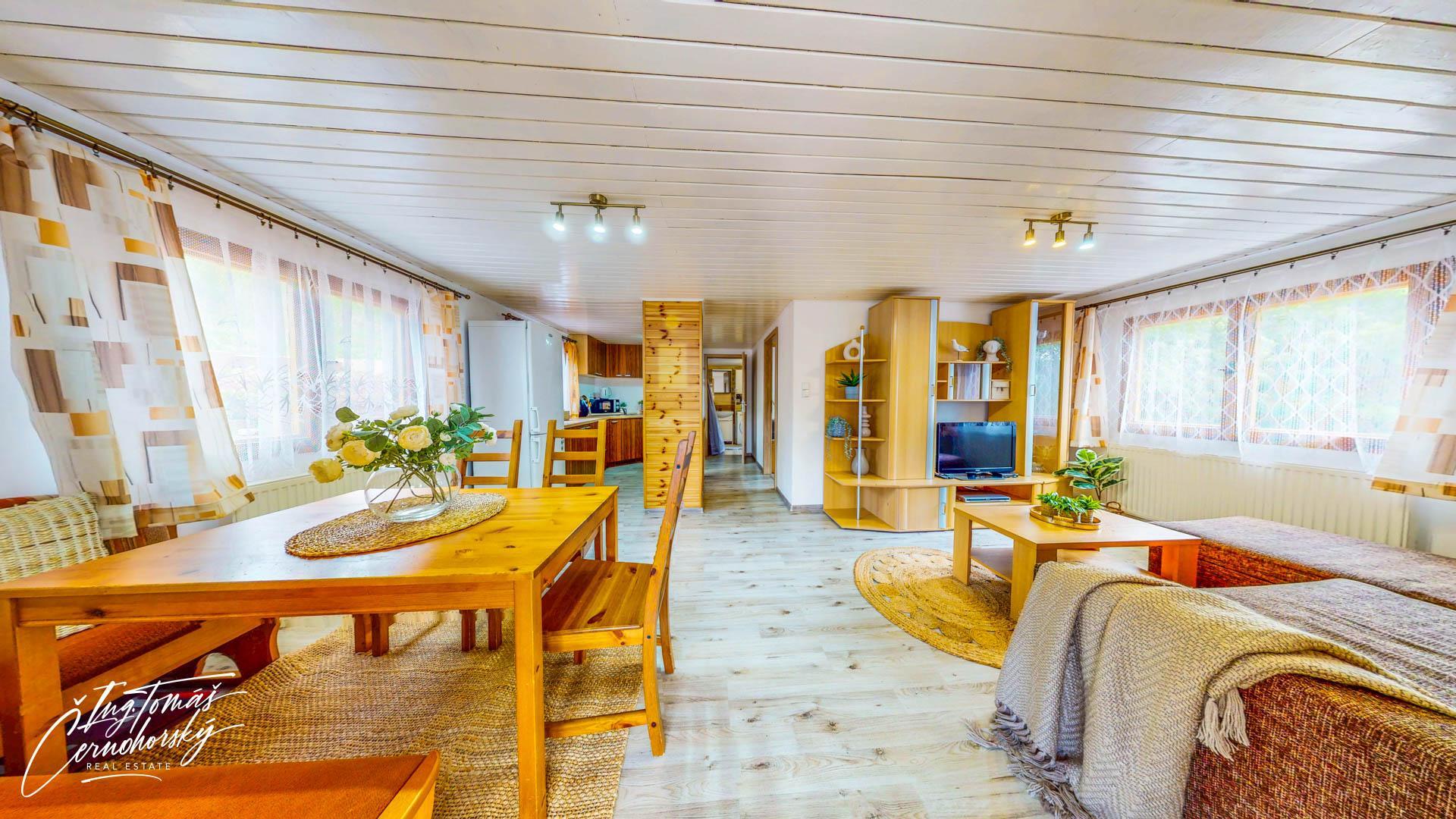 Obě stavby jsou napojené na obecní vodovod i kanalizaci a vytápění zajišťuje moderní tepelné čerpadlo, které efektivně obsluhuje dům i chatu a umožňuje úsporný provoz po celý rok. V přízemí hlavního domu se nachází světlý obývací pokoj s přímým vstupem na terasu, kuchyně s jídelním koutem, koupelna, technická místnost a vstupní chodba. V patře jsou dvě samostatné ložnice.