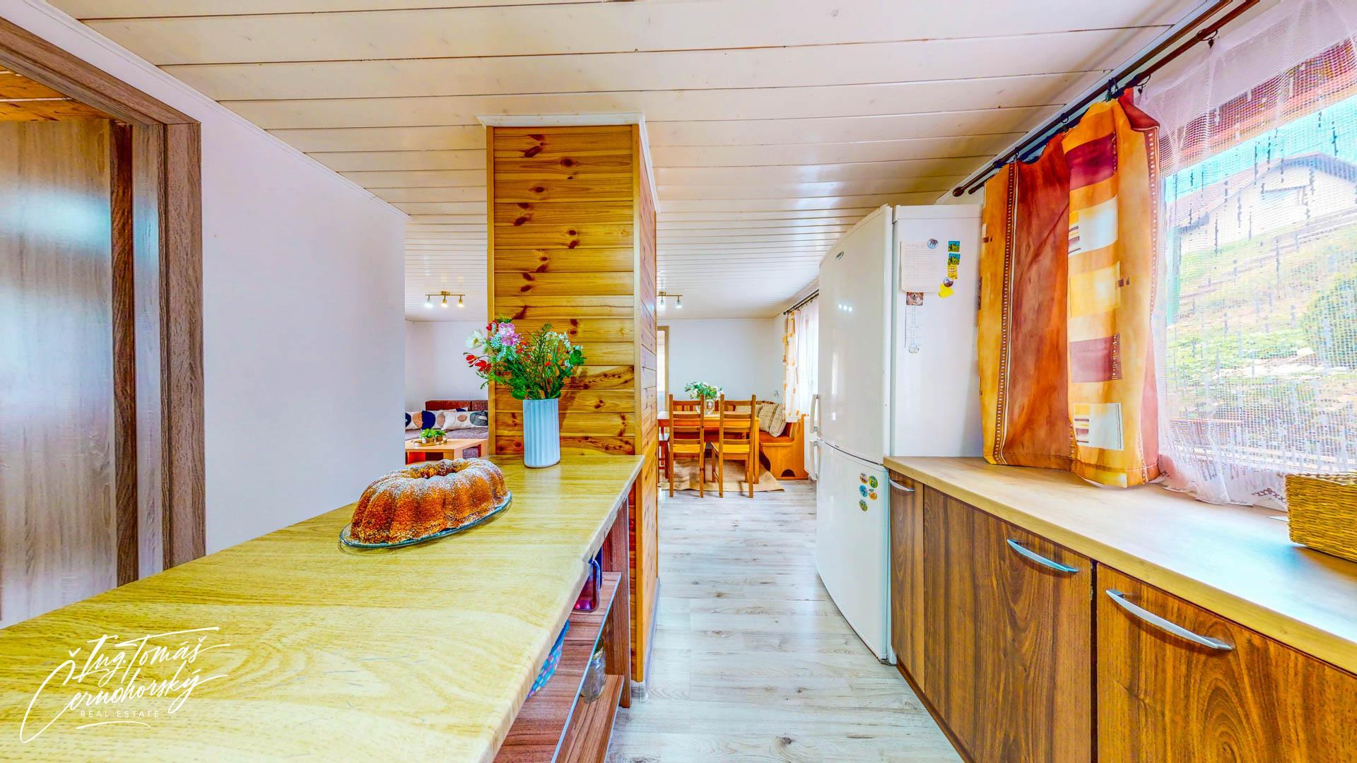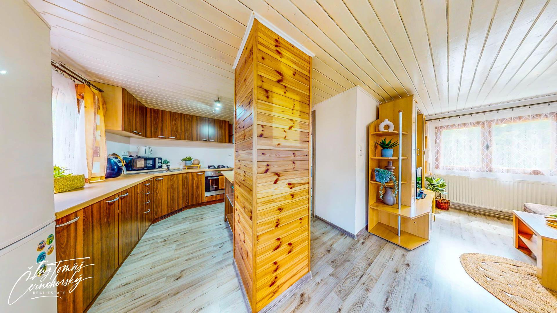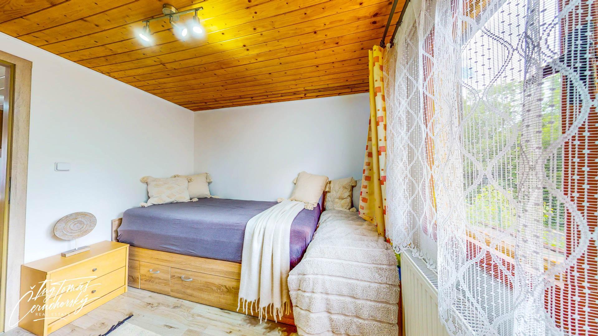 Obě stavby jsou napojené na obecní vodovod i kanalizaci a vytápění zajišťuje moderní tepelné čerpadlo, které efektivně obsluhuje dům i chatu a umožňuje úsporný provoz po celý rok. V přízemí hlavního domu se nachází světlý obývací pokoj s přímým vstupem na terasu, kuchyně s jídelním koutem, koupelna, technická místnost a vstupní chodba. V patře jsou dvě samostatné ložnice.